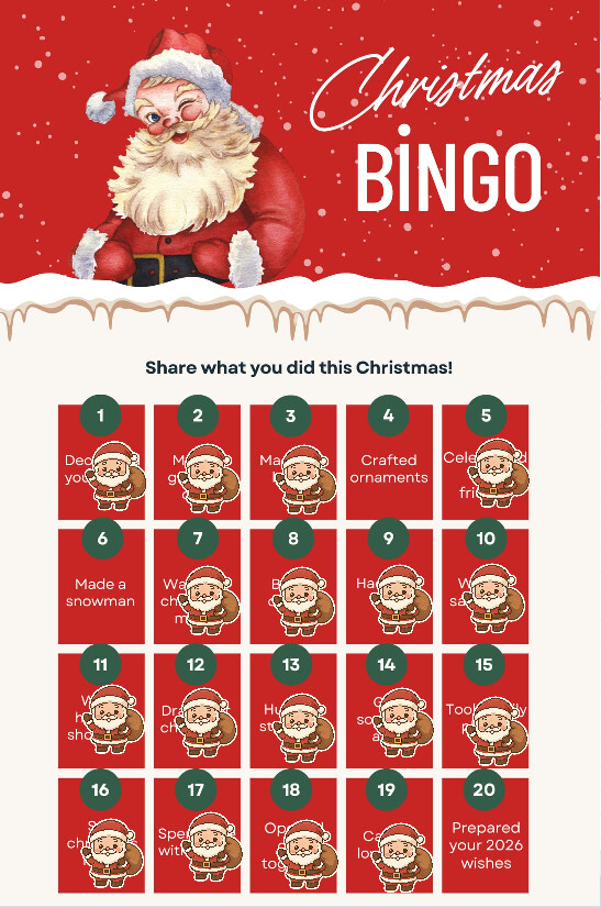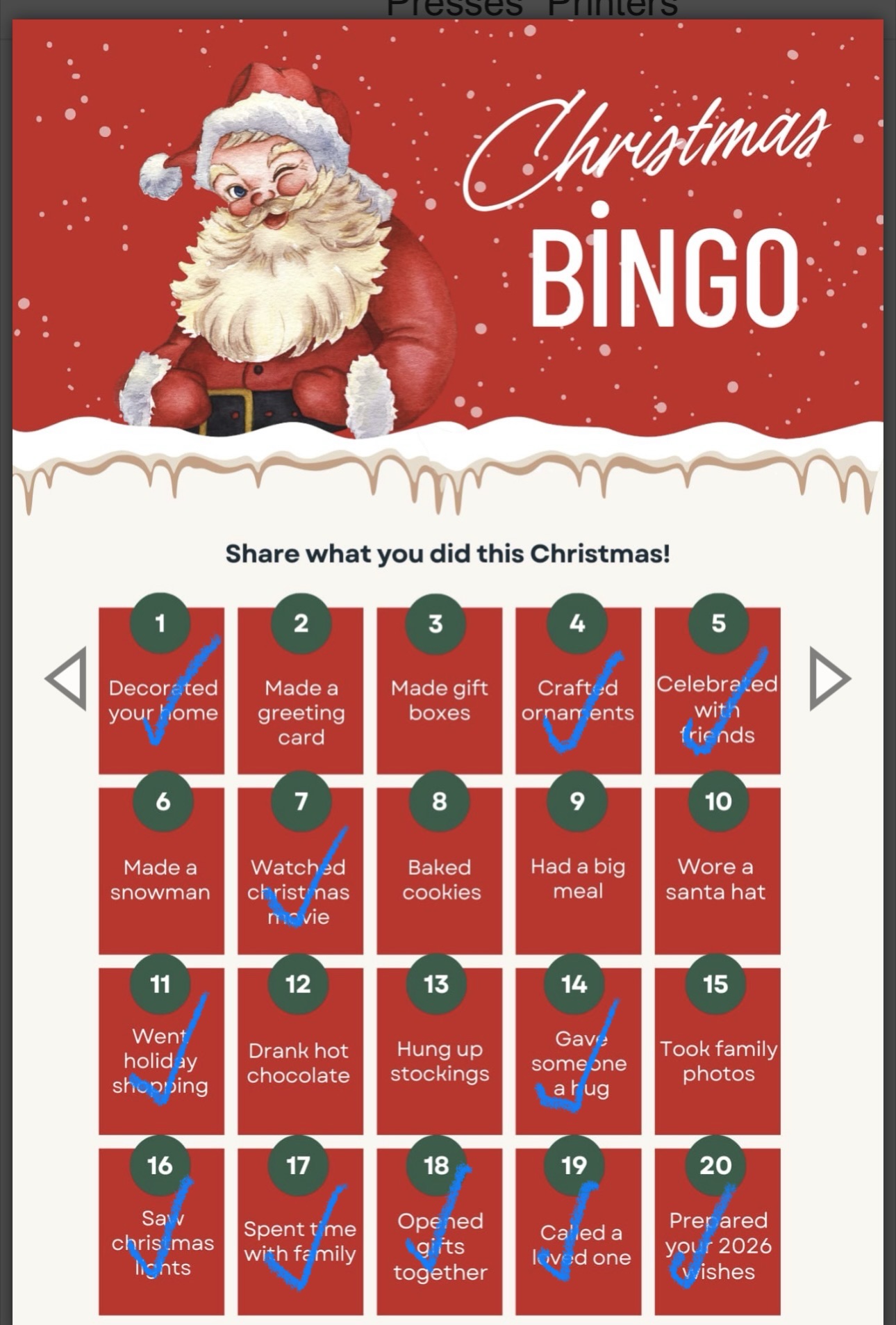 This is my bingo card. This was such a nice activity because it really showed me how much I really got to enjoy this Christmas.