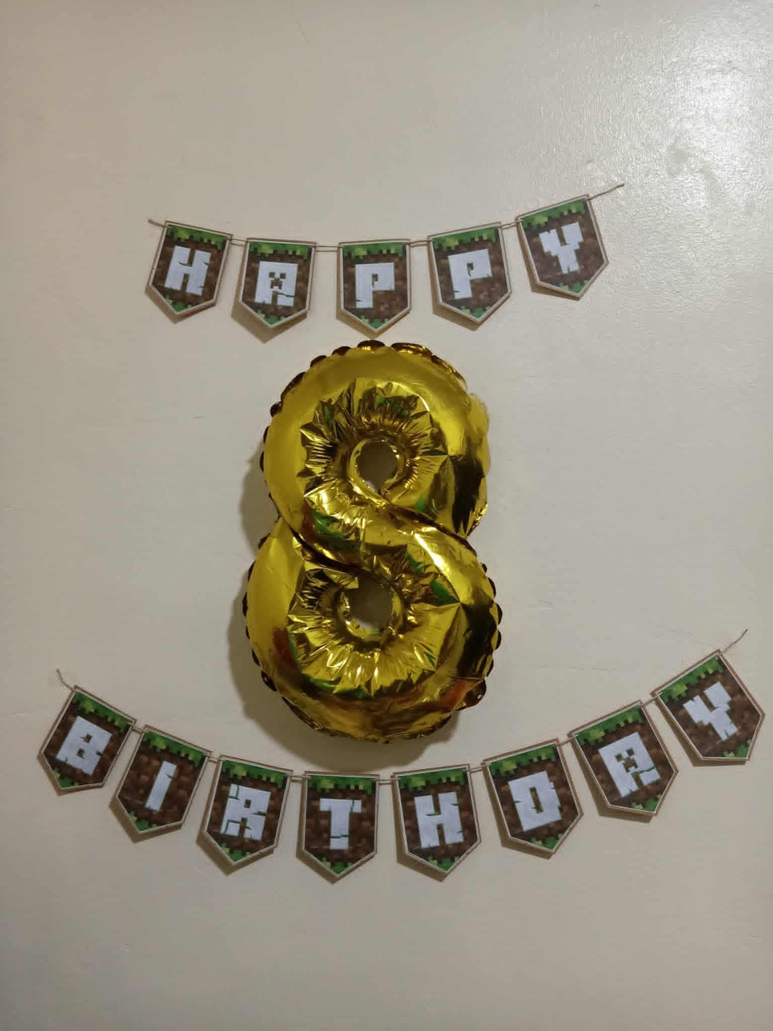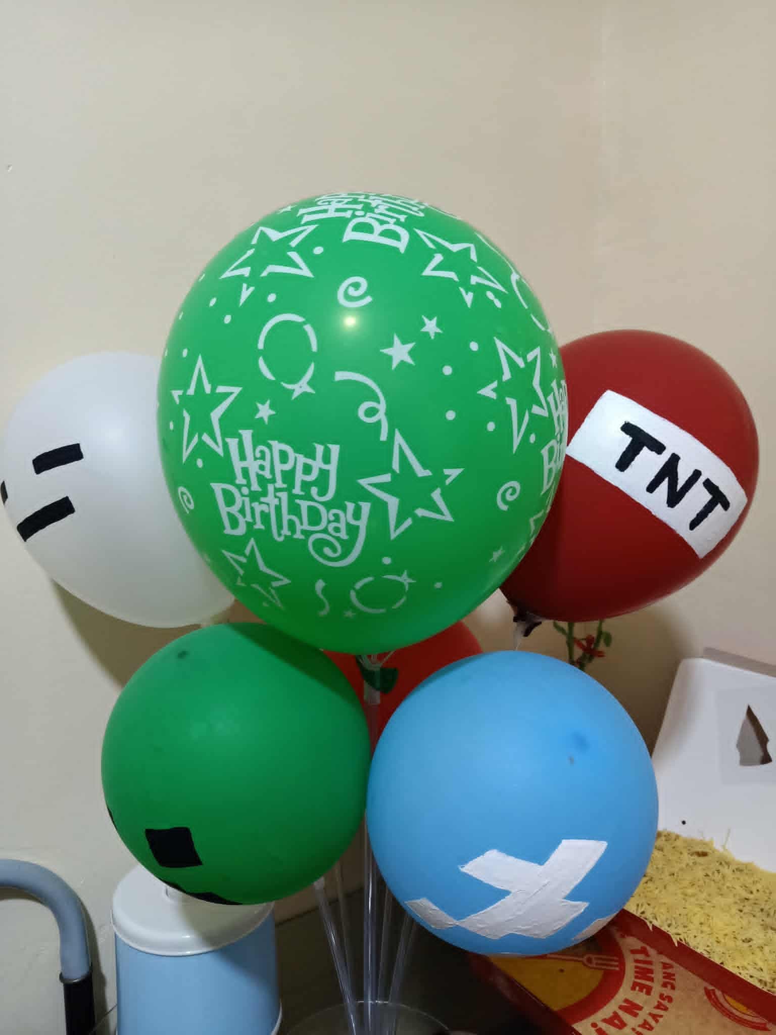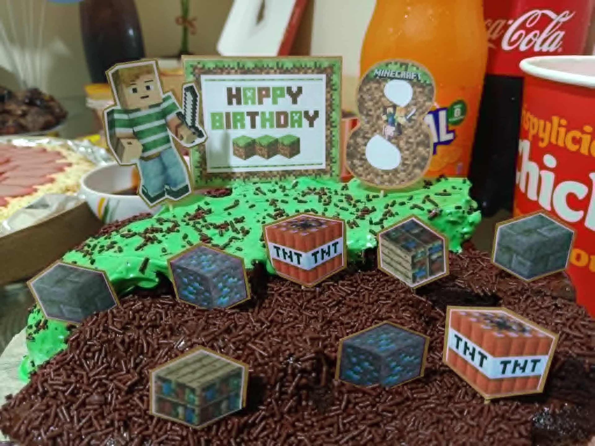 My son was once totally obsessed with Minecraft, so I customized a party banner, some cake toppers, and even the balloons for him! I didn’t have many materials back then, but I made it work with his acrylic paints and brushes. It was simple, but he loved it, especially the cake! We assembled it from scratch using chocolate cake bars, and he happily covered it with tons of sprinkles. ![]()