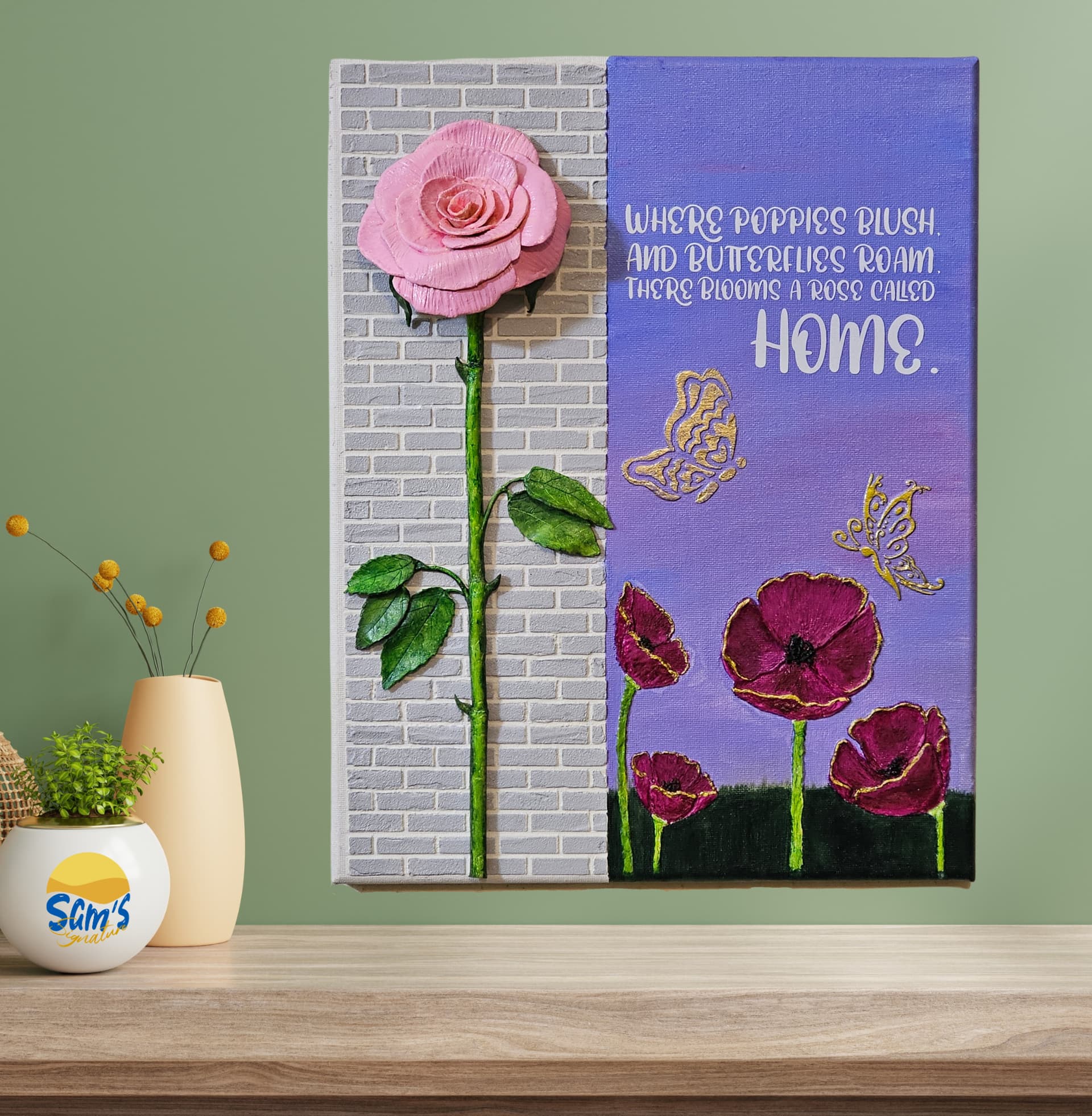I made this mixed media piece about a year ago, using acrylic paint, polymer clay and wood glue (rose), plaster (poppies, butterflies, brick), gold leaf (butterflies), stencils (brick wall and butterflies), and HTV. I’m most proud of the rose, as I crafted the rose completely by hand, with some help from some real leaves to make the leaves on the stem. It was my first big clay project, and my first try using plaster in my artwork.