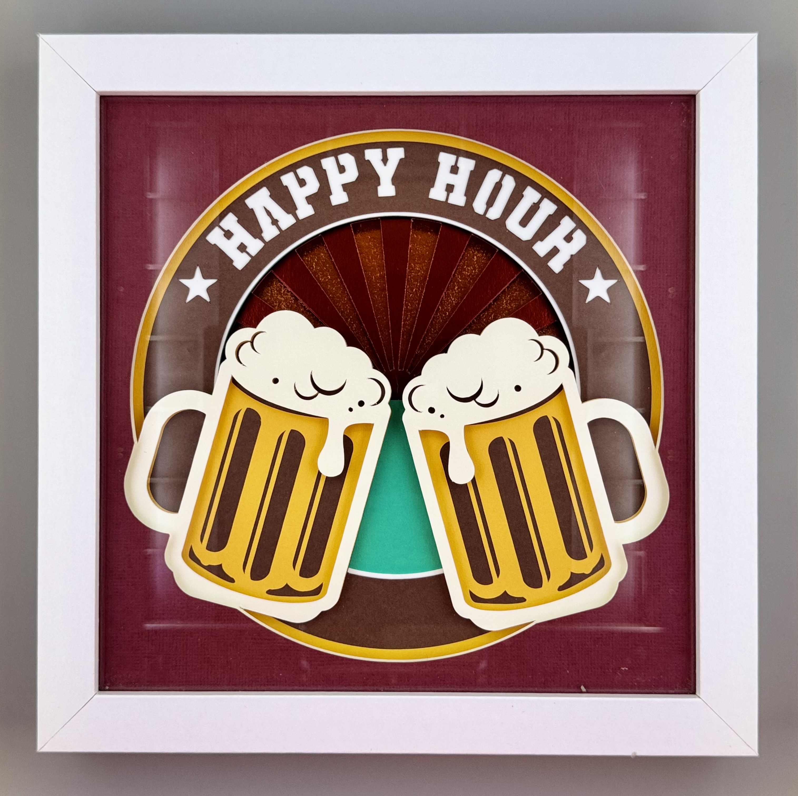 Get ready to step into the golden glow of celebration with Happy Hour Harmony: Layered Paper Joy . This playful shadow box freezes the perfect cheers moment in time, complete with foamy mugs, warm colors, and a splash of retro charm. If you love bold layers, cozy vibes, and artwork that radiates happiness, you will not want to miss this one. Come take a closer look and feel the toast-worthy magic for yourself!