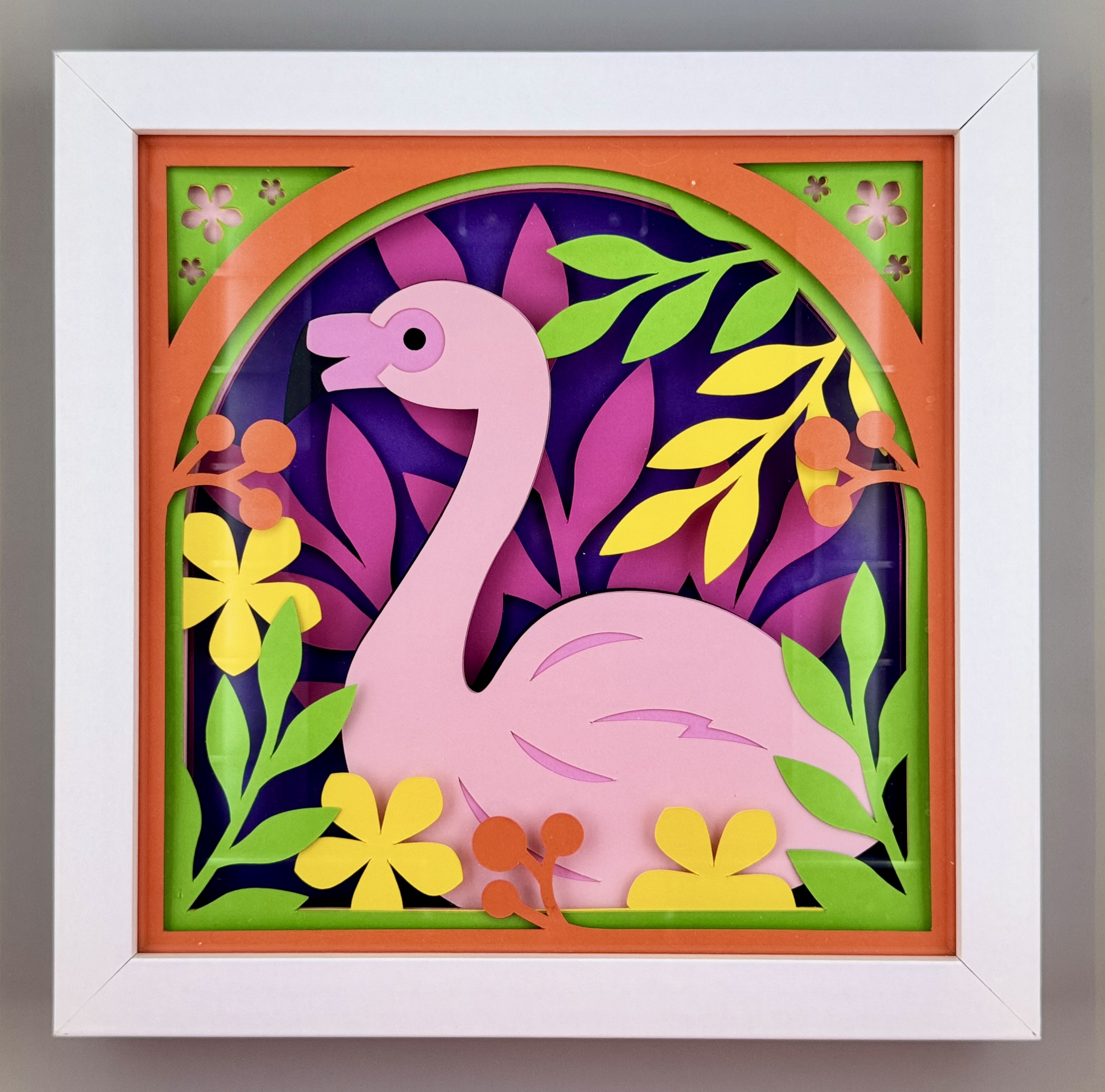Step into a world where color, imagination, and delicate paper layers come together to create pure tropical magic. “Tropical Daydream 1 in Layers of Paper Magic” invites you to look closer, to explore the hidden depth, playful shapes, and joyful details tucked inside every curve and cut. This vibrant flamingo scene feels like a daydream brought to life, bursting with warmth, whimsy, and creative energy. Come take a peek behind the frame and see how each layer transforms simple paper into something truly enchanting.