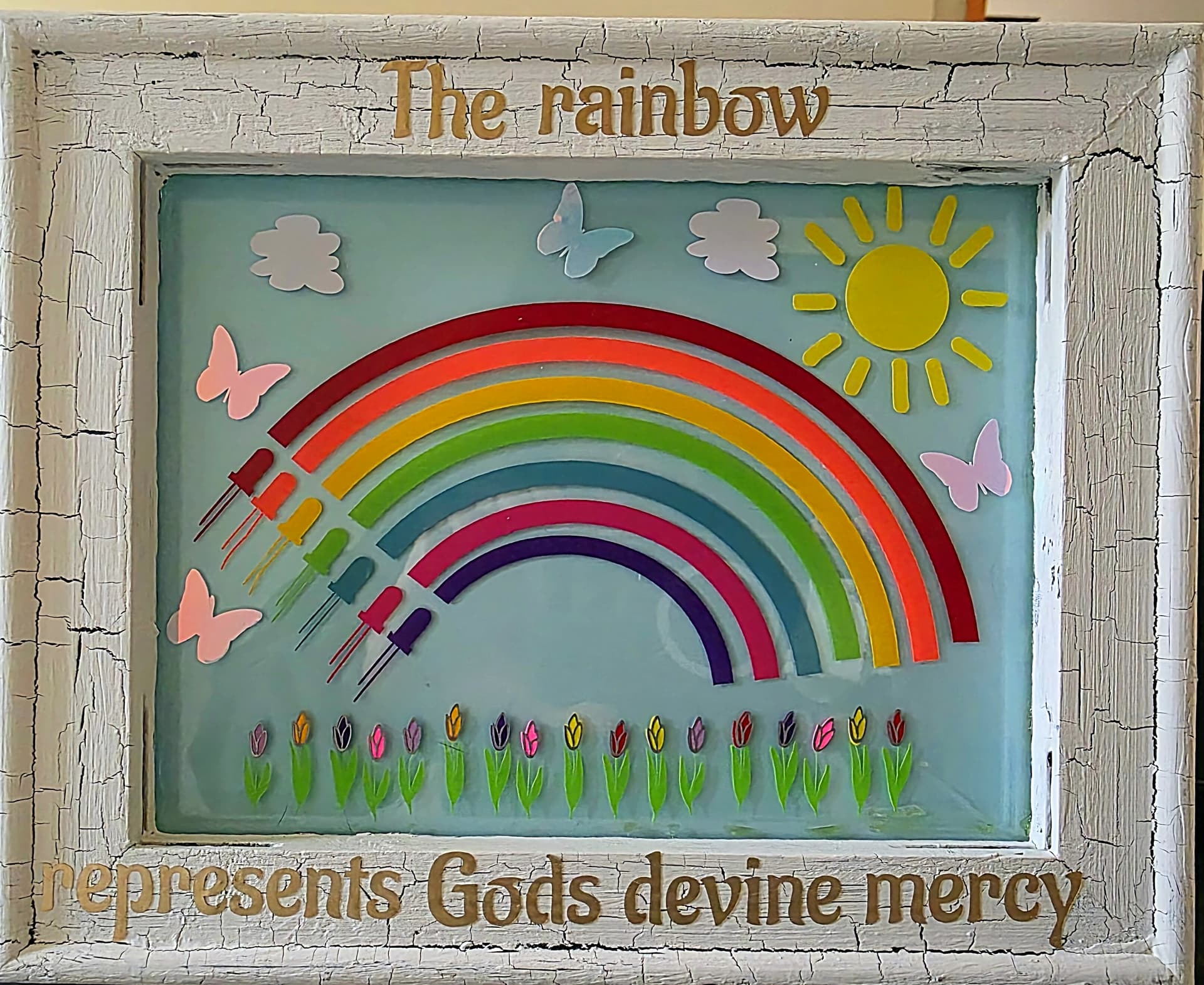 What inspired my colors was the story of Gods promise never to flood the earth again by giving us the rainbow as a reminder.