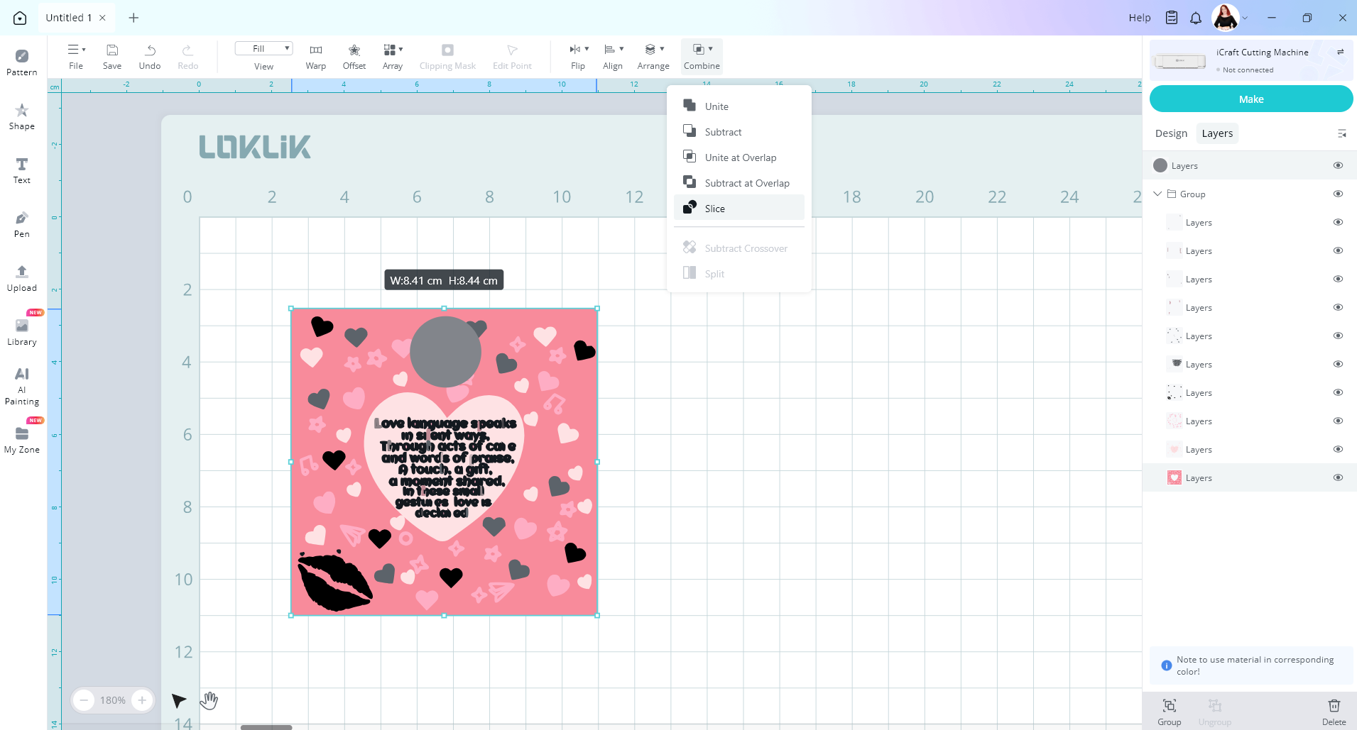Now if we select all image layer and the circle and go to combine and slice, you will notice the slice button is greyed out and can’t be selected. The slice tool can only be used with 2 layers selected.