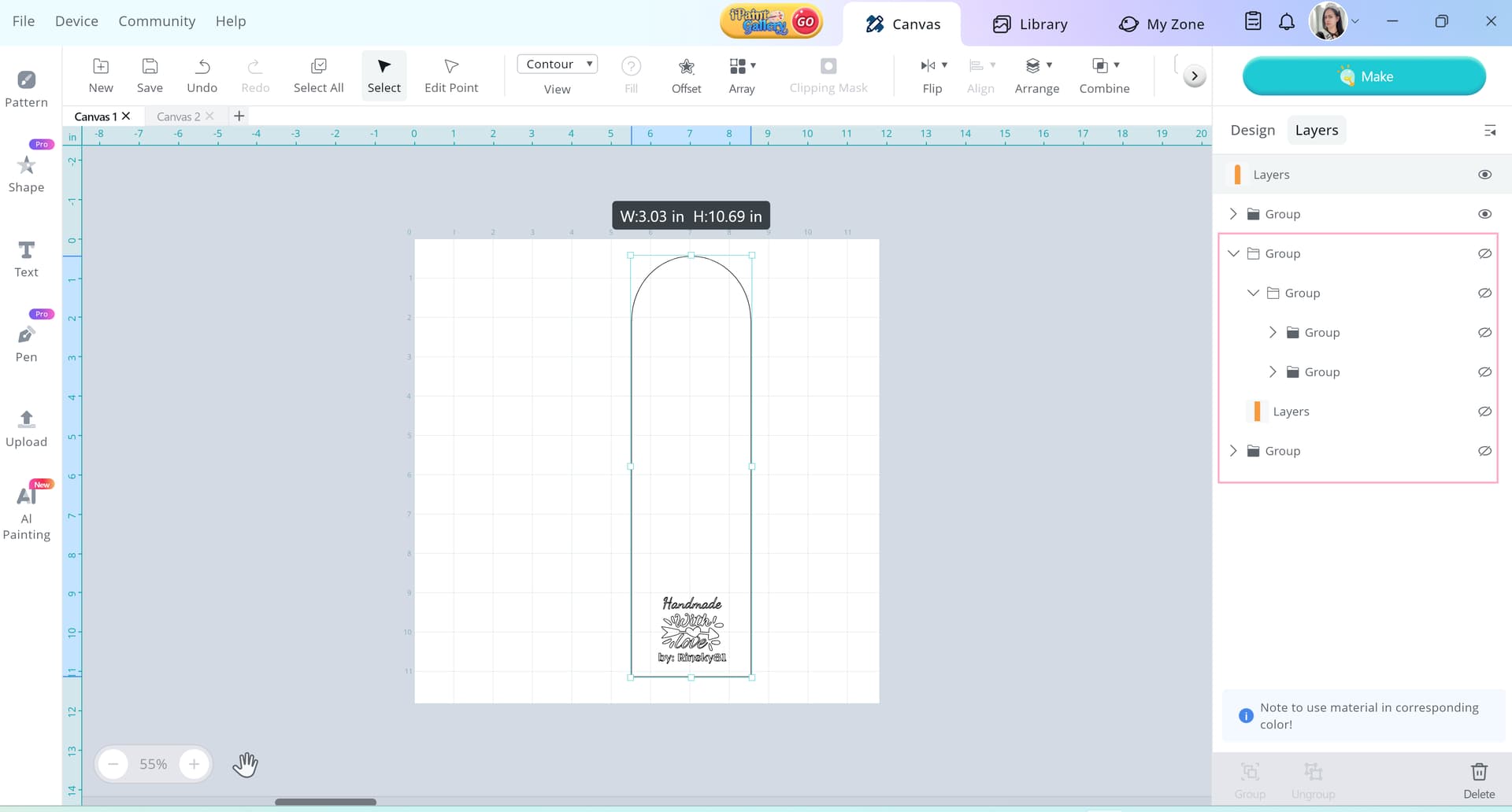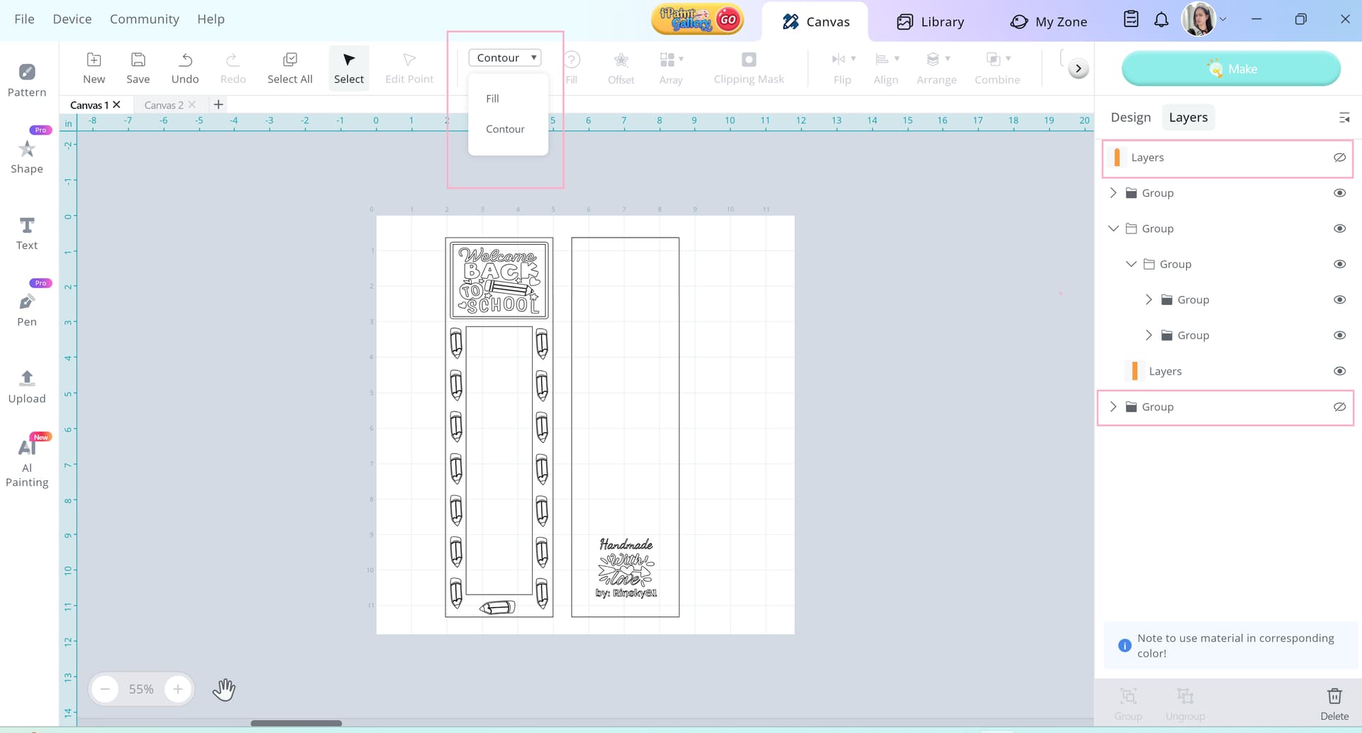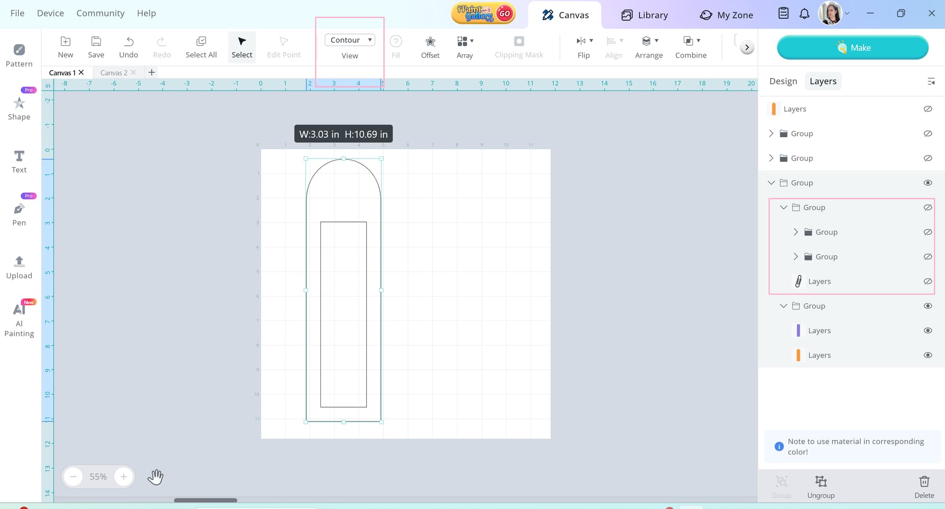 STEP 4 - After engraving, hide the design and bring out the layer for cutting. Click the Contour button to view the template—this step is very important to check if there are any hidden designs behind the layer that could interfere with a clean cut.