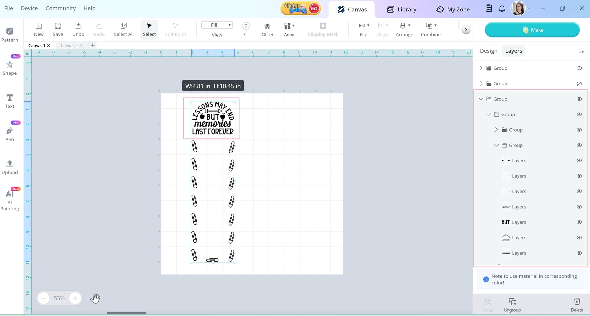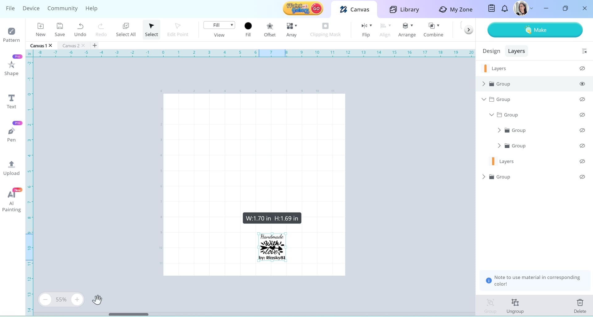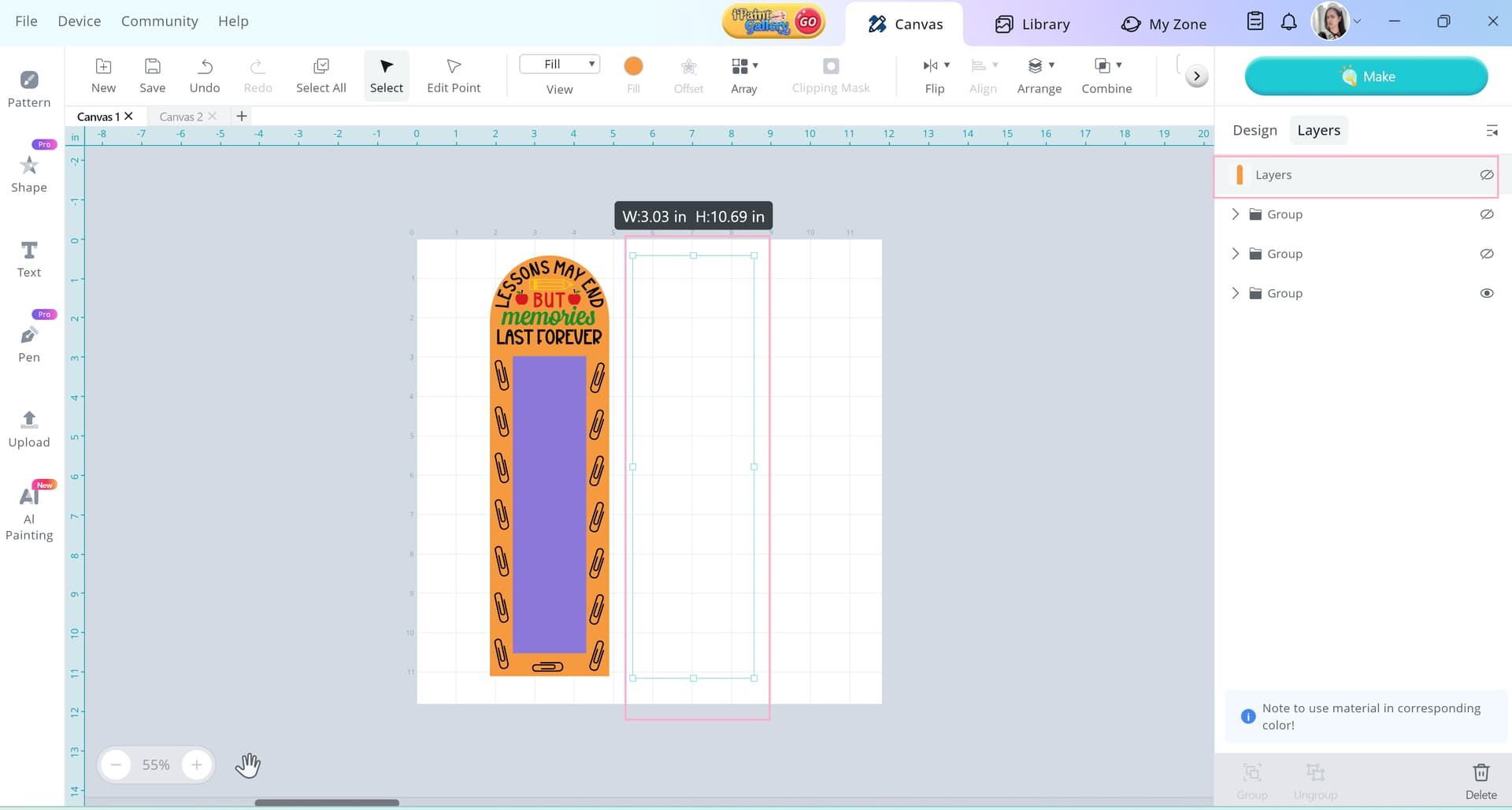 STEP 7 - Engraving and cutting Design B. Hide the first Design templates and bring out the Design B and move it to the canvas. Follow the Steps from 2-6.
