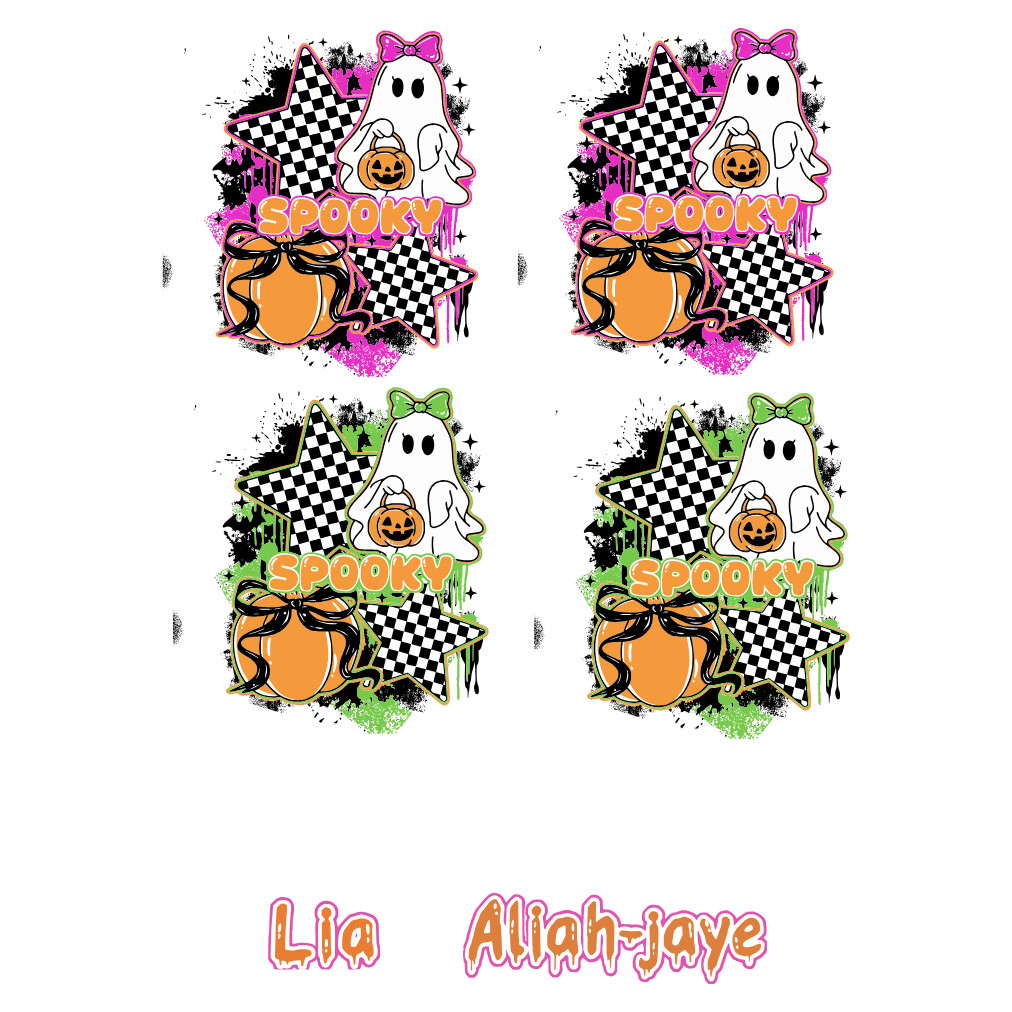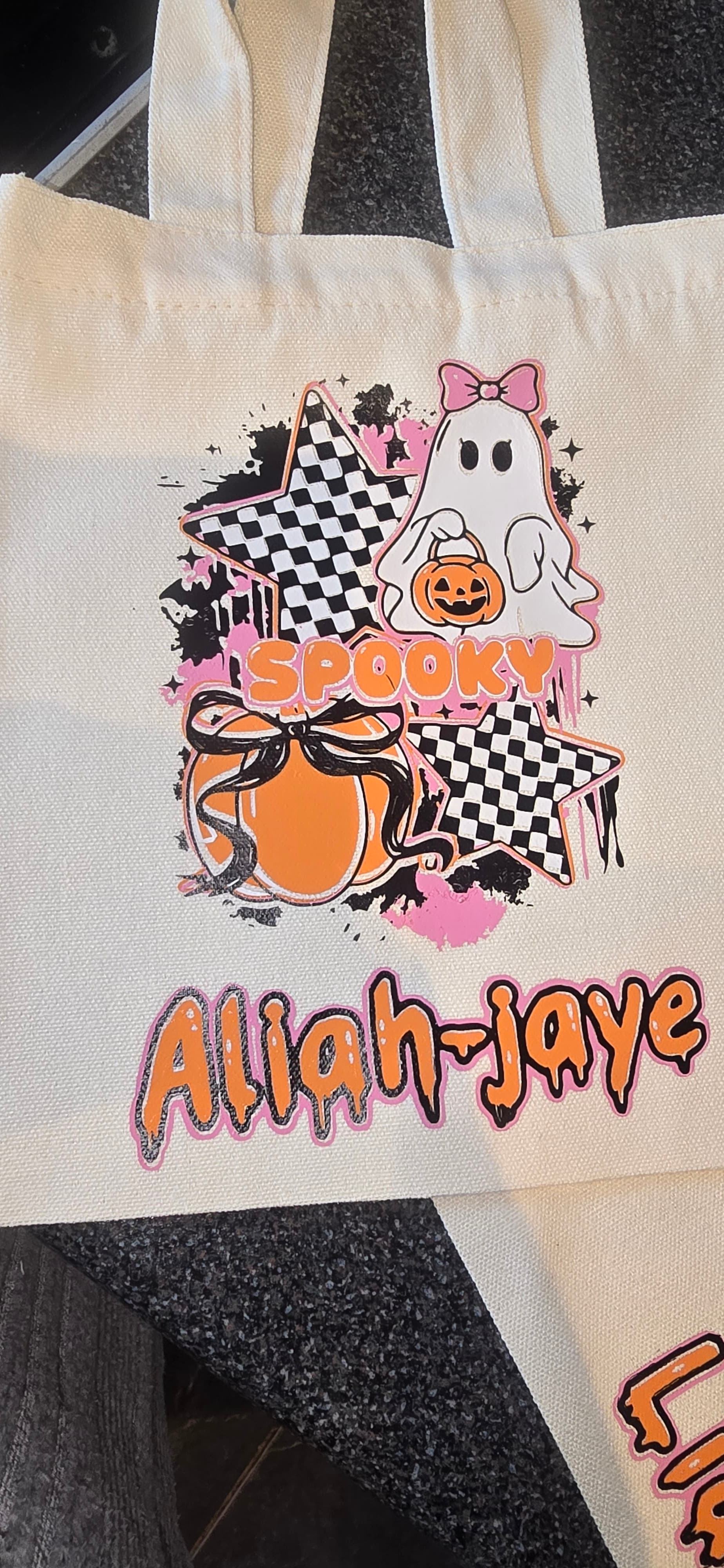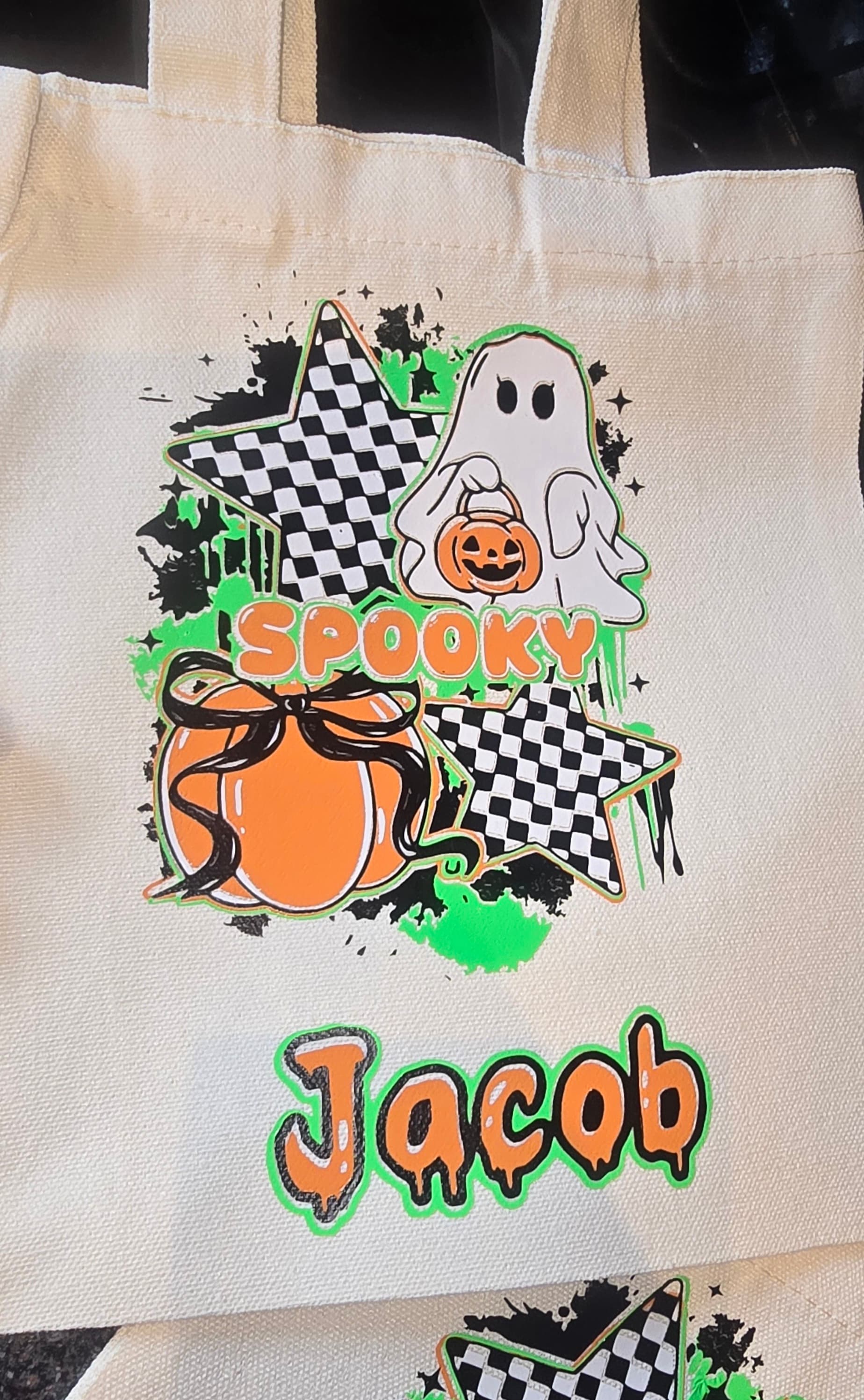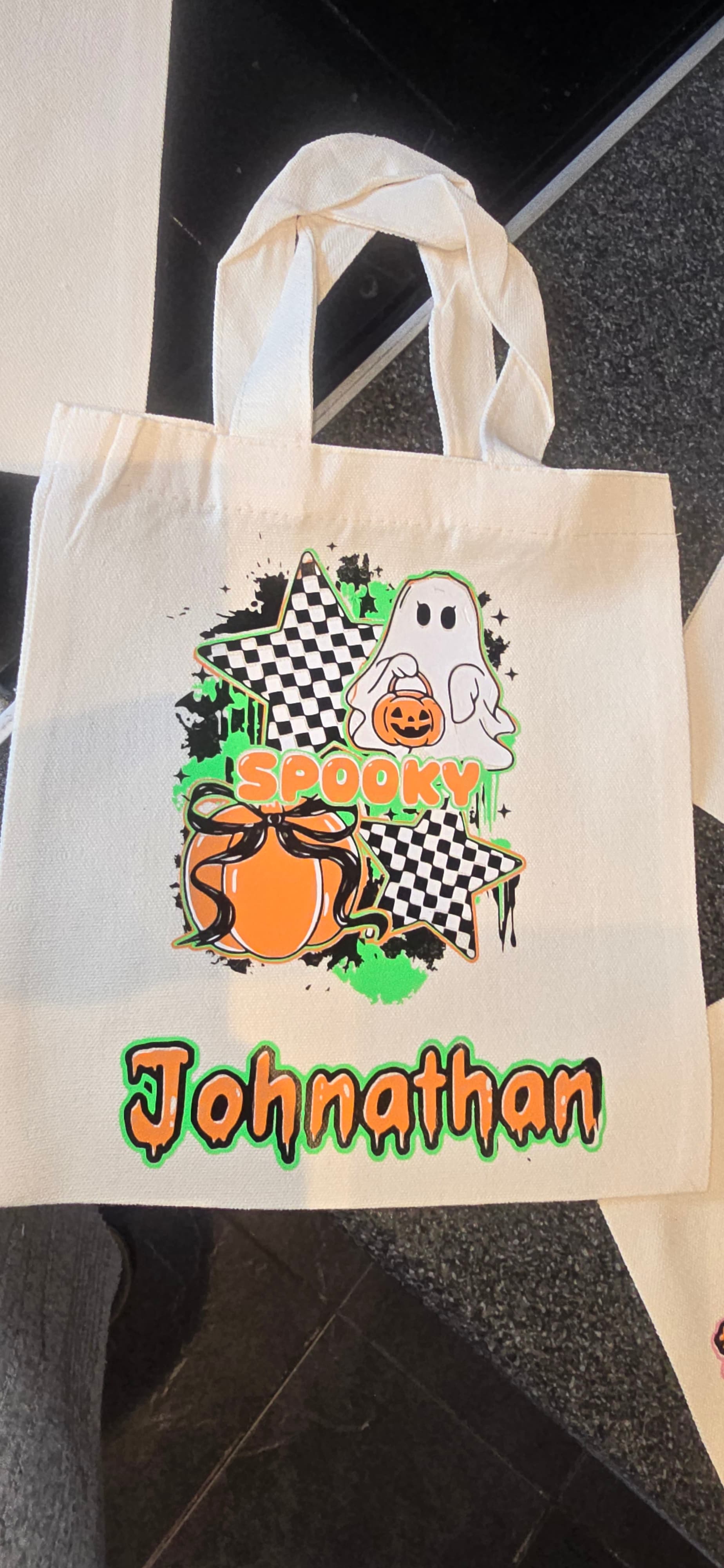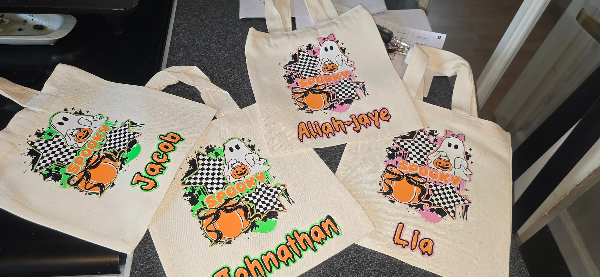 grandson wanted bags made for him and friends to go trick a treating for halloween we used htv viynl and done layering effect i did forget to make boy ghost as this ghost has bow on it lol when when i had finished weeding it out i jyst cut the bow of and added a thin extra bit of htv to go around and it worked a bityou can notice a little if your looking for fault but in passing it looked passable for a parttime crafter like me
