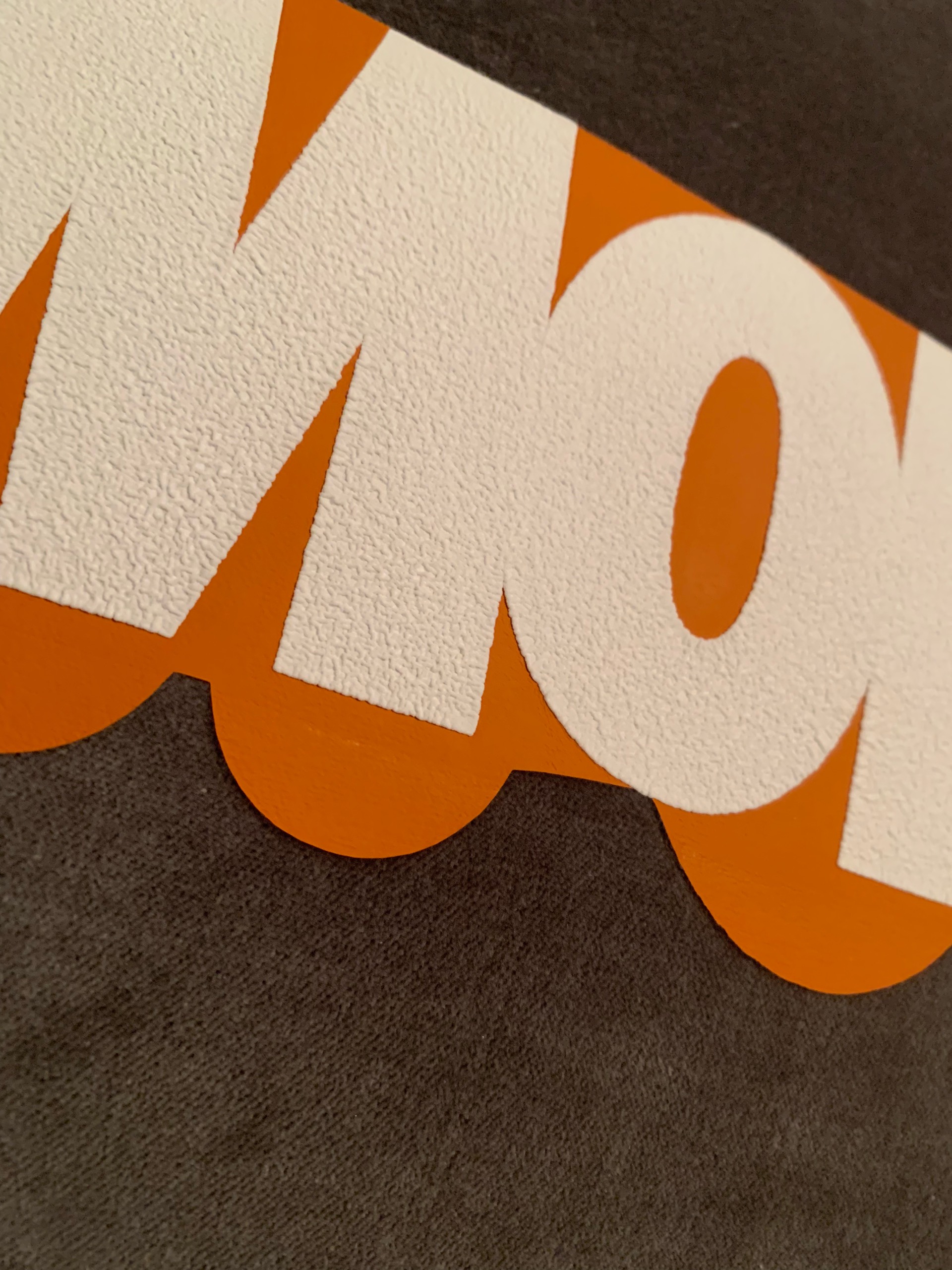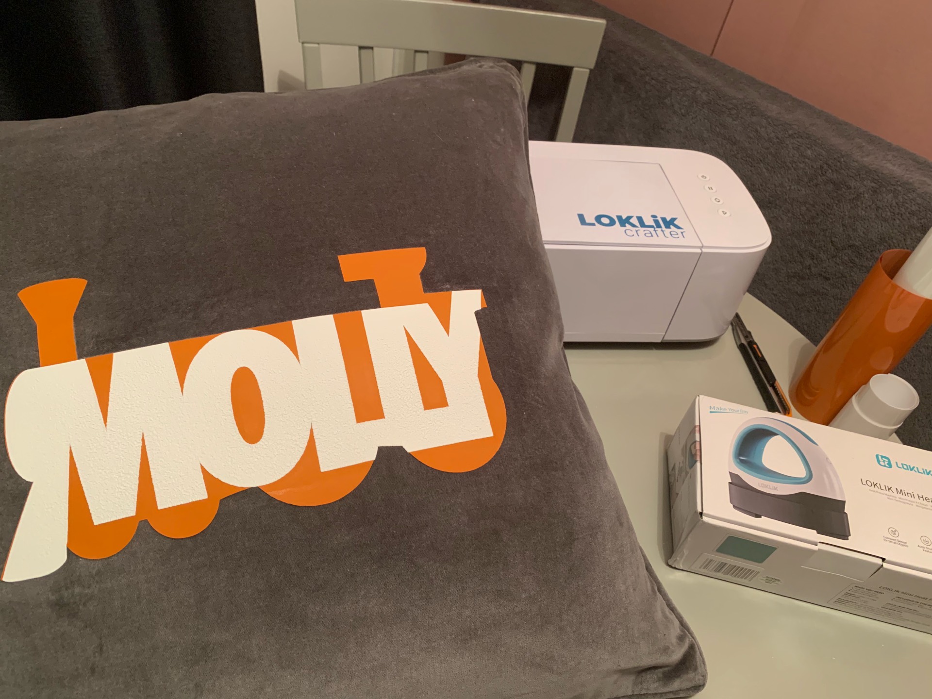 Design based on my daughter’s train tattoo with her name, pressed onto a huge cushion in HTVRont orange HTV and white puff HTV. Cut with LOKLiK Crafter and Mini Heat Press 2.