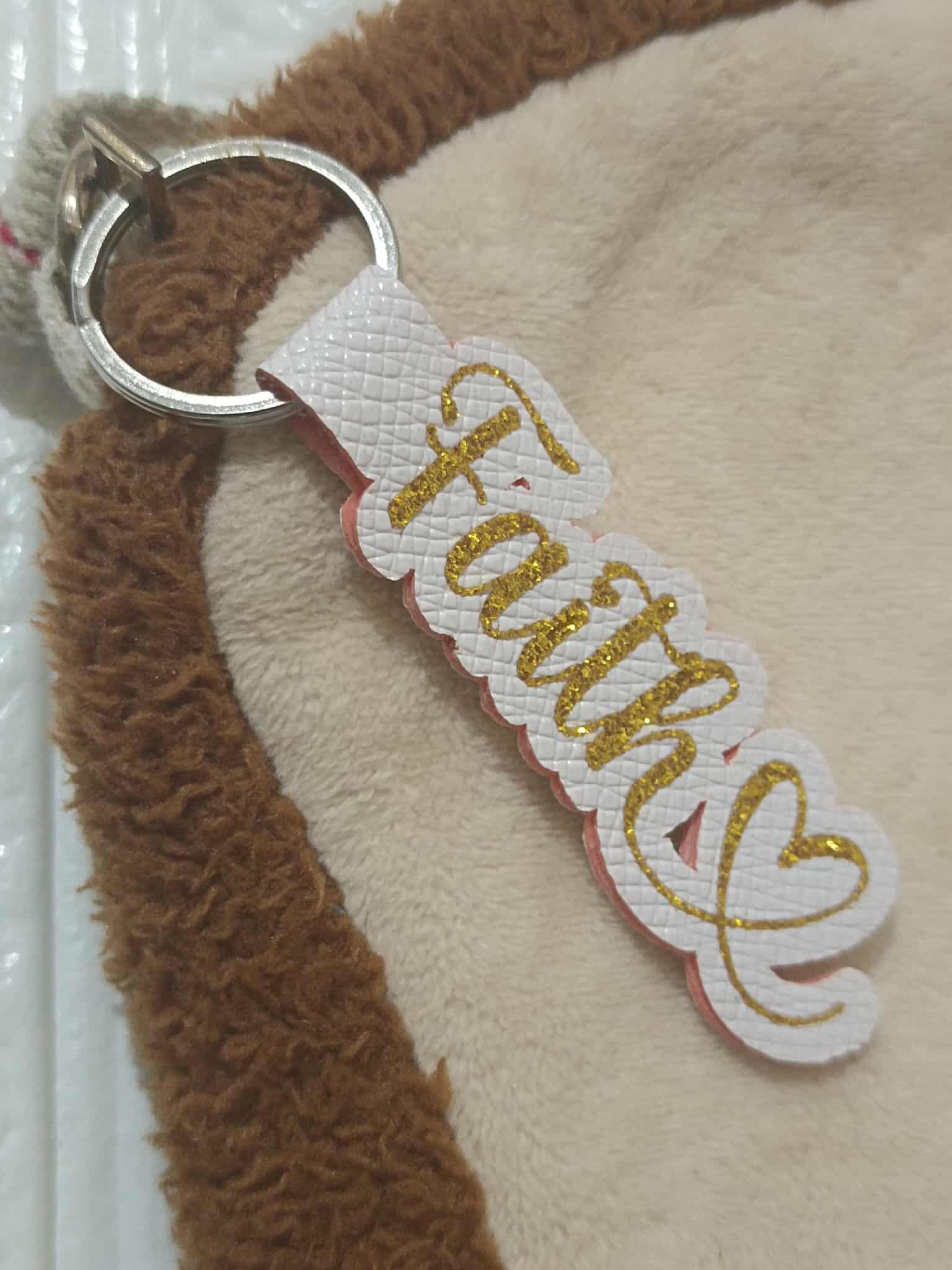 A personalized name leather keychain with Gold Glitter HTV.