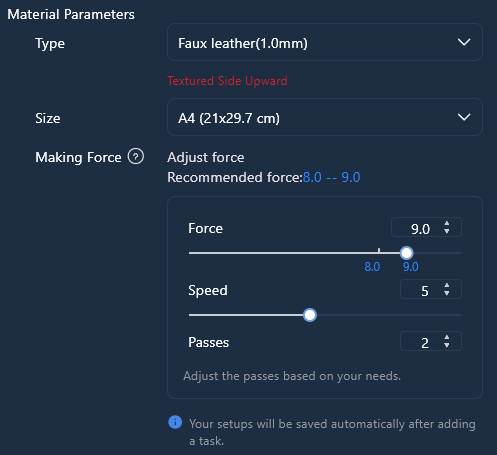 Hi @Andrea_G⊠I used the maximum force preset in the LLIS for 1mm faux leather⊠But Iâd recommend doing a quick test cut first, a small shape in the corner should be perfect⊠![]()