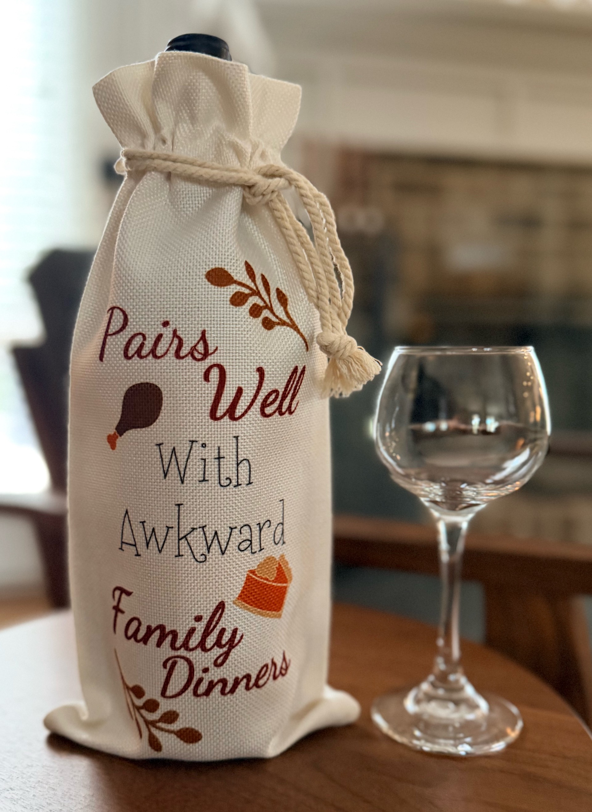 Make your Thanksgiving gift unforgettable (and a little bit cheeky) with this charming “Pairs Well With Awkward Family Dinners” wine bag! Designed with a touch of humor and holiday warmth, this bag is ideal for dressing up your favorite bottle before handing it off to friends or family. Whether you’re celebrating around the table or bracing yourself for those classic family conversations, this bag says what everyone’s thinking—with style.
