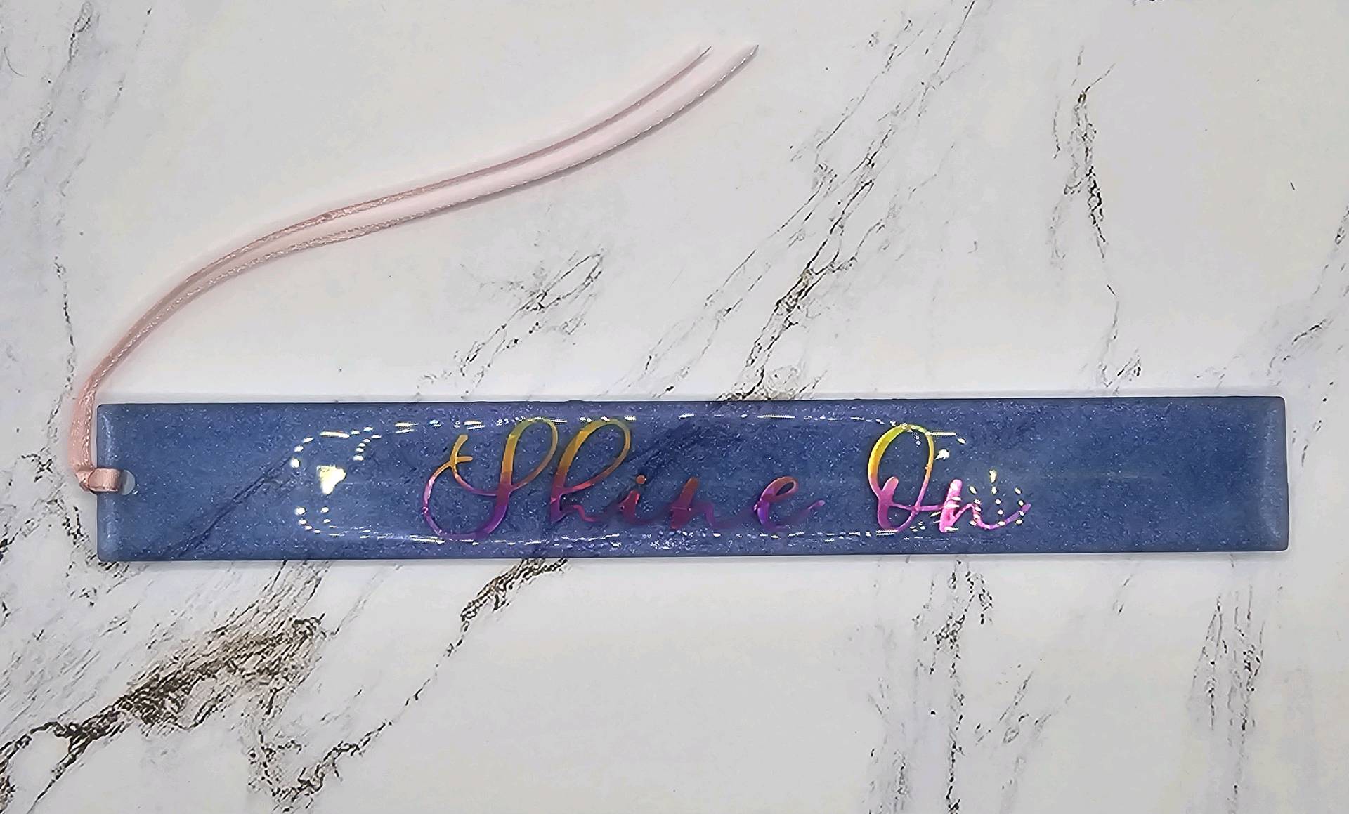 For this bookmark, I used some holographic permanent transfer vinyl over epoxy resin, then, I topped it with a coat of UV resin to protect the vinyl, ensuring that it will last a lifetime. I added a pink ribbon, but I’ll probably change it out with a tassel, which I think will look better. I just have to order some tassels. This bookmark is meant to go with my Faith It Till You Make It notebook that I also made with epoxy resin and holographic transfer vinyl.