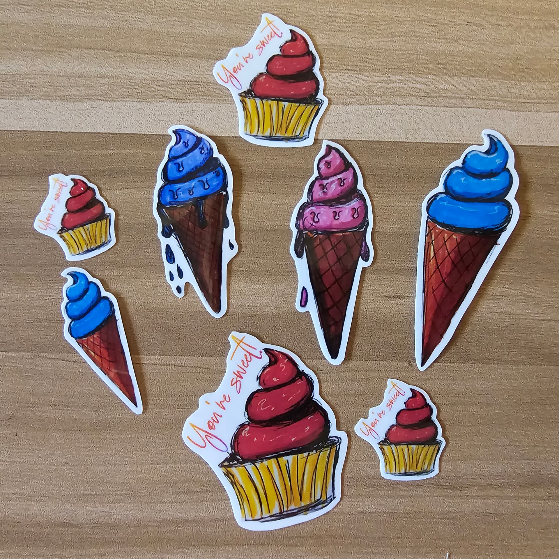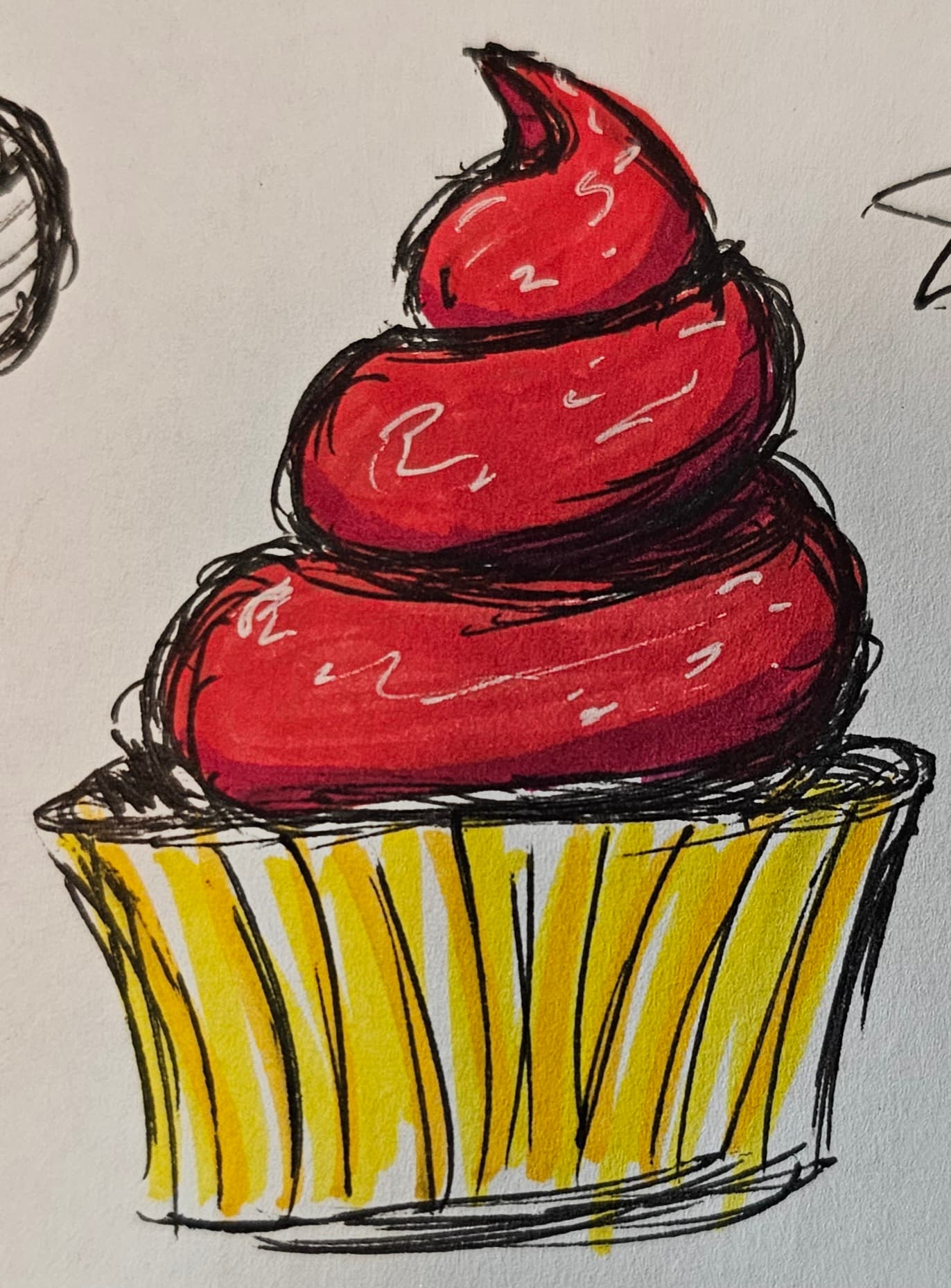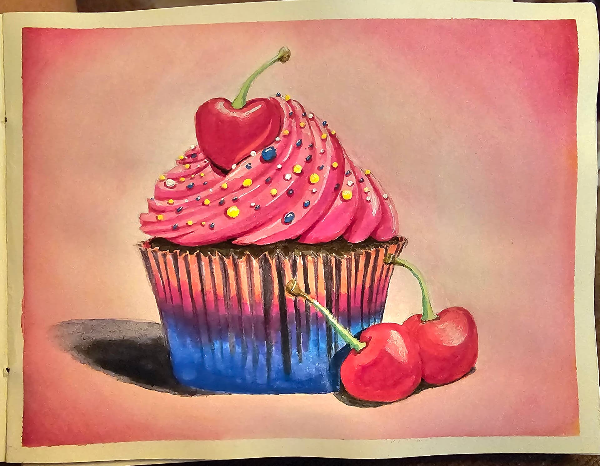 Oh, I love sweets! I love making them, eating them, drawing them, making crafts for them and about them! Here is a photo dump of some paintings, drawings, crafts, stickers — I made out of my drawings — and even a real cake that I baked from scratch and decorated. The last piece is a clay cupcake I made by using the pink cupcake watercolor painting as a reference. I had 2 but one broke, so I’m going to make another one and make earrings out of them, eventually.