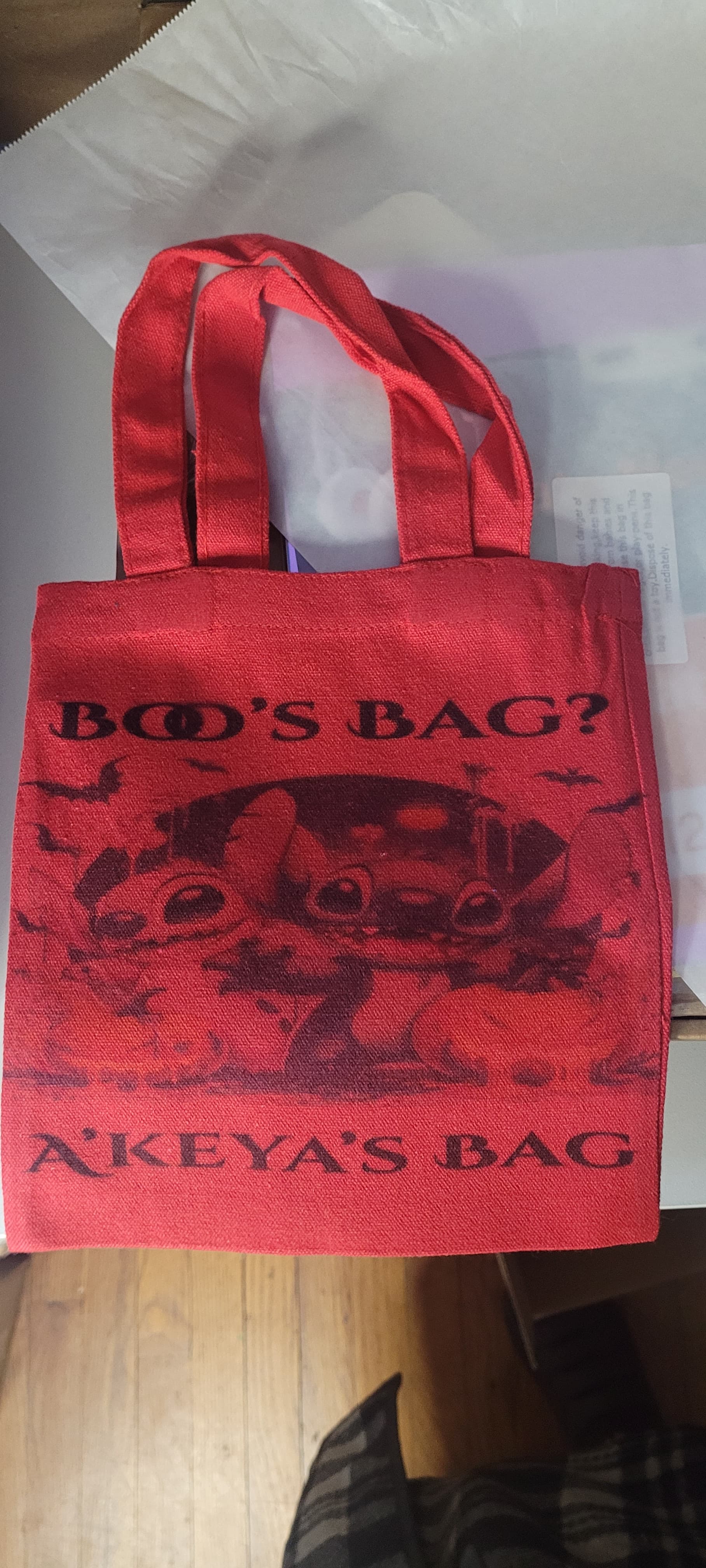 Today I made my granddaughter 2 halloween bag…Lilo and Angel…I had forgot that you can sublimate on dark colors so the small one has a faded look then I used sublimation HTV & that one came out much better…What do you guys think?