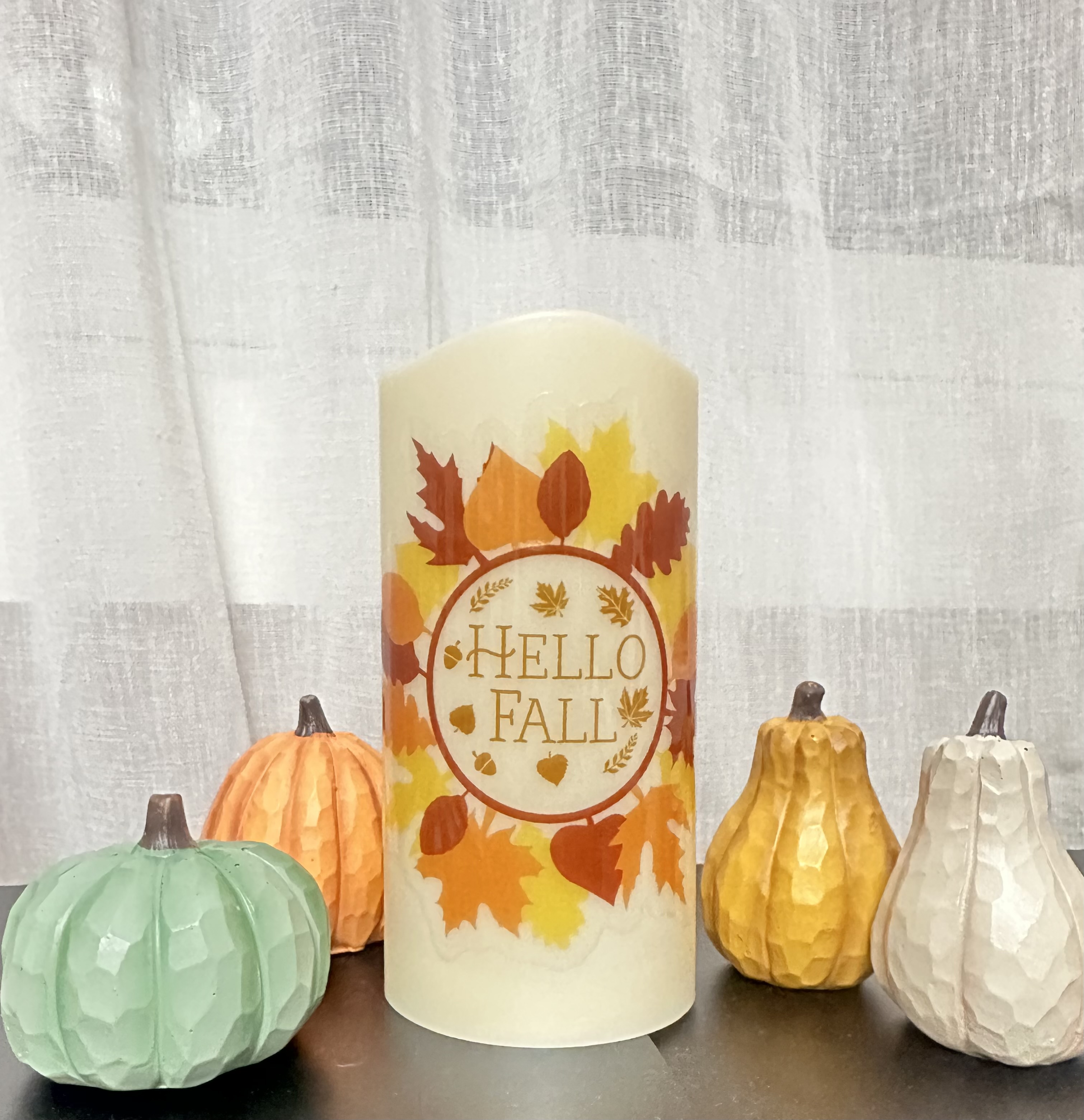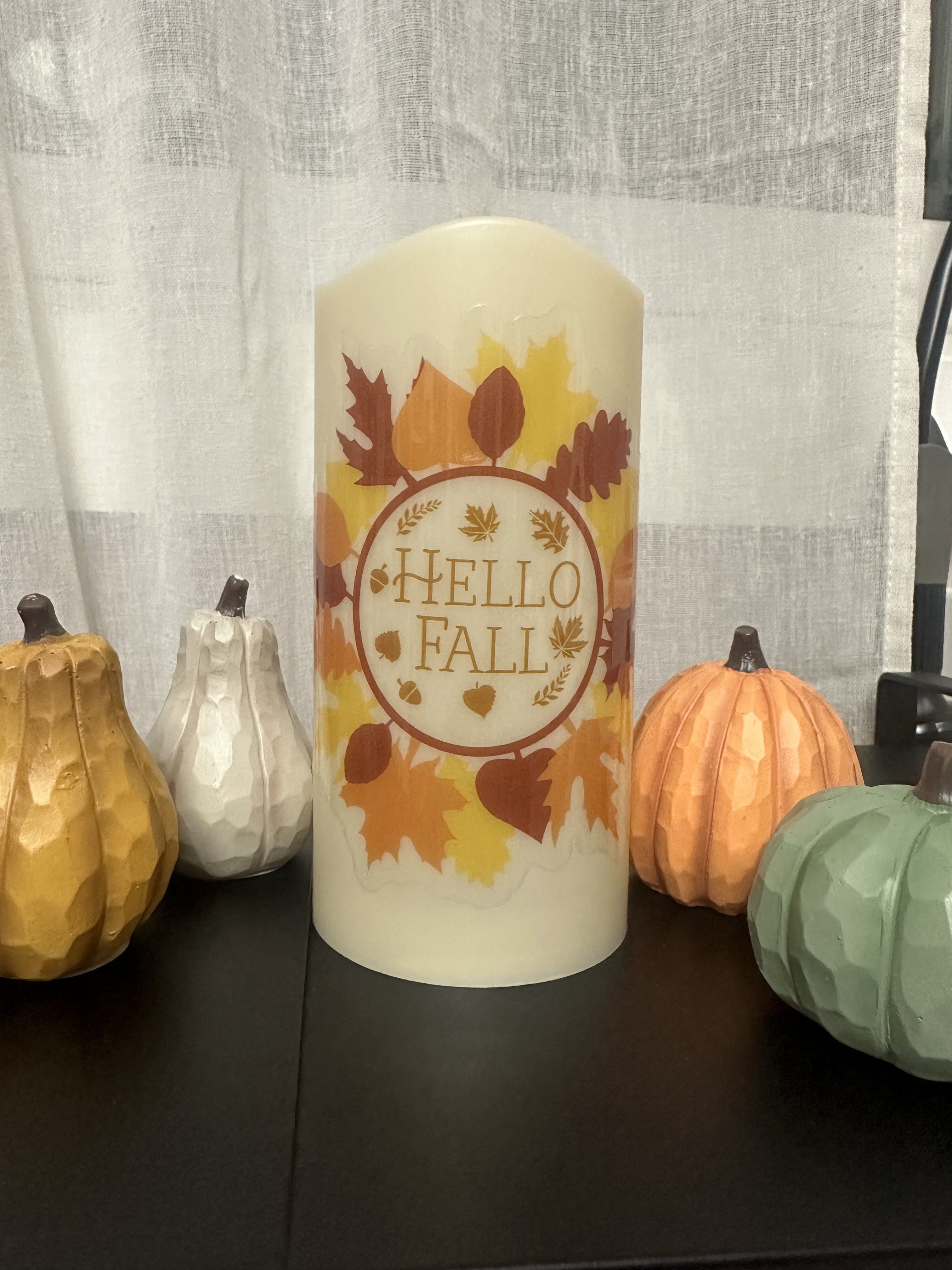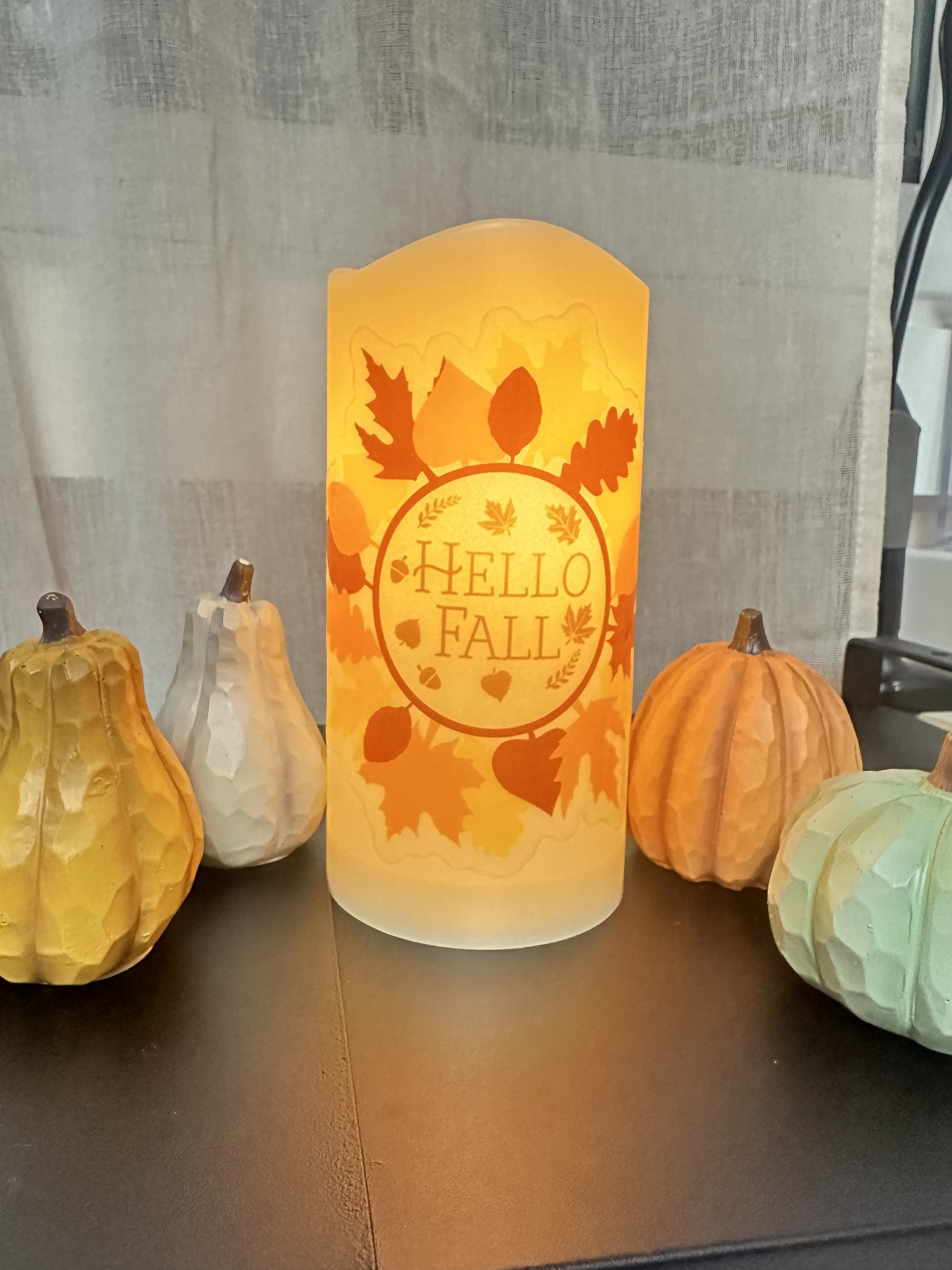 I decorated this LED candle using a transparent sticker using Htvronts transparent printable vinyl sticker, I needed to add a fall touch to my decor in my living room and I love the result!!