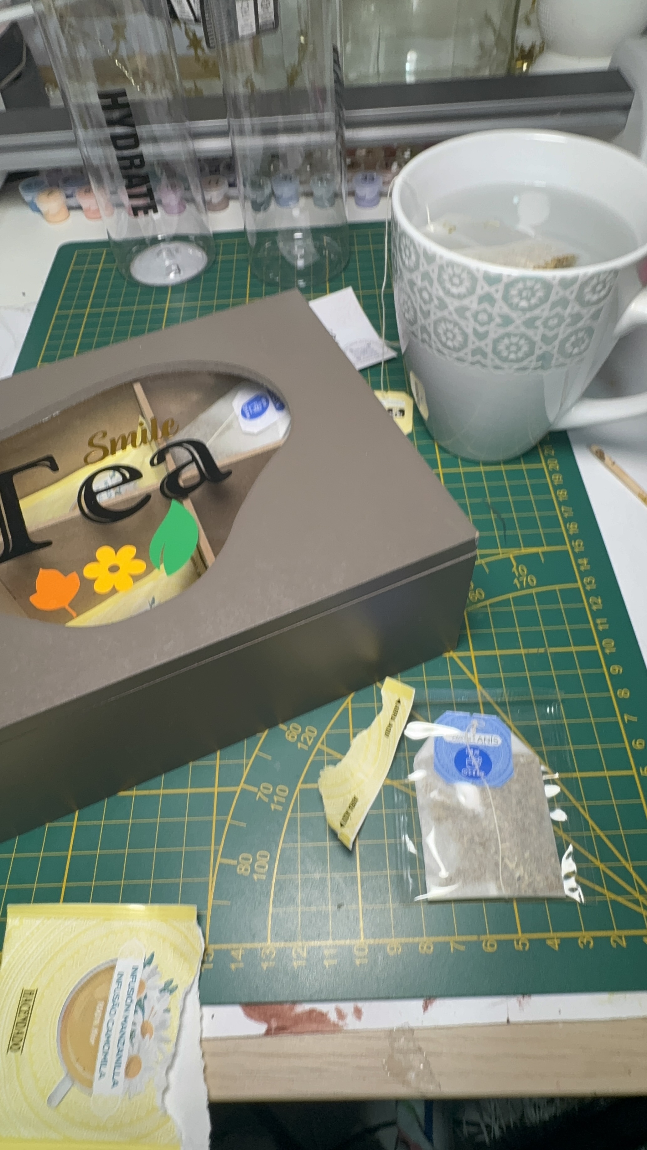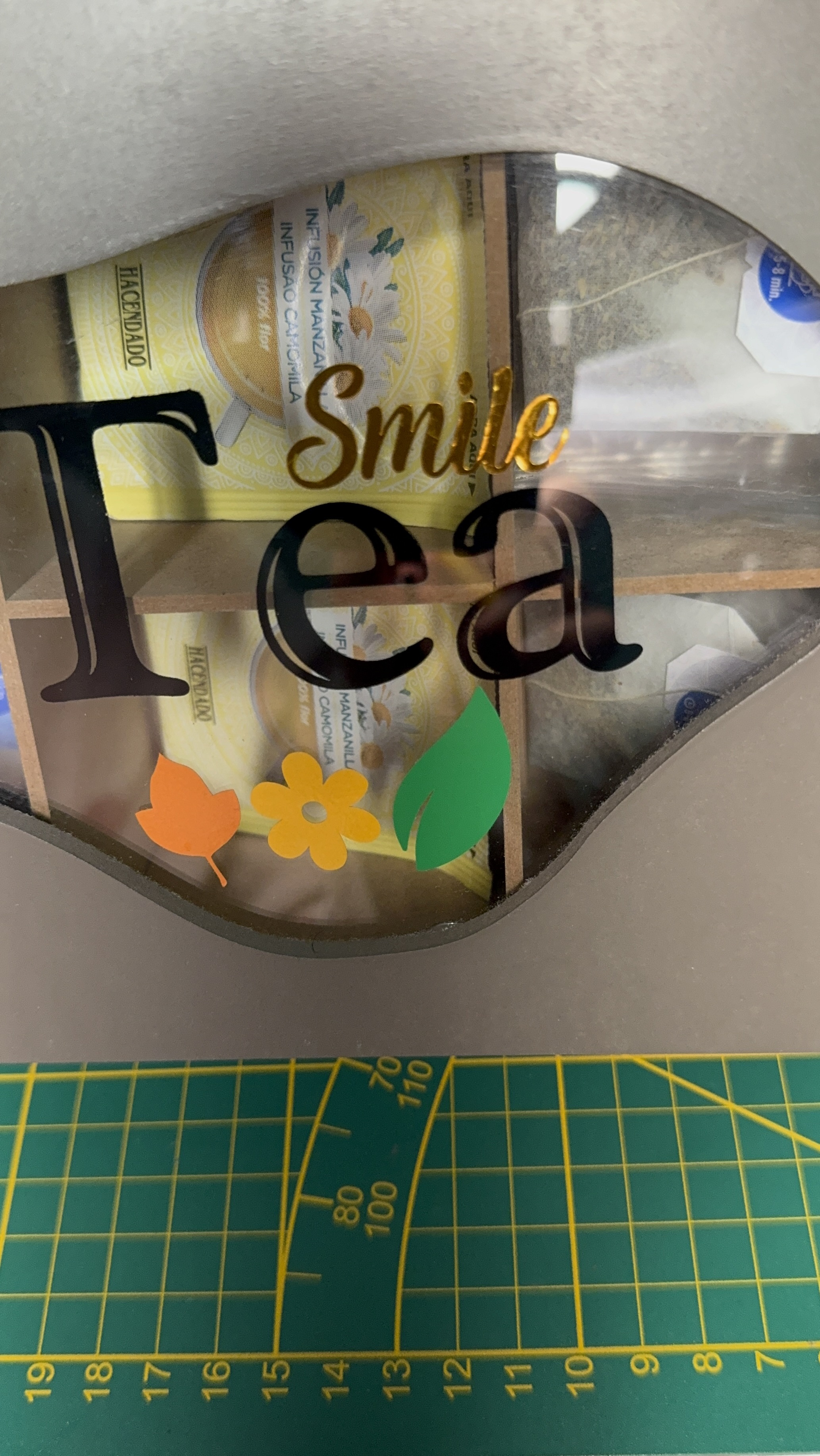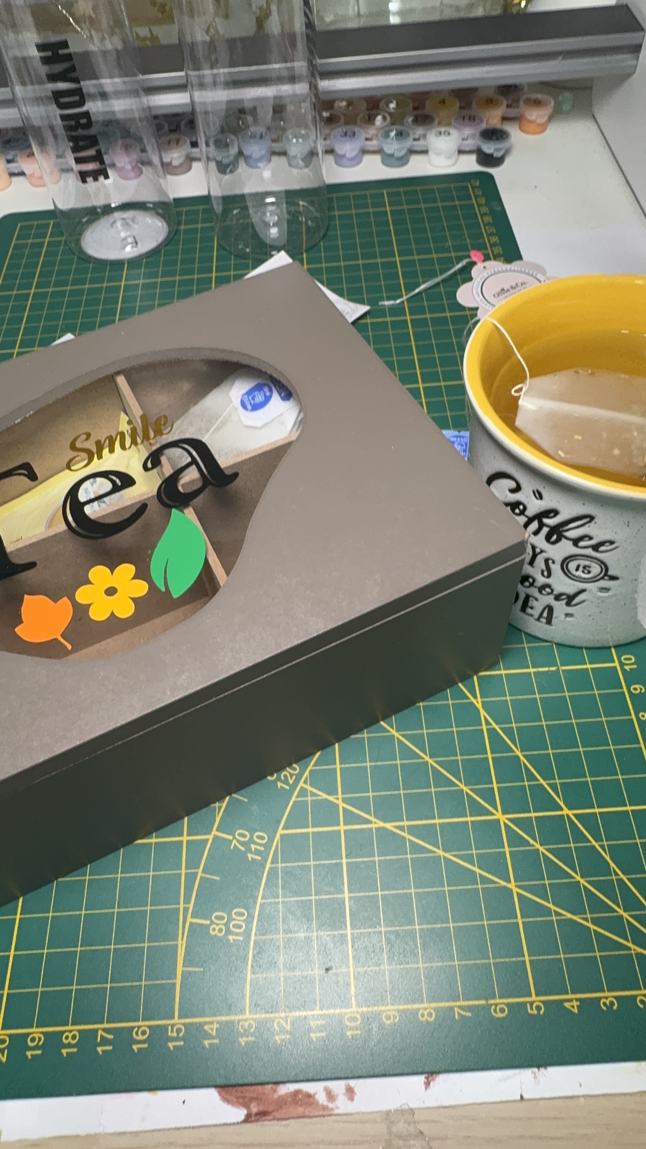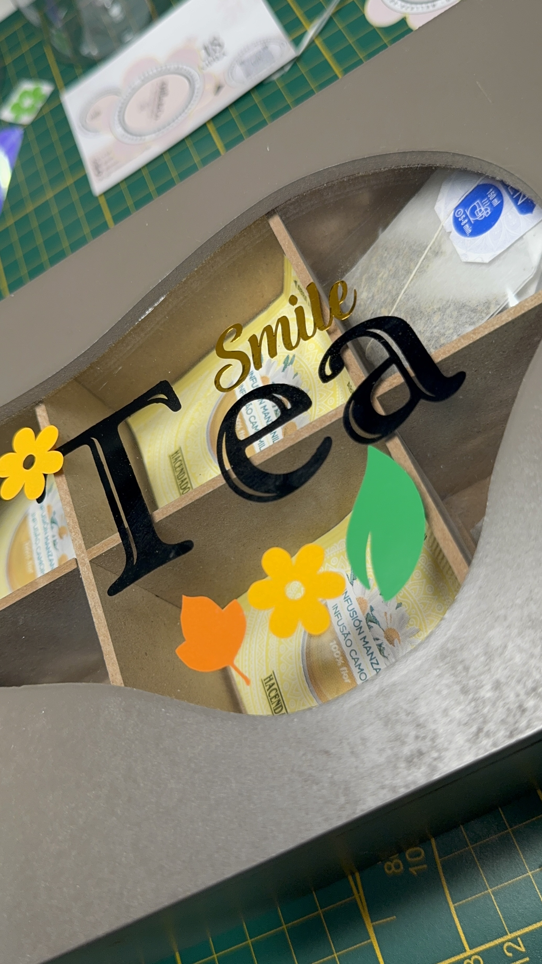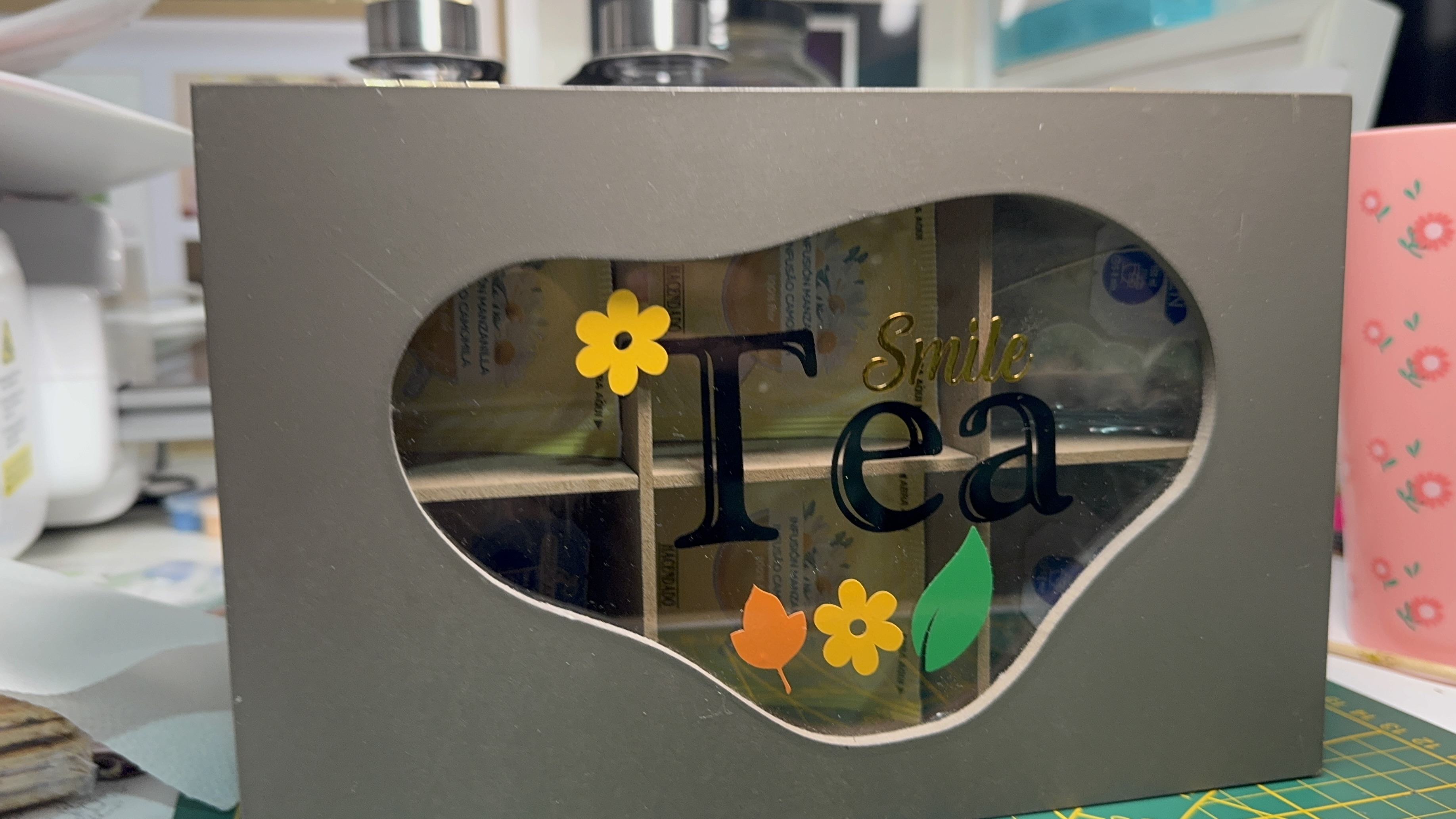 A cozy wooden tea box decorated with elegant seasonal vinyl tones , two cheerful yellow flowers (I just can’t resist adding flowers to everything I make ), and a touch of fall with tiny orange and green leaves.