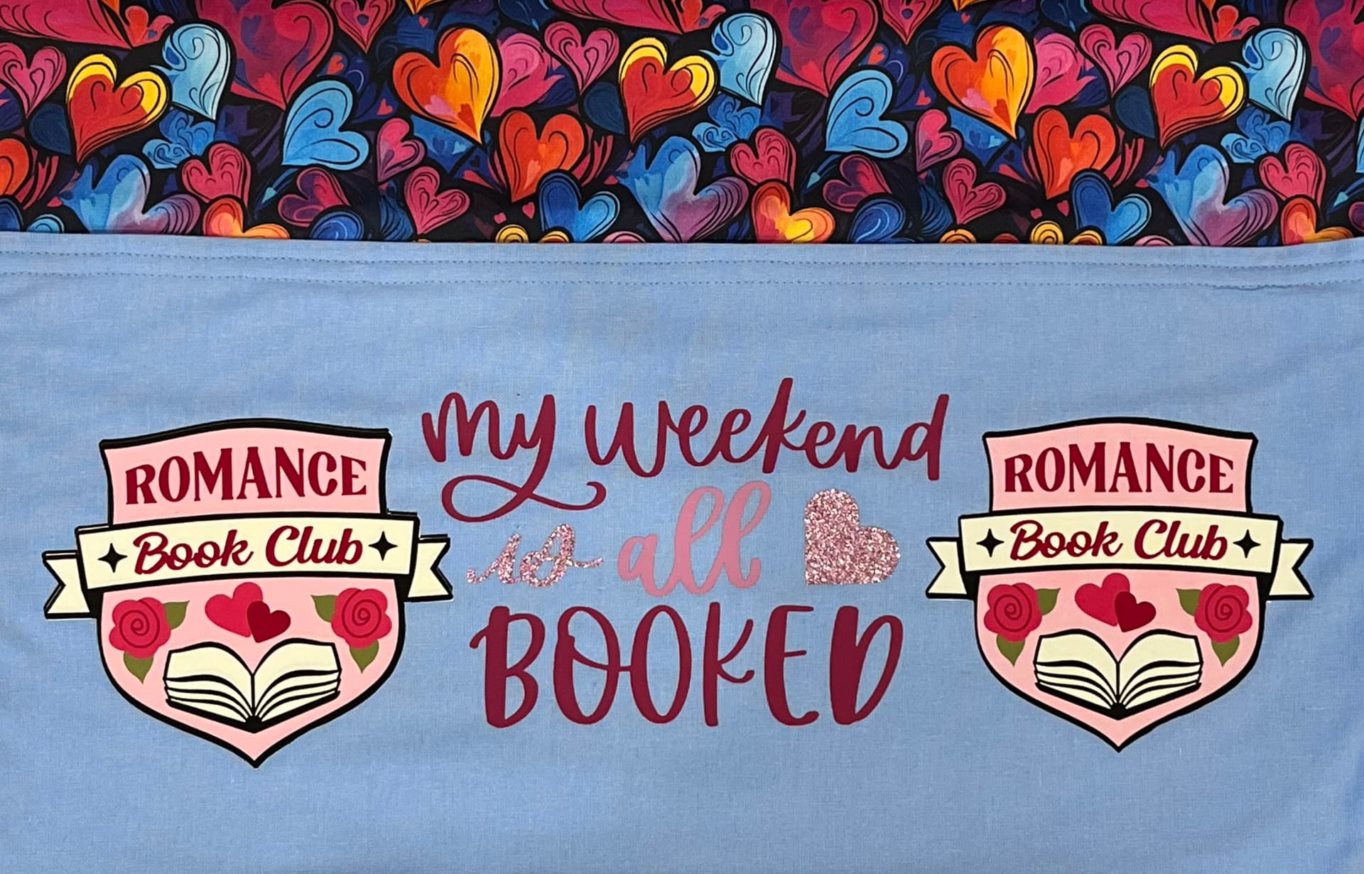 I swapped the books on the original wording for a heart and cut them out in both smooth and glitter HTV. The emblem was made with a dark T-shirt transfer sheet and using the print and cut option on my Crafter.