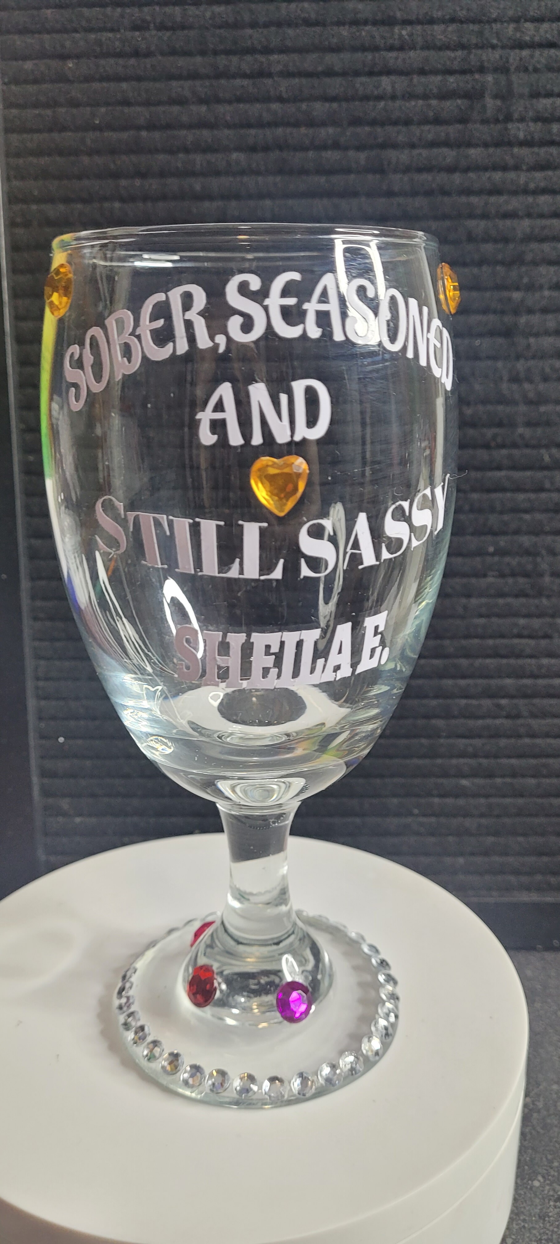 Story: I started with a simple, clear wine glass from Dollar Tree — the perfect blank canvas. It was created for my sister, who is moving into her new place. The lettering was designed in Ideastudio, using the same “Sober, Seasoned, and Still Sassy” style.”