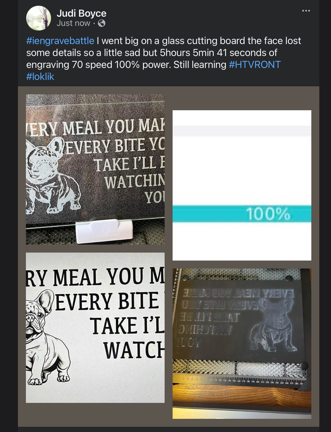 Ok I am working on organizing the back room that has engraver cause my husband is out on a fishing trip lol so I am going to try the different colors different power thing this week sorry I had white a few icky feeling days and migraines so finally feeling more me at least so it’s on my list of things to try!