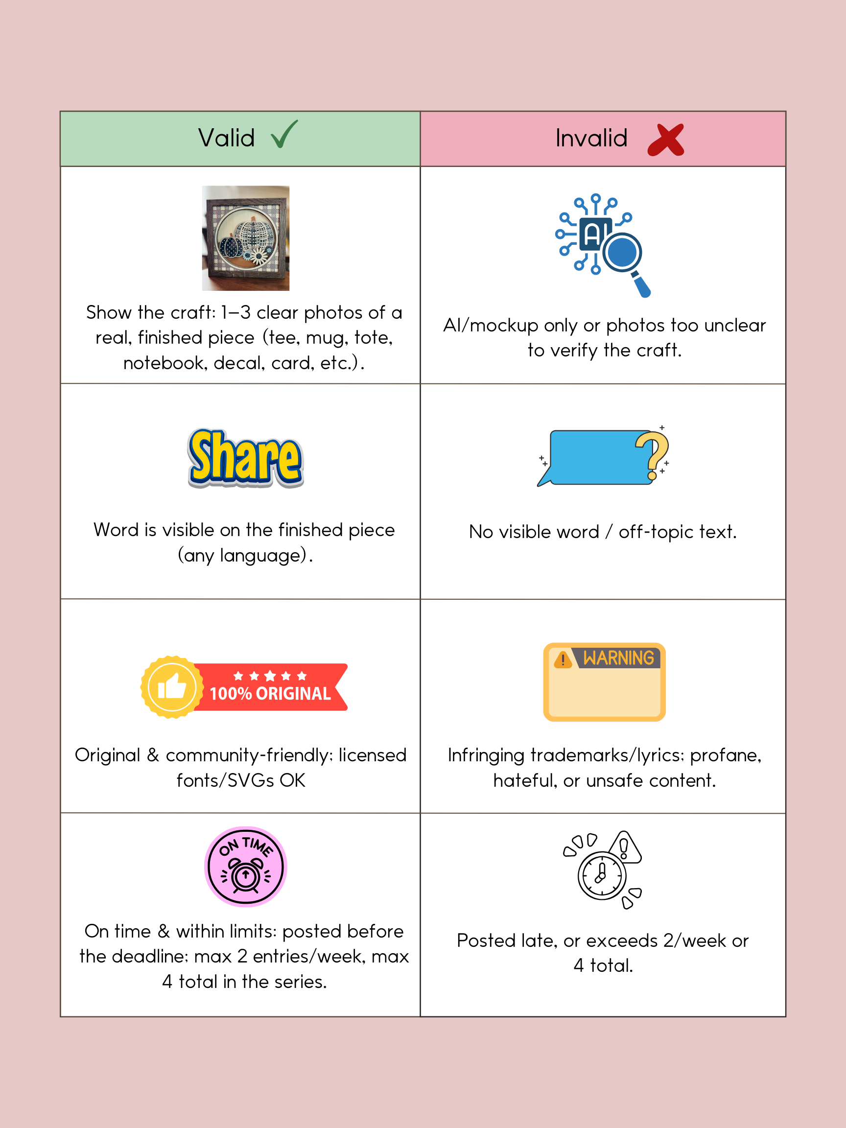 - Craft & finish – 30% (Cut/press/adhesion/edges neat; layout & color layering; overall build quality.)
