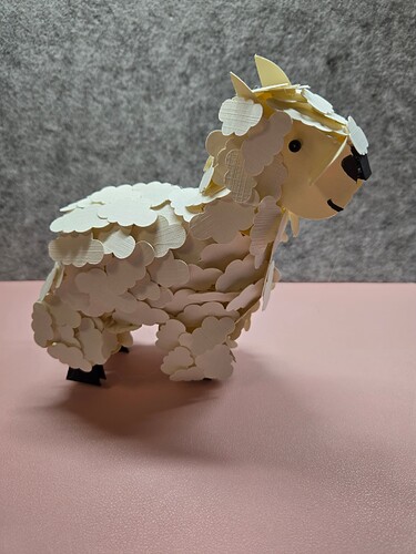 Story : My inspiration was to design my own 3D alpaca complete with fluffy fur. First, I created the design through hours of work, adjusting each individual shape so that it would fit. Then I had everything cut with the Loklik plotter and assembled it as can be seen in the pictures. Once my little alpaca was standing securely, I began gluing the fur with hot glue. I wanted it to look as realistic as possible. I hope I succeeded. Materials used: Cardstock 270gsm for the framework, luxury cardstock 220 gsm for the fur, hot glue, 2 beads for the eyes.