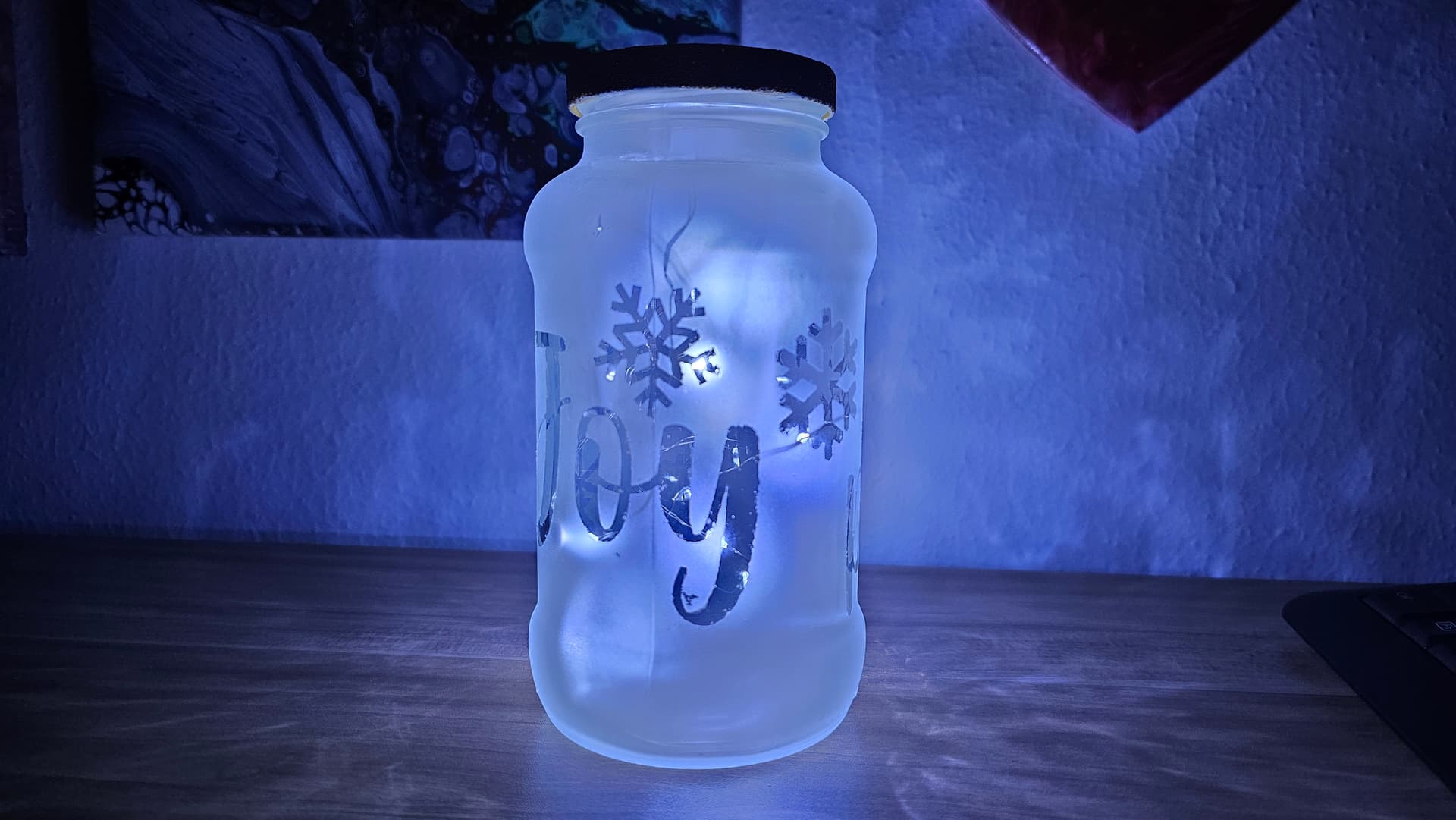 Using my Loklik machine, I cut some Magic Cover transparent vinyl and applied it to the jar with transfer tape. After spraying with frosted glass spray paint and letting it dry, I peeled off the temporary vinyl to reveal crisp, glowing words—Love, Joy, and Peace—framed by snowflakes. A bit of sticky residue lingered, but I used the transfer tape to gently lift it away.