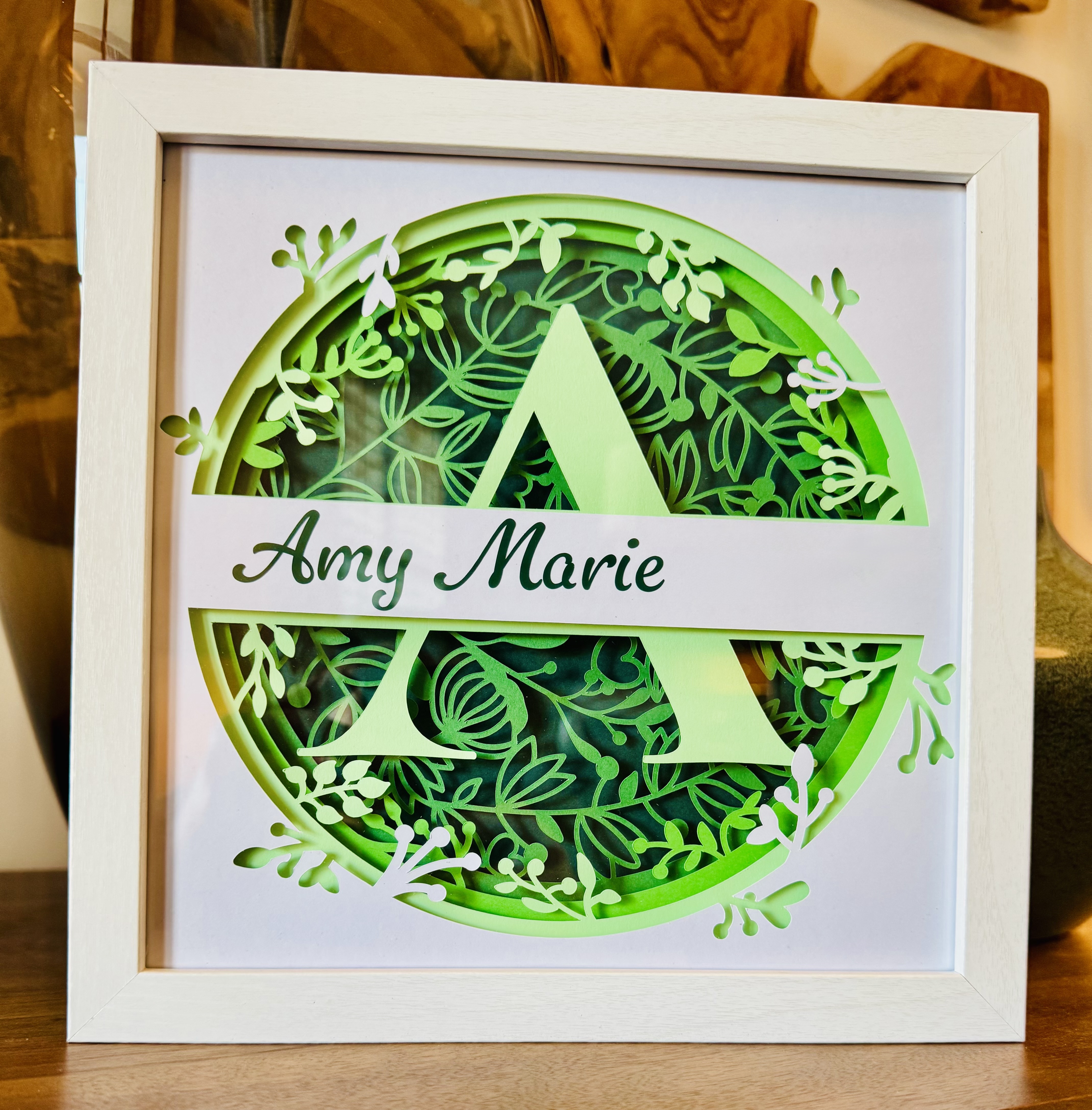 I’ll start by sharing this beautifully green shadow box I created for my step-daughter for her birthday. She absolutely loves the color green. So after creating this multi-layered green monogram shadow box, I used vinyl to place her name on the place card in the center of the box. I love the way the green vinyl had a shine to it that made her name shine through. (I did remove her last name from the picture, before sharing, to protect her innocence.)