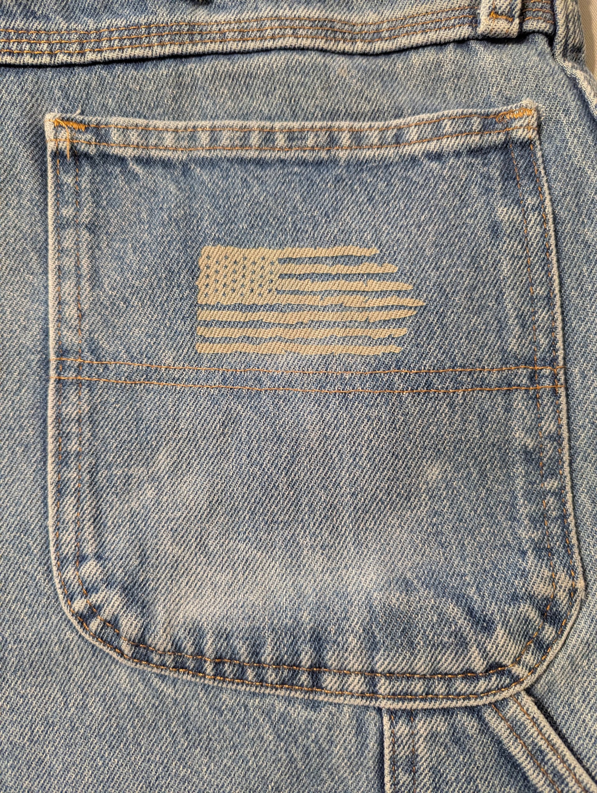 Hereâs Bobâs yard working hat so donât mind how gross it is. I forgot to switch the material on the first pass, which default to basswood, so I ran a second pass using the denim setting. Shouldâve stopped after the first pass. Later last night, the two little dots on one of the Bâs fell out but I can touch those up with a sharpie. The second is on a junk pair of jeans. I think this looks pretty cool and now I want to get a little toddler jean jacket for my granddaughter and add some hippie flowers or something to it. Hats are tough, though. Trying to lay it flat is challenging and Iâll have to think of how to make a jig to avoid twisting and flattening it.