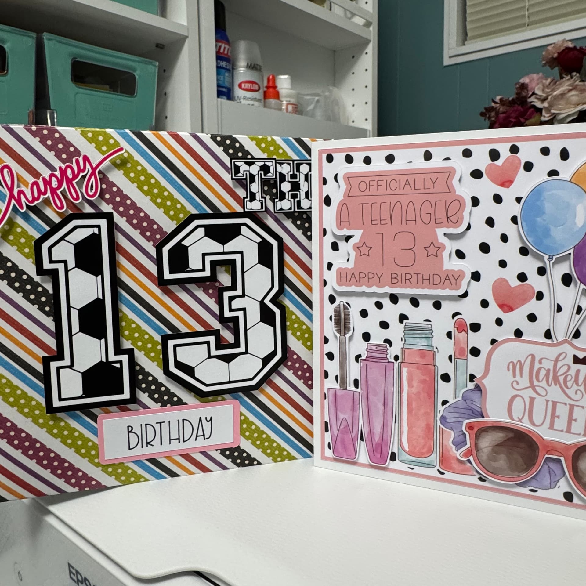 Day 25 - Thankful! Today my daughter turns 13 â officially a teenager! I made her a birthday card using printâandâcut with foam tape for dimension, plus a custom envelope featuring her favorite sports. I decorated it with a soccerâthemed number design in black adhesive vinyl and added âhappyâ and âbirthdayâ cutouts to finish it off.