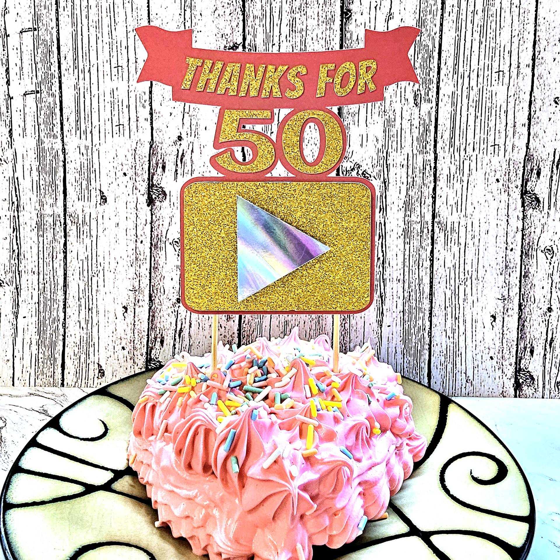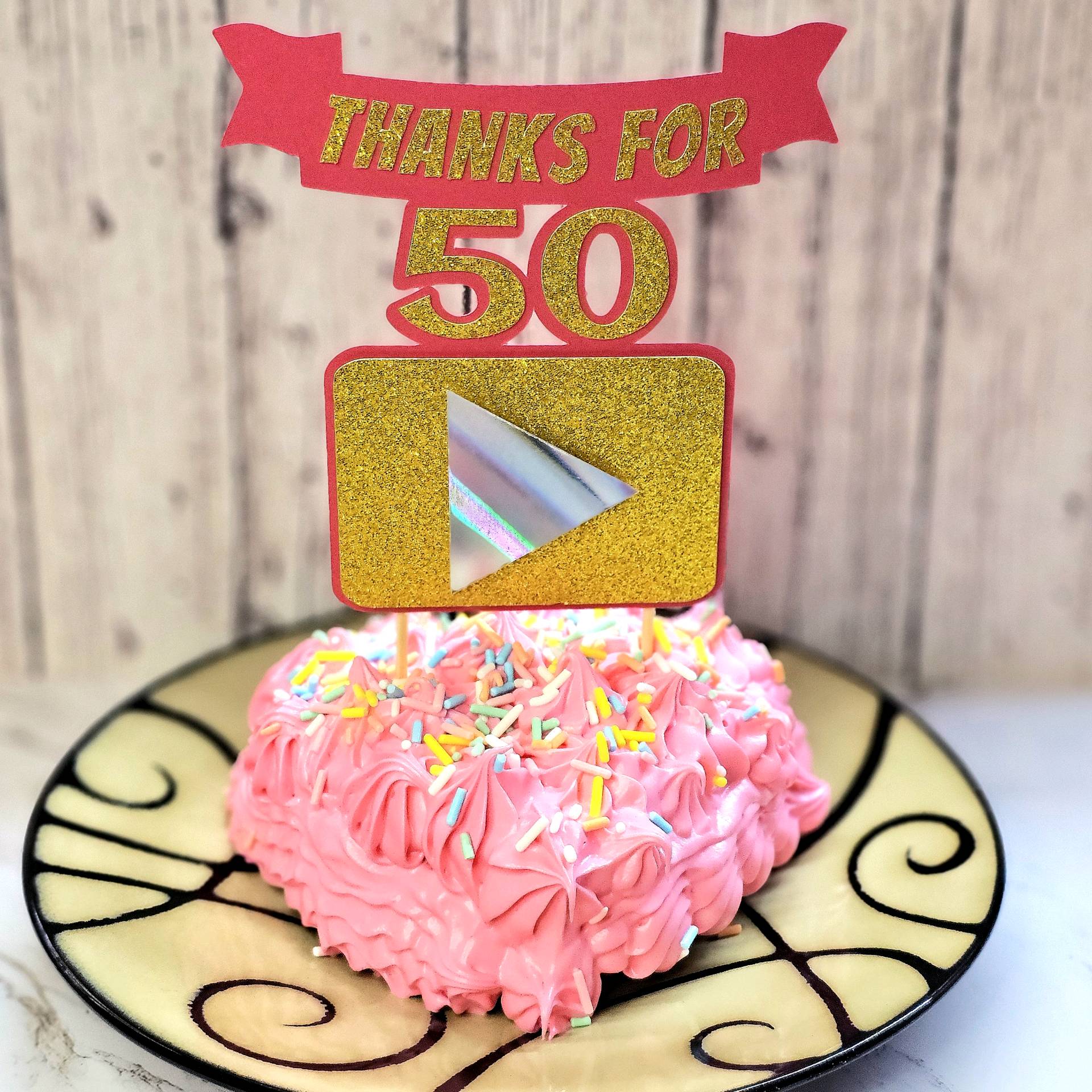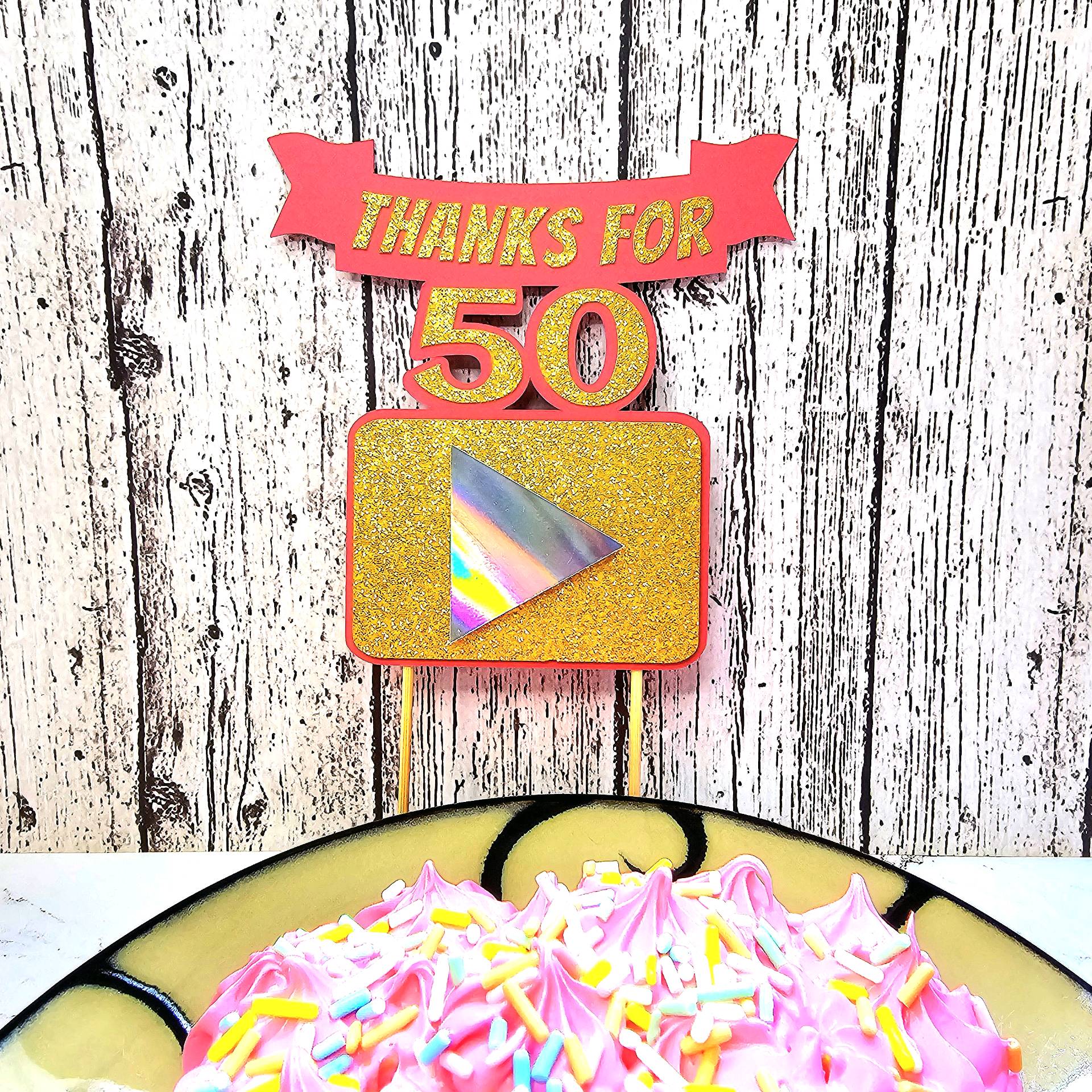 The topper features a glitter‑gold rectangle with a holographic play‑button icon to represent YouTube, framed with a red cardstock outline for contrast. The text is cut from coordinating cardstock and layered for dimension. Everything is attached to a single backing layer for stability, and I used trimmed wooden skewers hot‑glued to the back so it stands securely on top of the cake.
