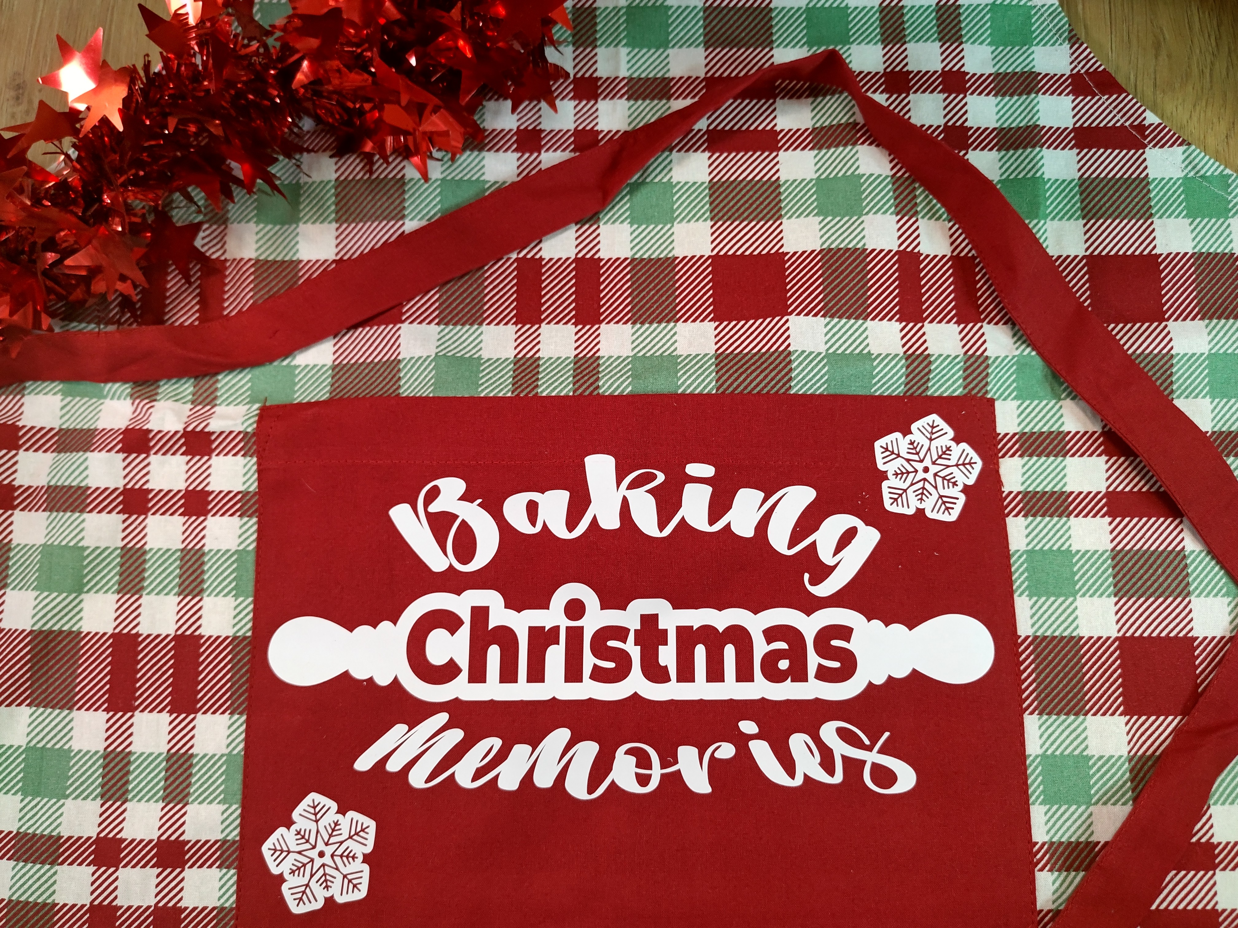 Whip up holiday magic in this charming Christmas apron! With its vibrant red hue, playful snowflakes, and the heartwarming phrase “Baking Christmas Memories” nestled inside a festive rolling pin, it’s made for joyful kitchen moments. Whether you’re frosting cookies or stirring up traditions, this apron wraps every recipe in seasonal spirit and nostalgic cheer.