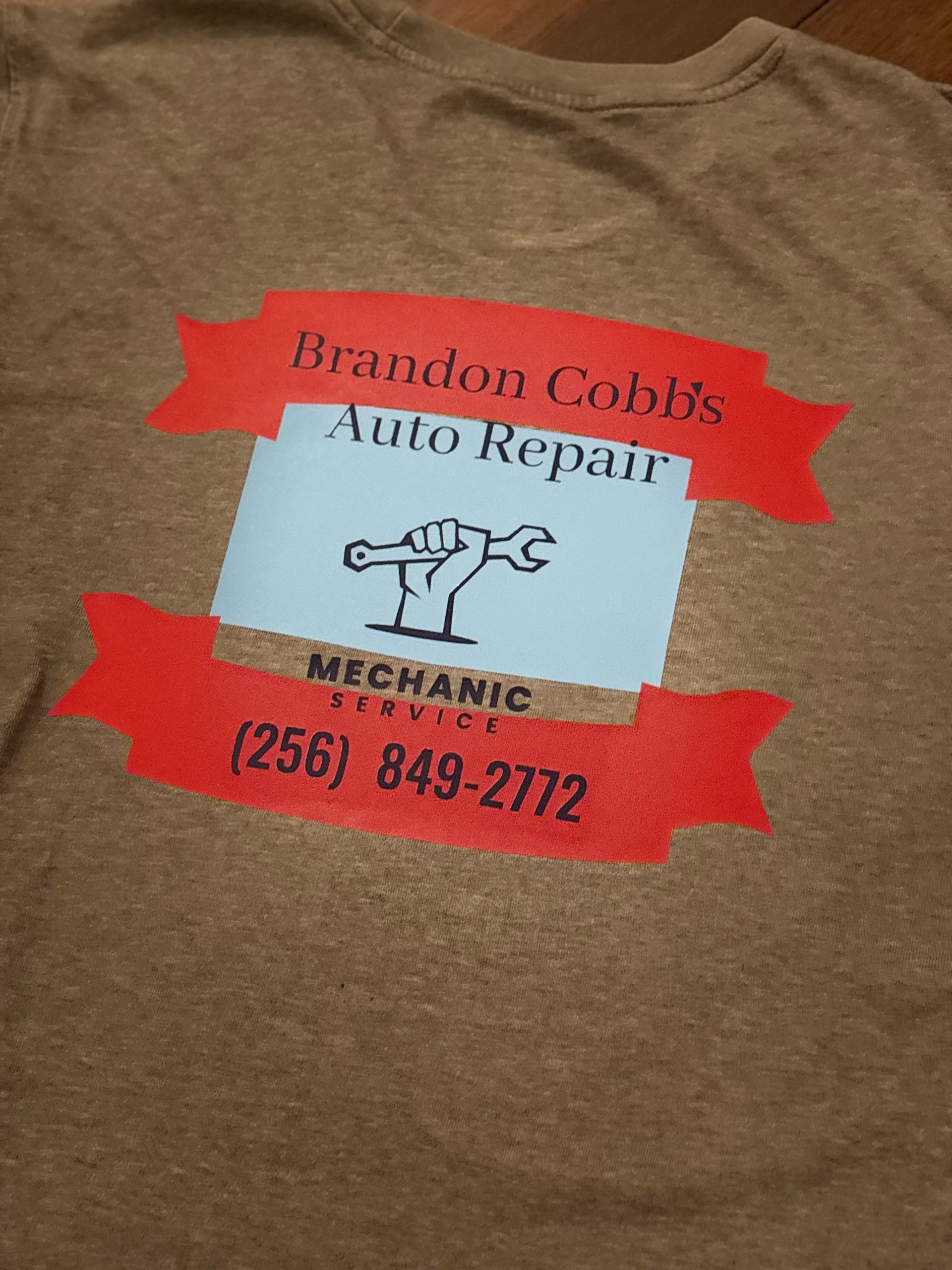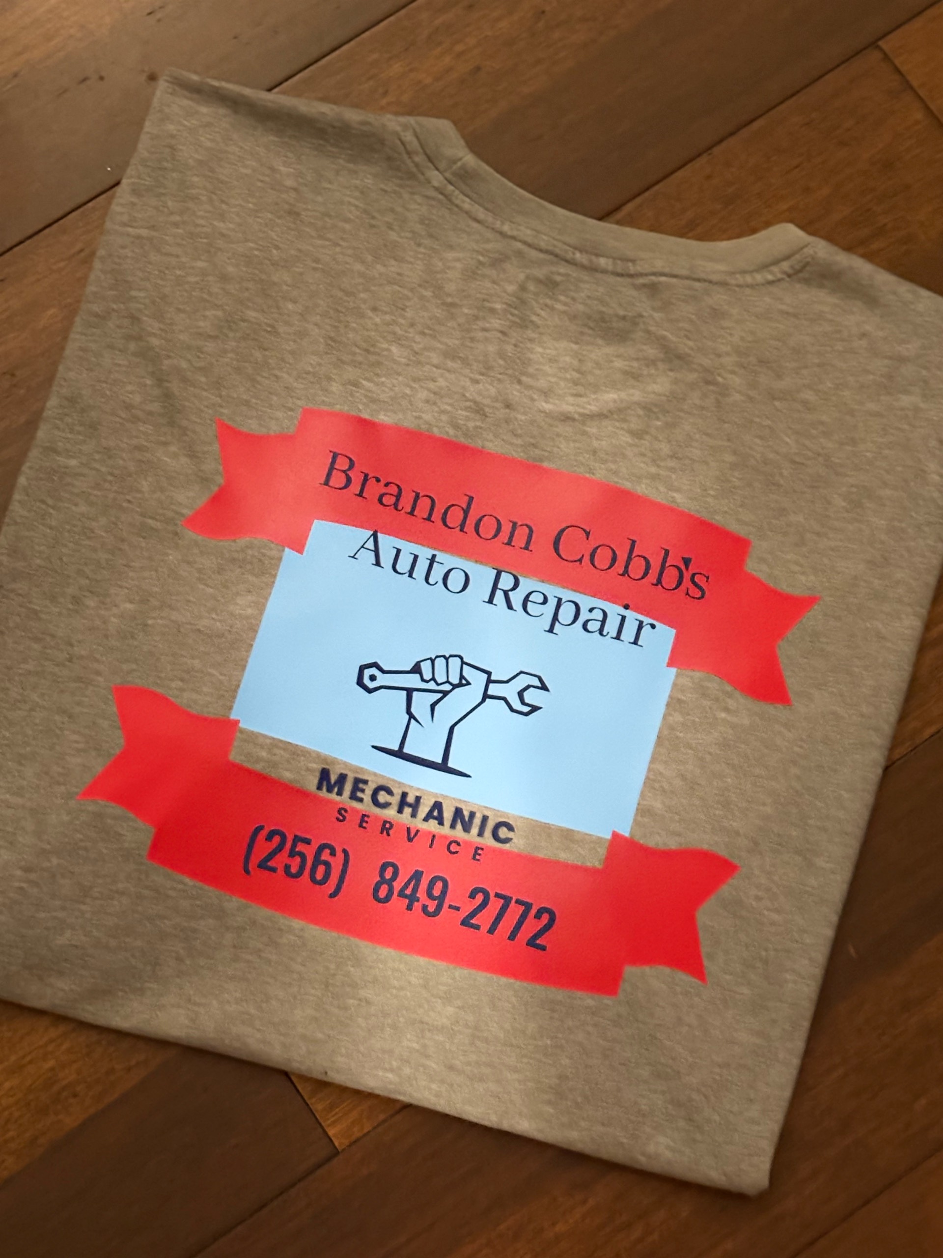 The bold banners symbolize reliability and professionalism, while the wrench-in-hand graphic stands for a mechanic who isn’t afraid to get his hands dirty to take care of his customers. This isn’t just a logo on a shirt — it’s a reflection of commitment, skill, and providing for family through hard work.