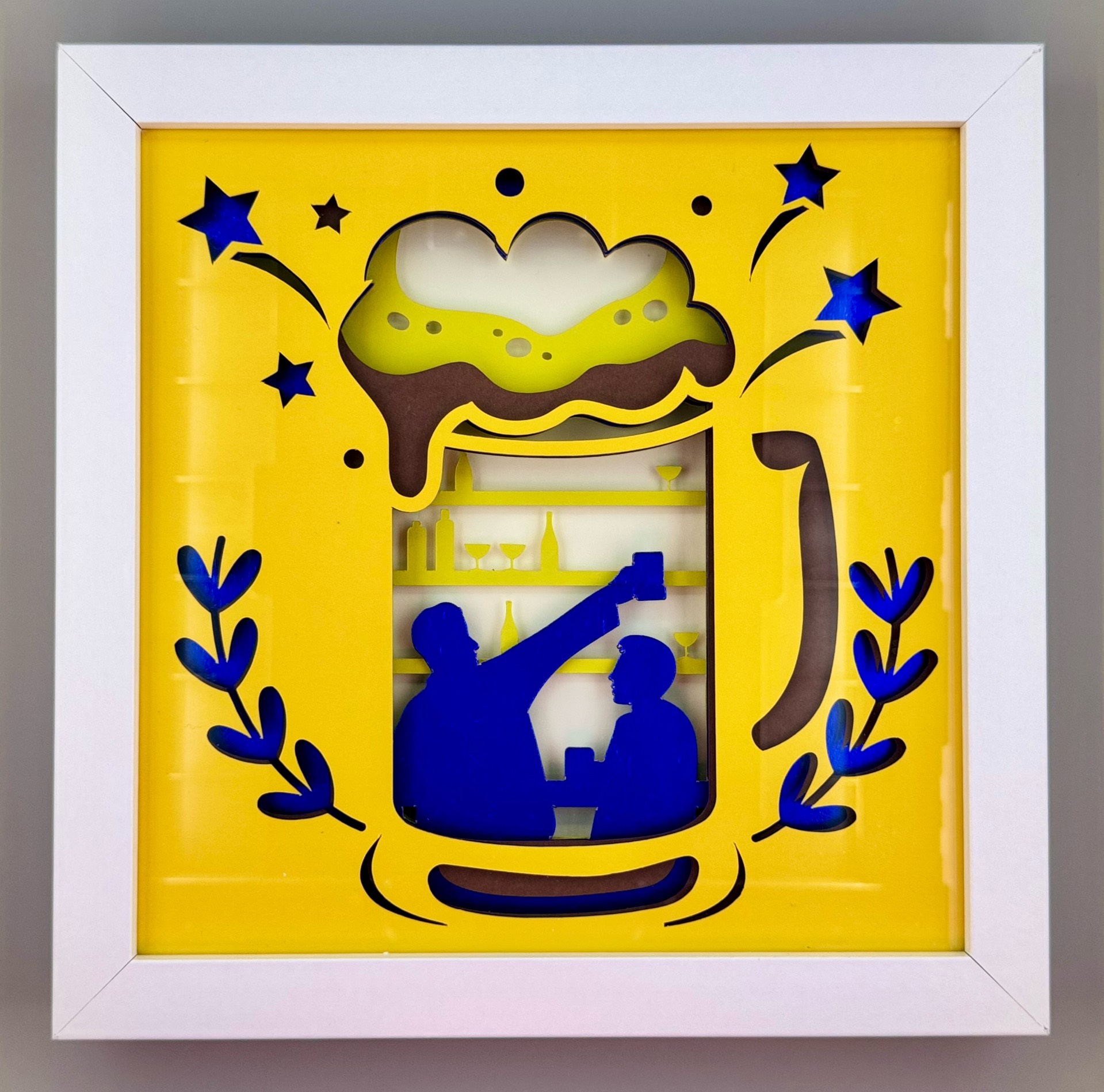 This playful and vibrant shadow box captures the spirit of celebration in the most joyful way, turning a simple toast between friends into a glowing work of art. Built from layered cardstock and framed in crisp white, this design centers around an oversized frothy beer mug that feels almost animated with personality. The bright, golden yellow background instantly sets the scene with warmth and sparkle, echoing the color of a freshly poured brew catching the light. A foamy white and green “head” spills over the rim in soft curves, adding whimsy and movement, while bold blue accents bring striking contrast and balance throughout the piece.