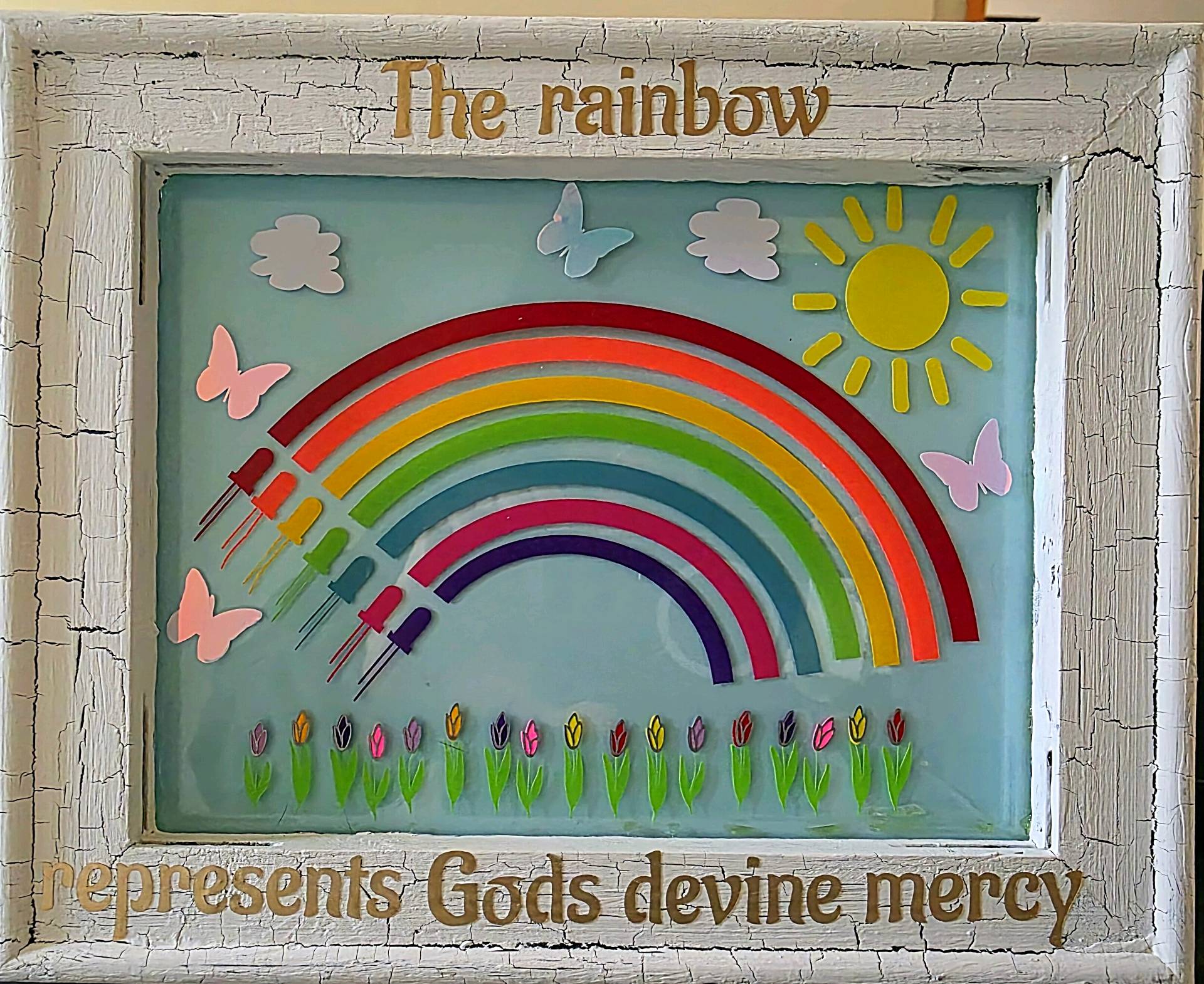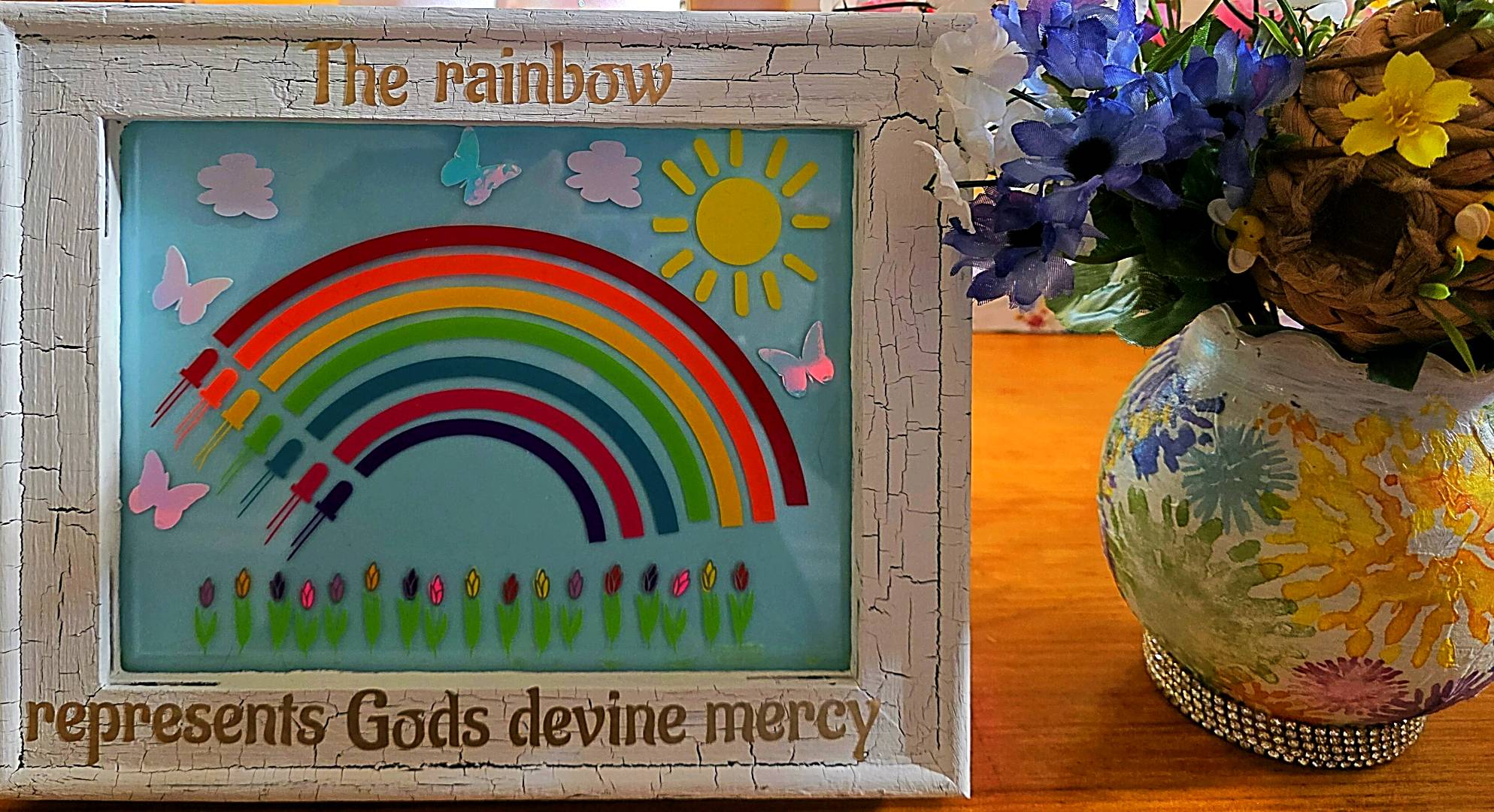 Description: I used a frame that was leftover from a smash frame project. I painted it with 1st black chalk paint & let it dry, then painted school glue on it, let that get tacky then painted white chalk paint and dried it with a blowdryer & boom crackles. I had no idea where to go from there for quite awhile then rainbows came to mind & since the frame had no matching glass or backing. I found an acrylic frame in my stash & applied the vinyl to it then added a sky blue piece of paper for the background. I glued the frame to the frame which worked better than I thought because I had no way to add a stand but the acrylic frame had a stand. Love it when it all comes together without a plan.