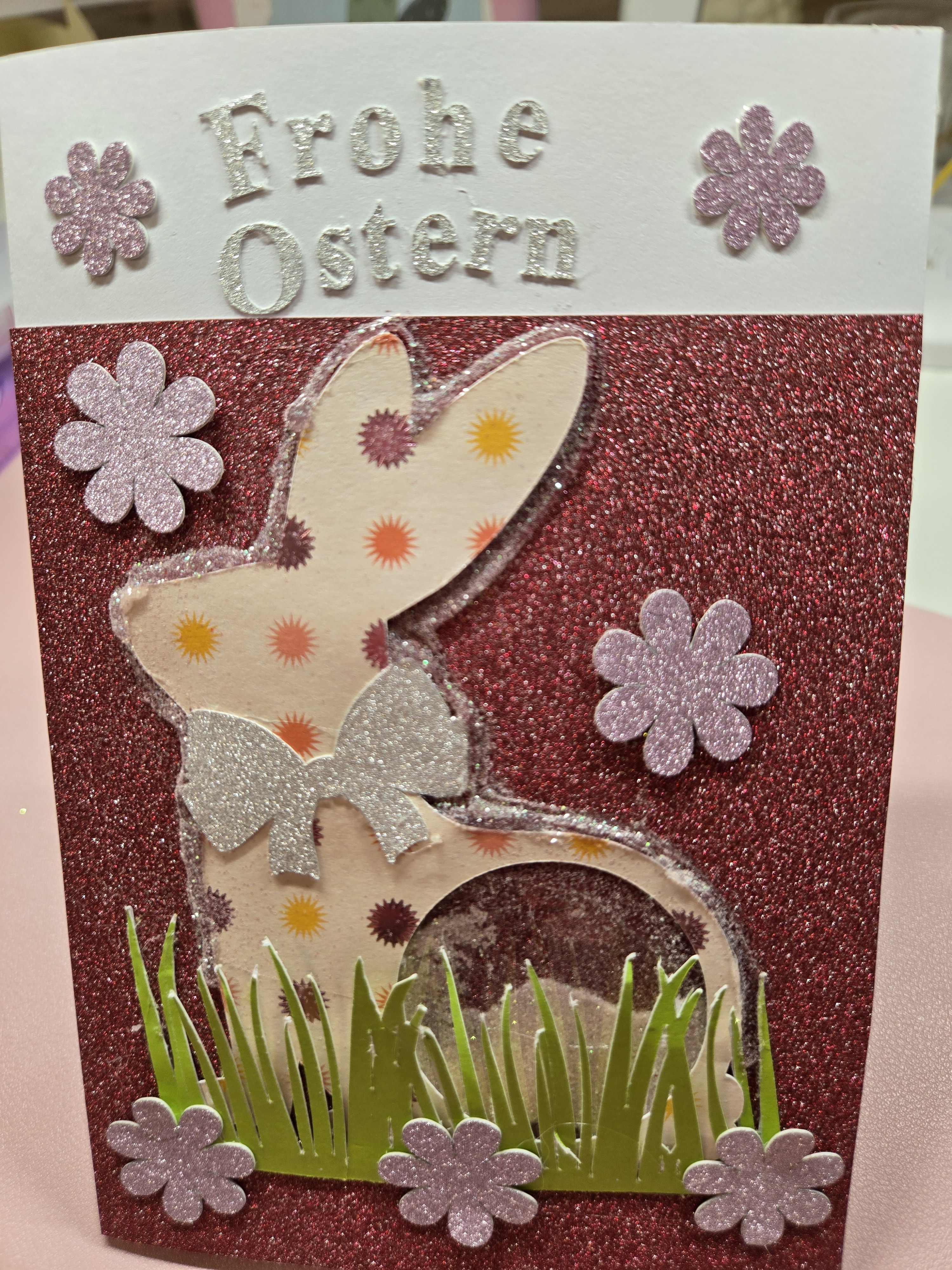 My inspiration was to make an unusual card for Easter.I stuck laminating film behind the rabiits belly and then added glitter between the card and the rabbit.Finally i went arround the rabbit with hot glue and sprinkled glitter onto the liquid hot glue.