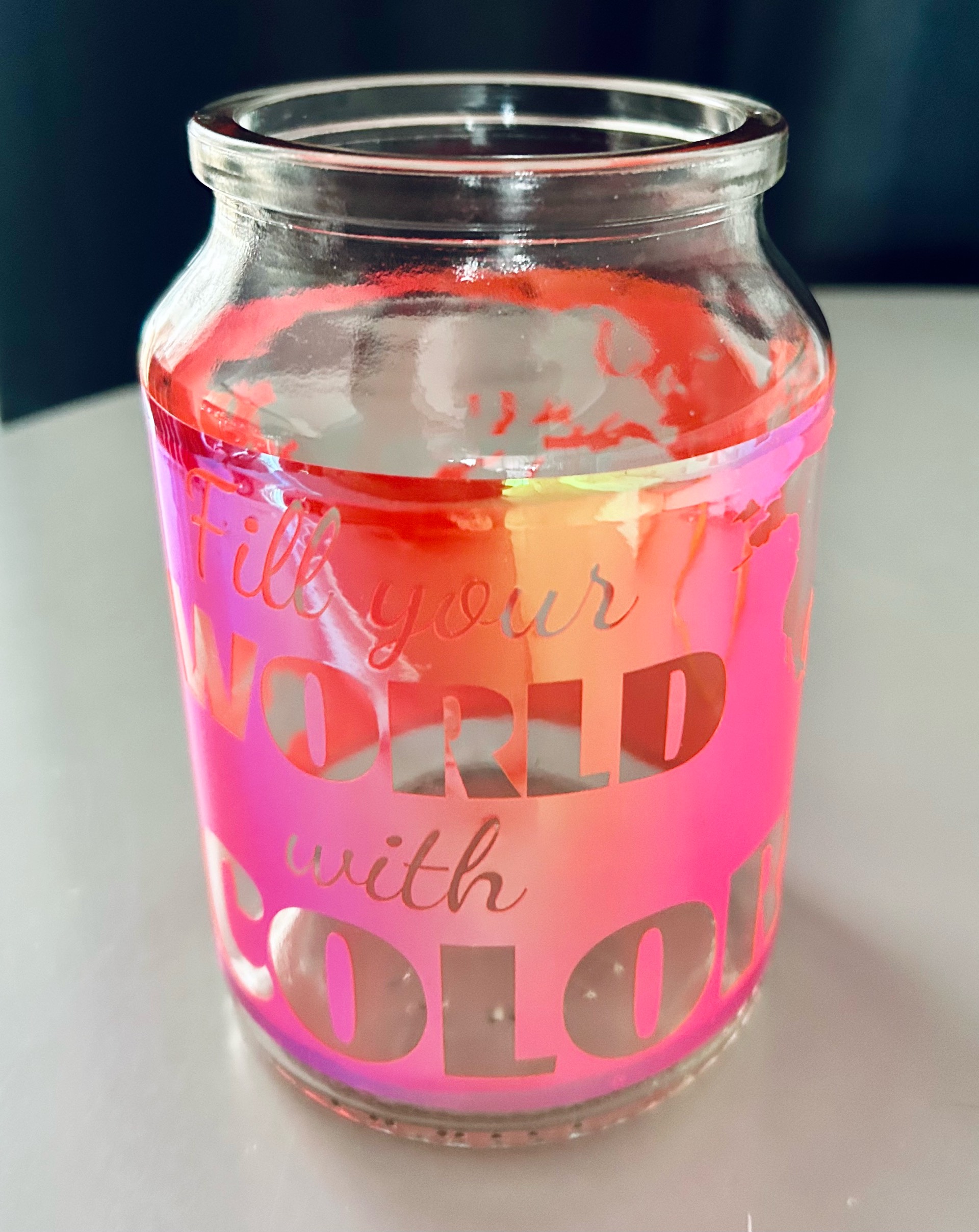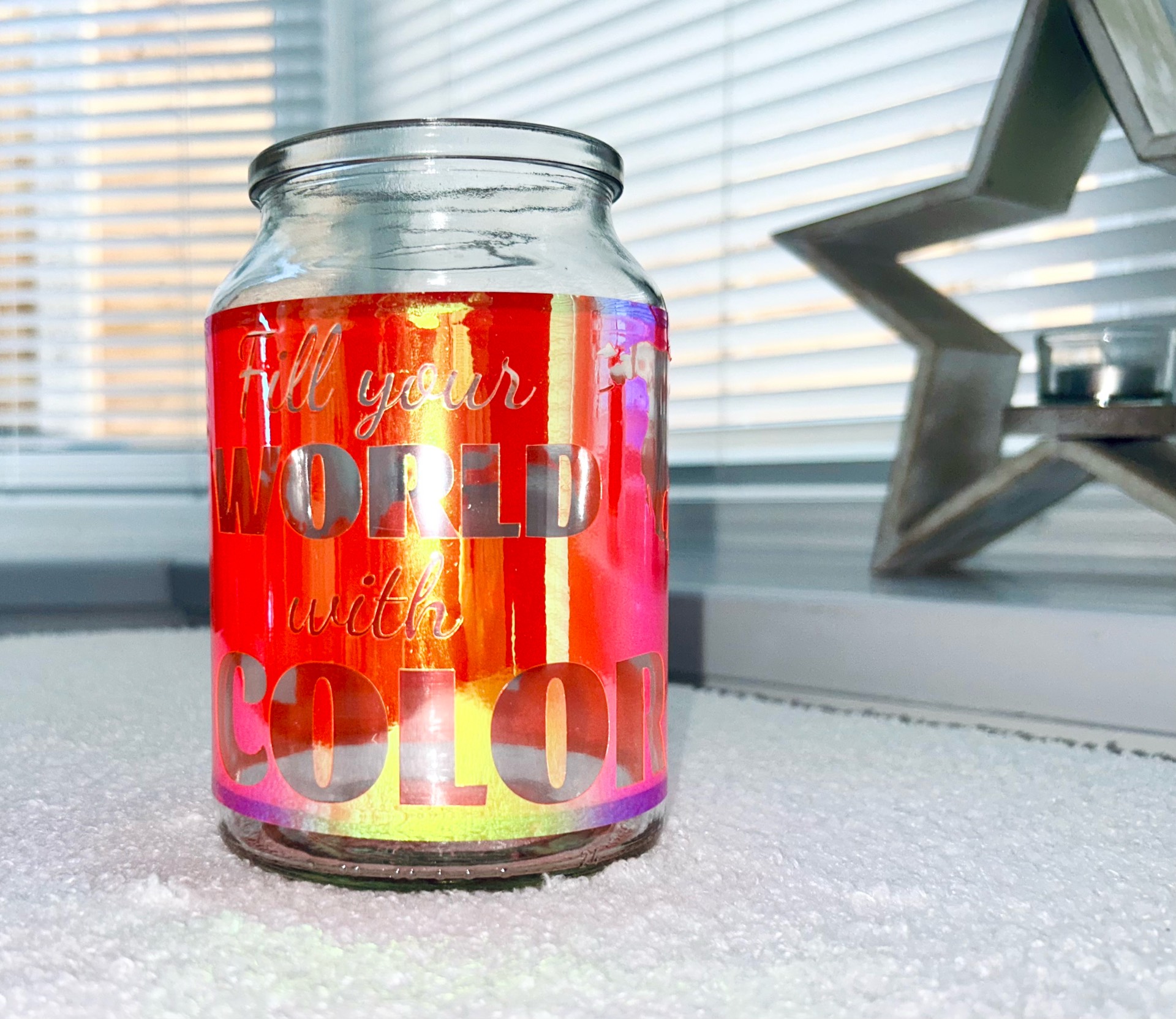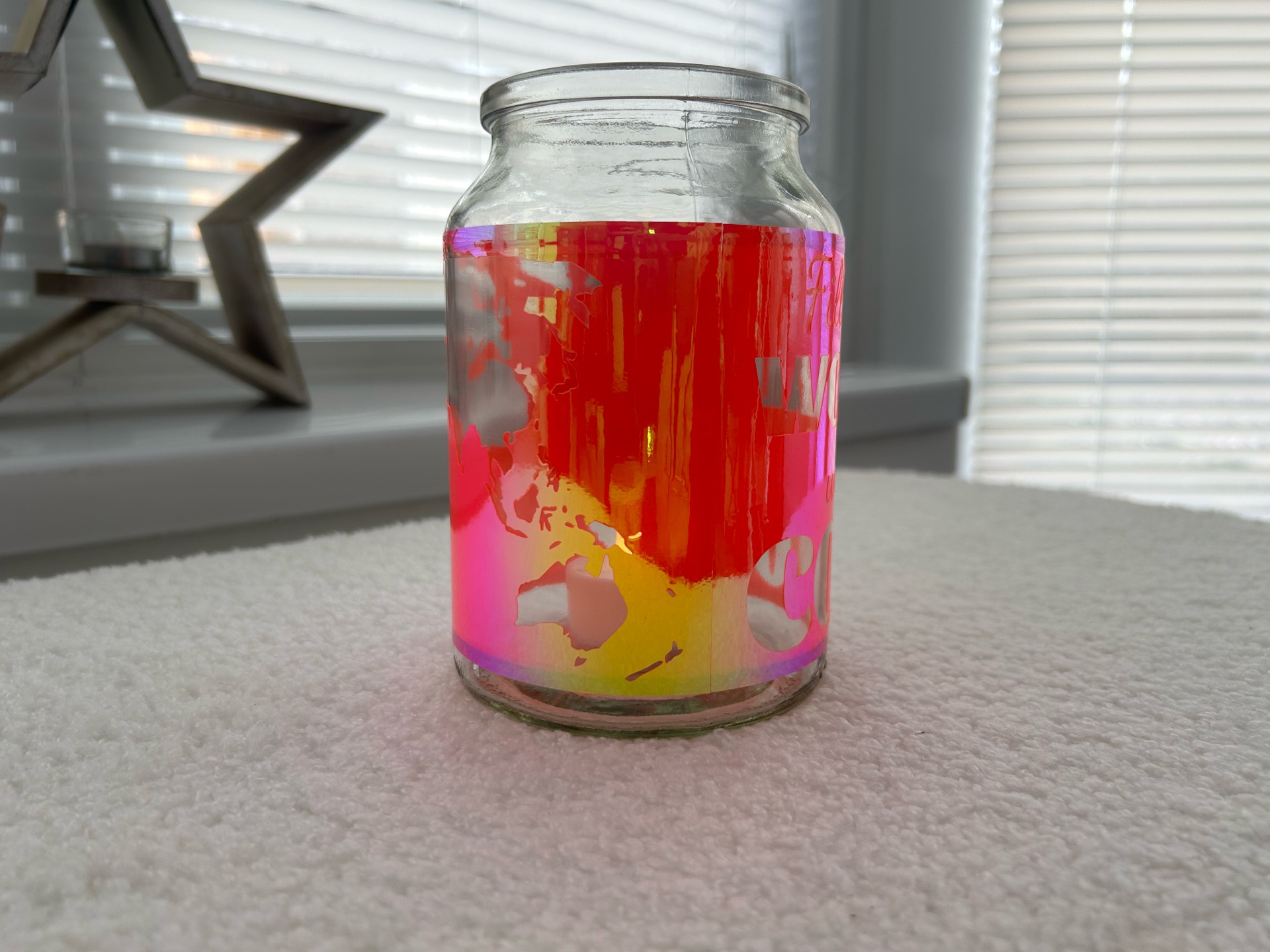 The project was made with HTVRont chameleon permanent adhesive vinyl on my LOKLiK Crafter. The cut vinyl was transferred to a clean repurposed coffee jar, with a small battery operated tealight.