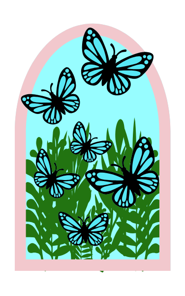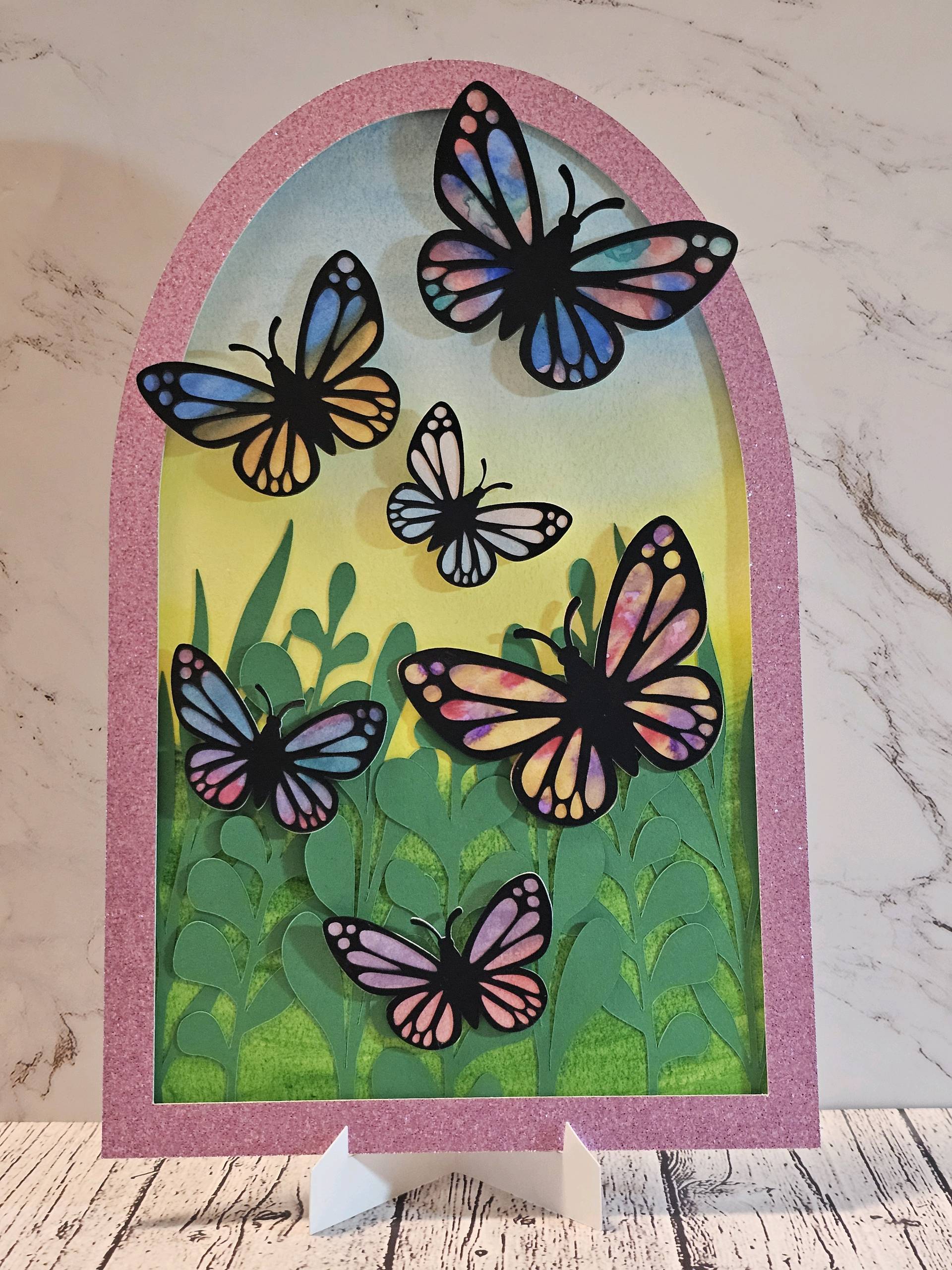 This freestanding dimensional display captures a moment of gentle motion, with hand‑painted butterflies appearing to float inside a glittering arched frame. The background is created on watercolor paper using soft blended washes, transitioning from green to warm yellow to cool blue for a natural, glowing gradient. Each butterfly is painted with a mix of traditional and metallic watercolors, then layered under black cardstock to create crisp outlines and depth.