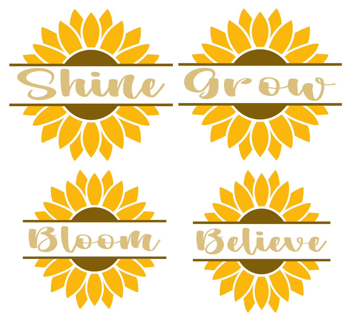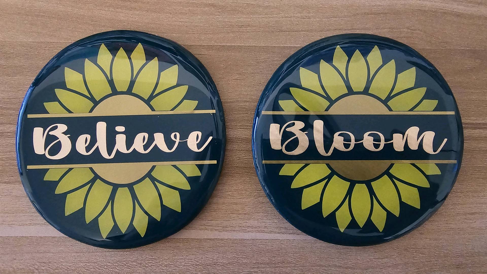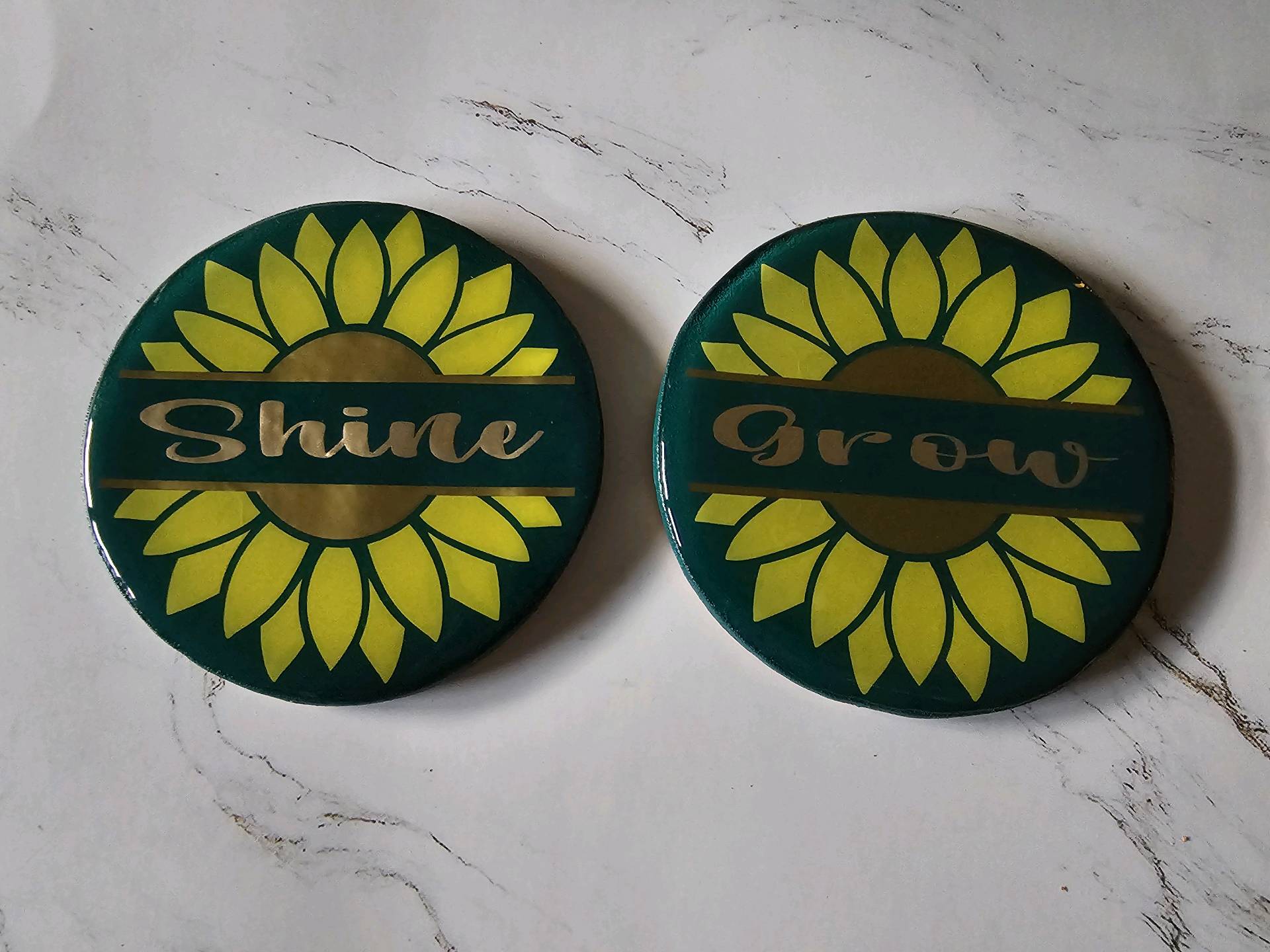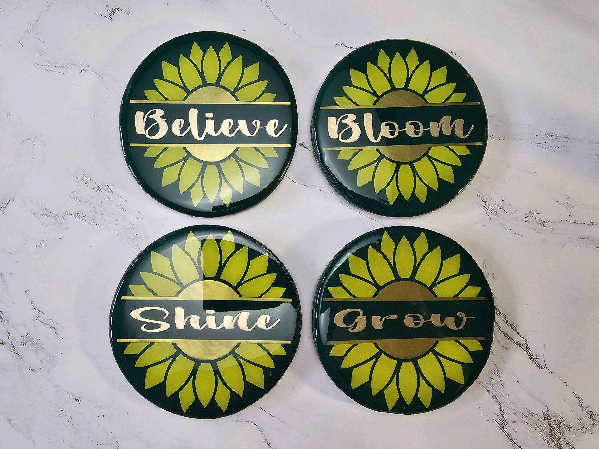 This four‑piece handcrafted coaster collection is designed to bring warmth, encouragement, and golden light into everyday spaces. Each coaster features a vibrant sunflower layered with permanent adhesive vinyl in rich yellows and metallic golds, set against a deep teal painted base. The uplifting words Bloom, Believe, Shine, and Grow are cut from light metallic gold vinyl, creating a cohesive message of hope, growth, and positivity.