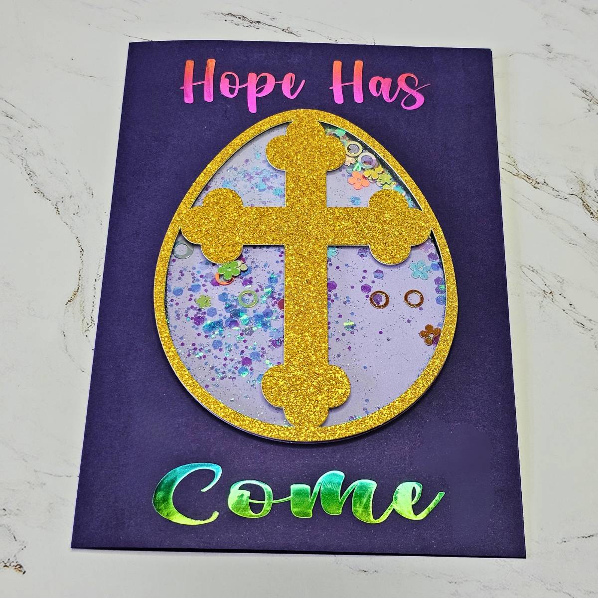 This Easter shaker card features a layered egg design with a glitter cross centerpiece and a bright, uplifting “Hope Has Come” sentiment. I created the shaker element by cutting a double‑layered egg, adding acetate, and building dimension with foam tape. The inside sentiment was finished with the Loklik Foil Kit for a smooth, metallic shine that pairs beautifully with the reflective elements on the front. Chunky glitter and specialty sequins bring the shaker to life, adding movement and sparkle against the deep purple background. This card blends faith, color, and texture into a joyful Easter greeting.