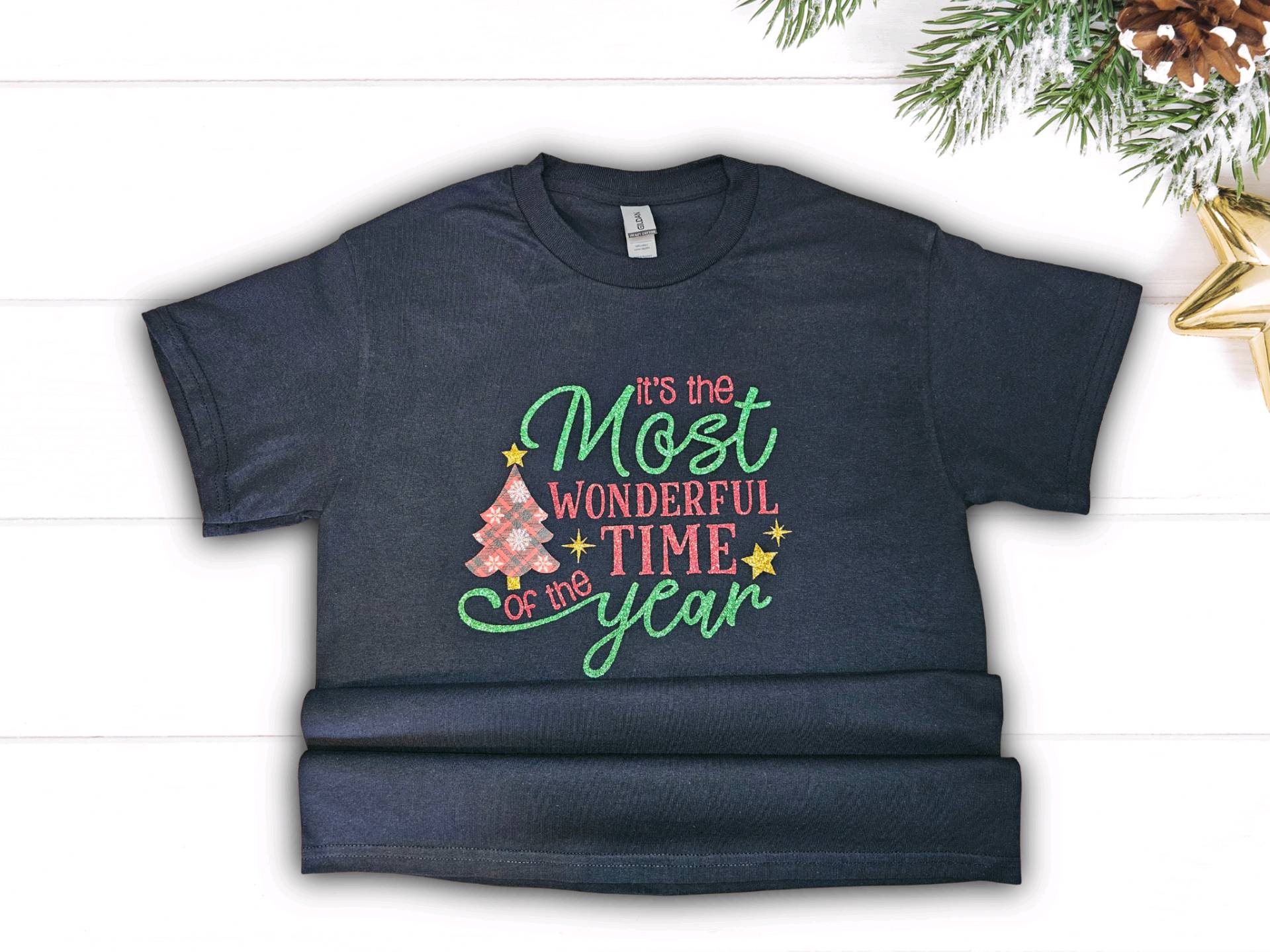 The phrase “It’s the Most Wonderful TIME of the Year” evokes the warmth and excitement of the holidays. With its crisp application and cheerful palette, it’s a wearable celebration of twinkling lights, joyful gatherings, and the timeless charm of holiday traditions.