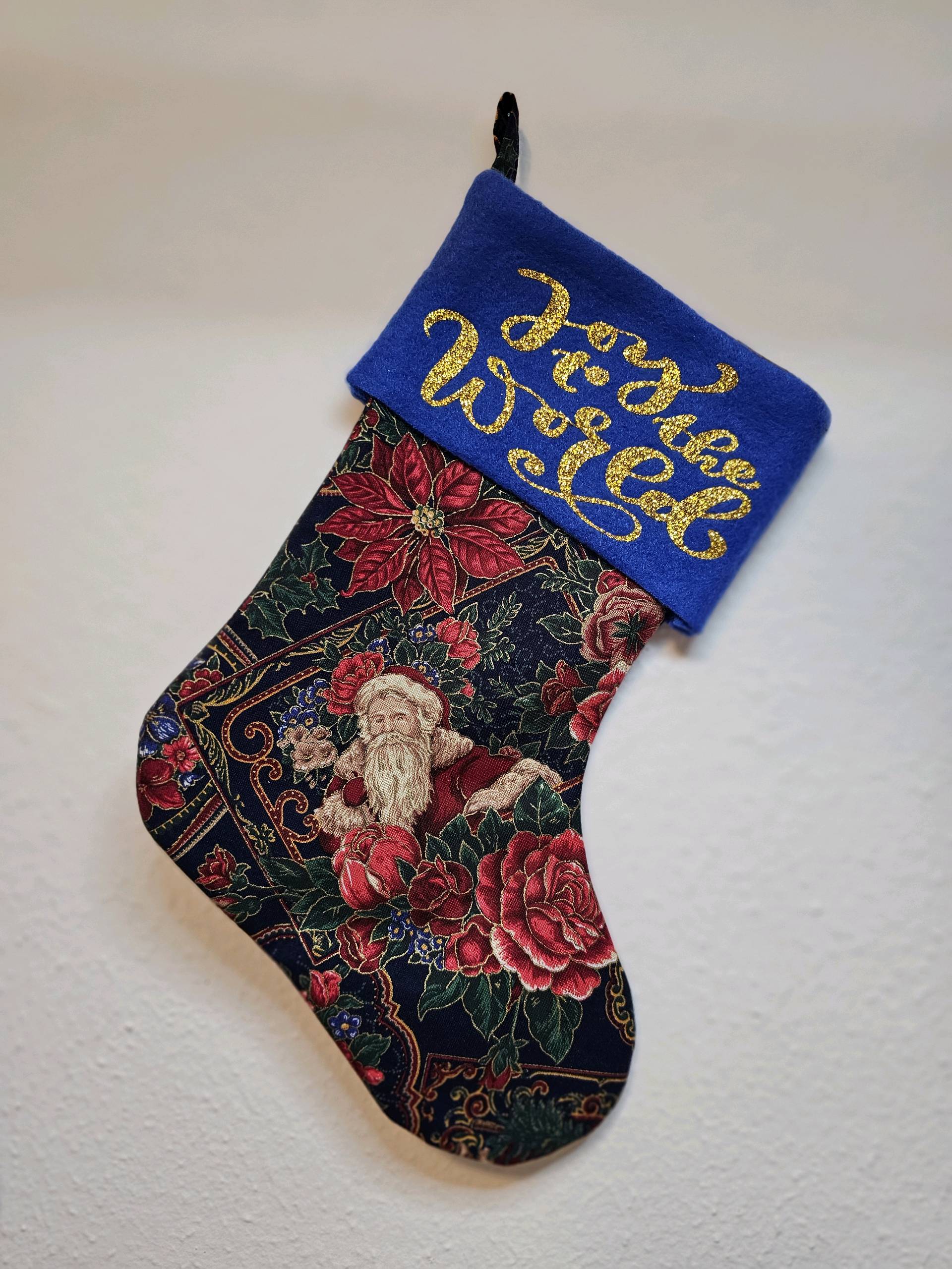 This festive stocking radiates warmth and tradition. It’s sewn from tapestry-style cotton featuring vibrant red poinsettias, roses, lush greenery, and a classic Santa motif. The cuff is crafted from soft blue fleece and adorned with glittery gold HTV script that reads “Joy to the World,” adding sparkle and reverence to the design.