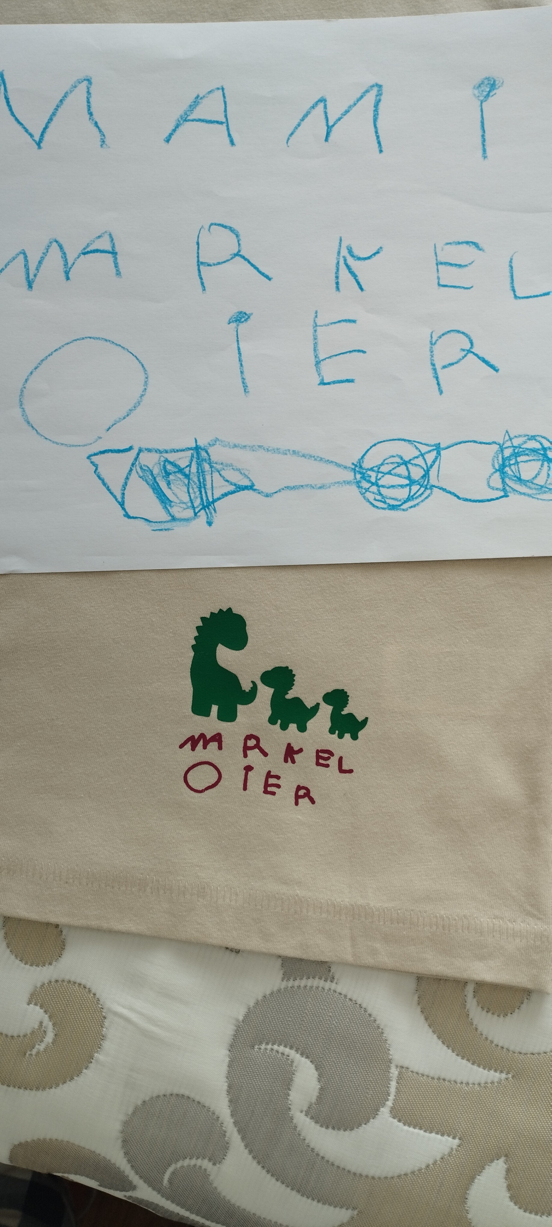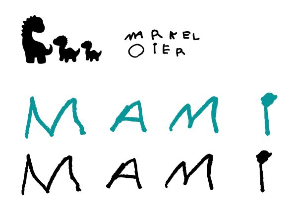 Realice un offset a las letras tanto de Mami como los nombres ya que no tenían trazos continuos para que no me hiciera micro cortes. Le añadí mama dino y mini dinos desde la biblioteca del programa porque me pareció una representación de que donde va mi amiga, los peques van detrás y están obsesionados con los dinosaurios últimamente.