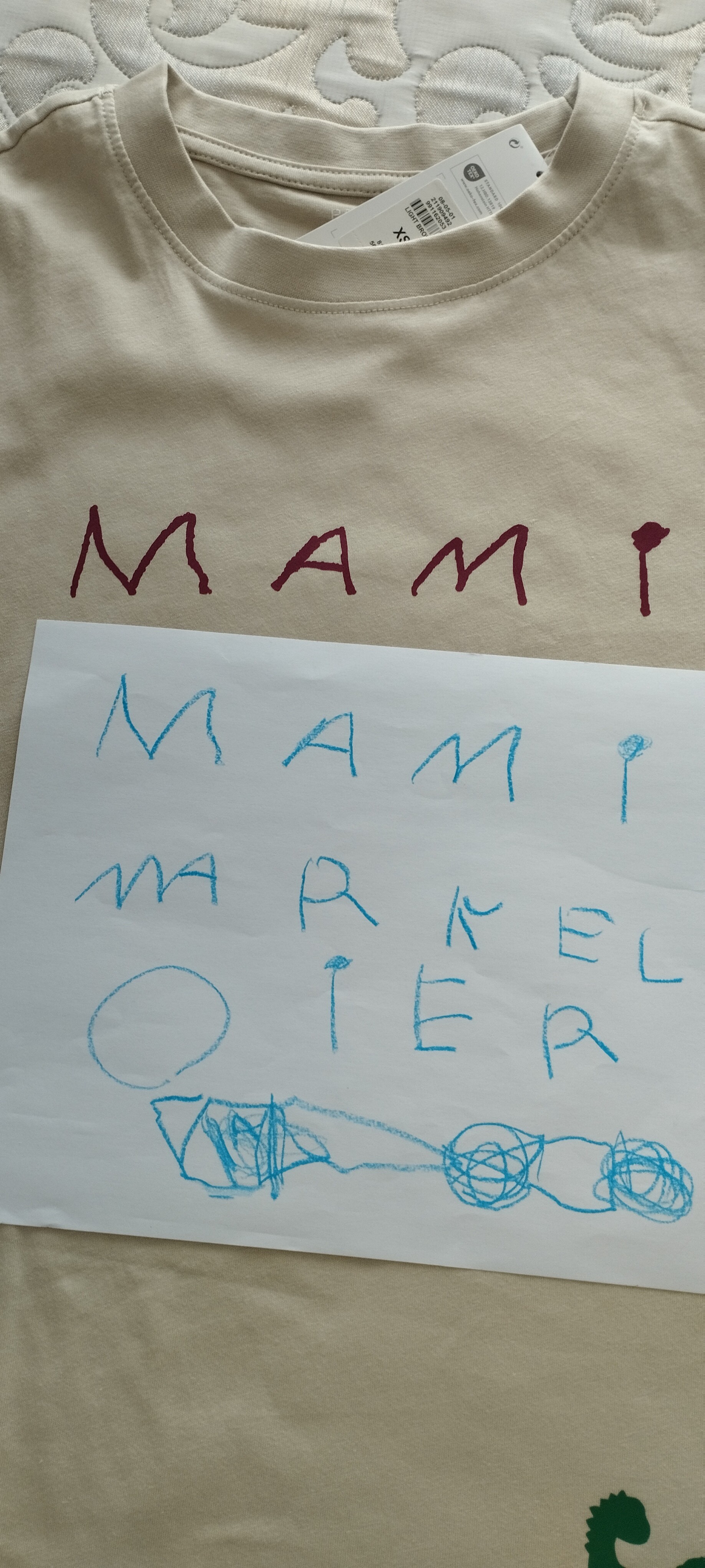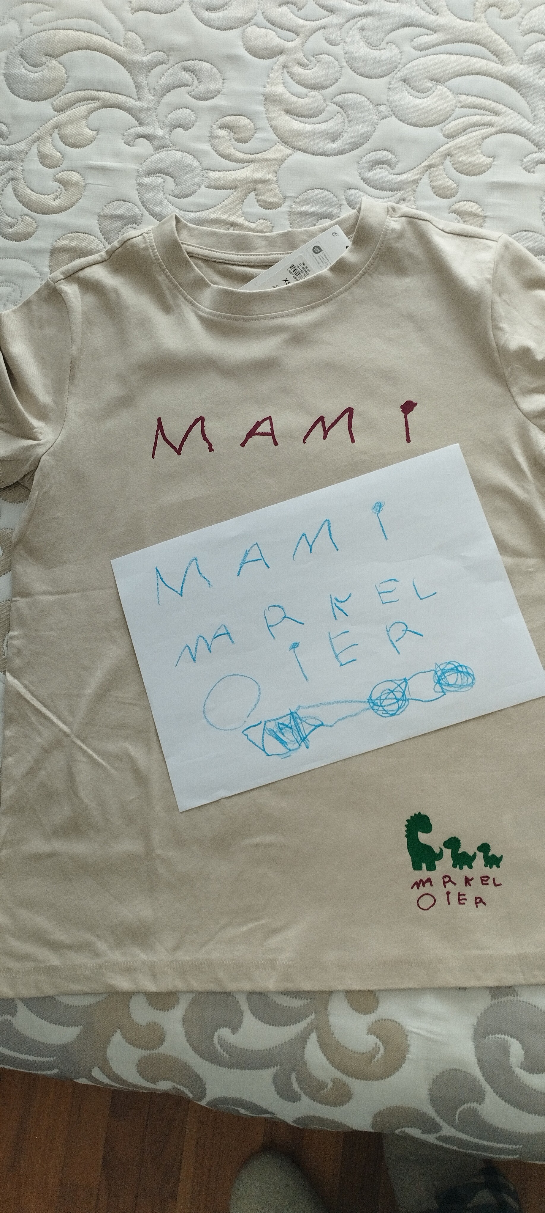 Con motivo del Día de la Madre, quería tener un detalle con mi mejor amiga que tiene dos niños, de 4 y 1 año. Le pedí al mayor que me escribiera mami y los dos nombres en un papel.