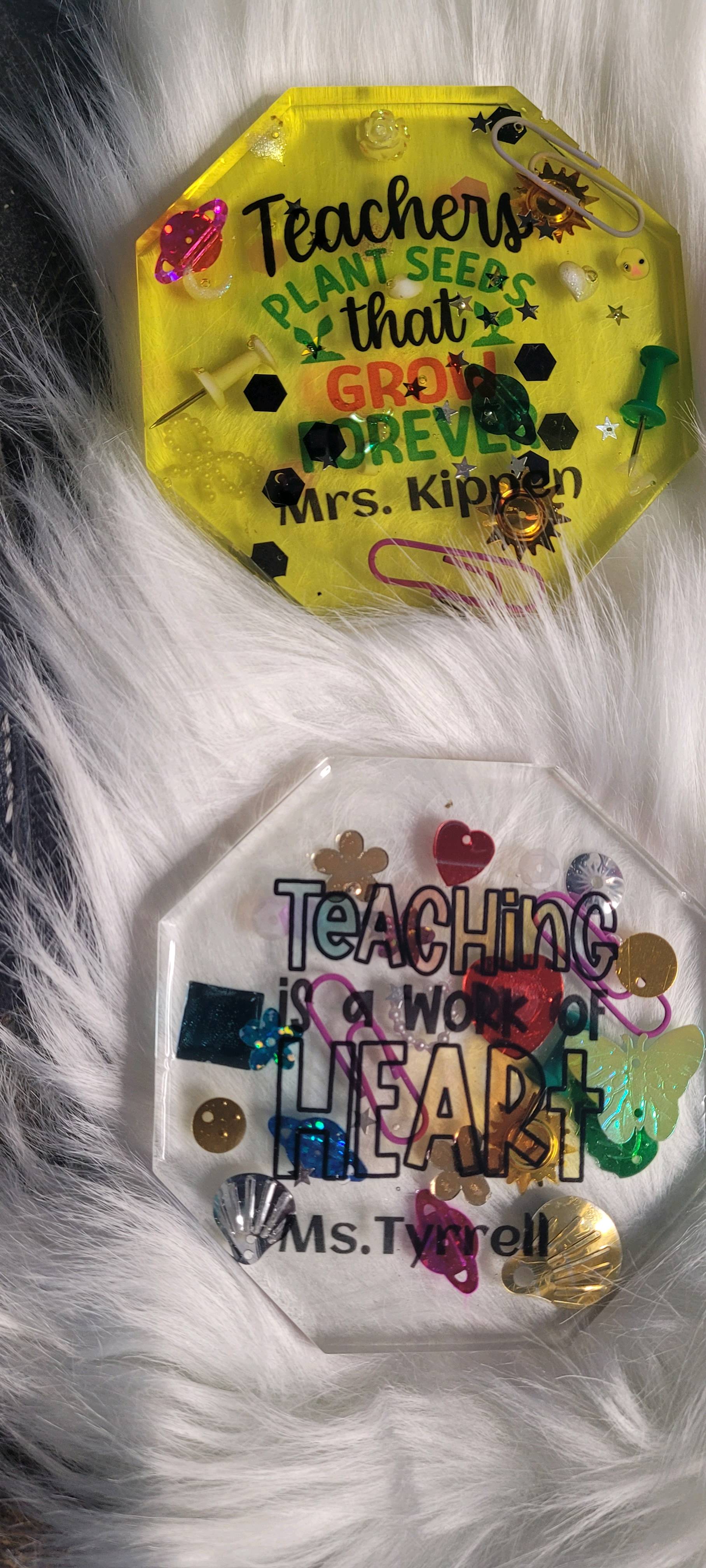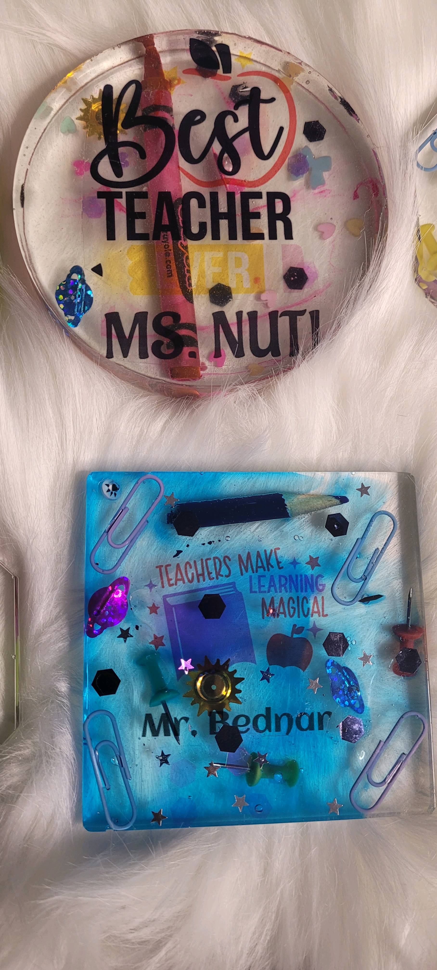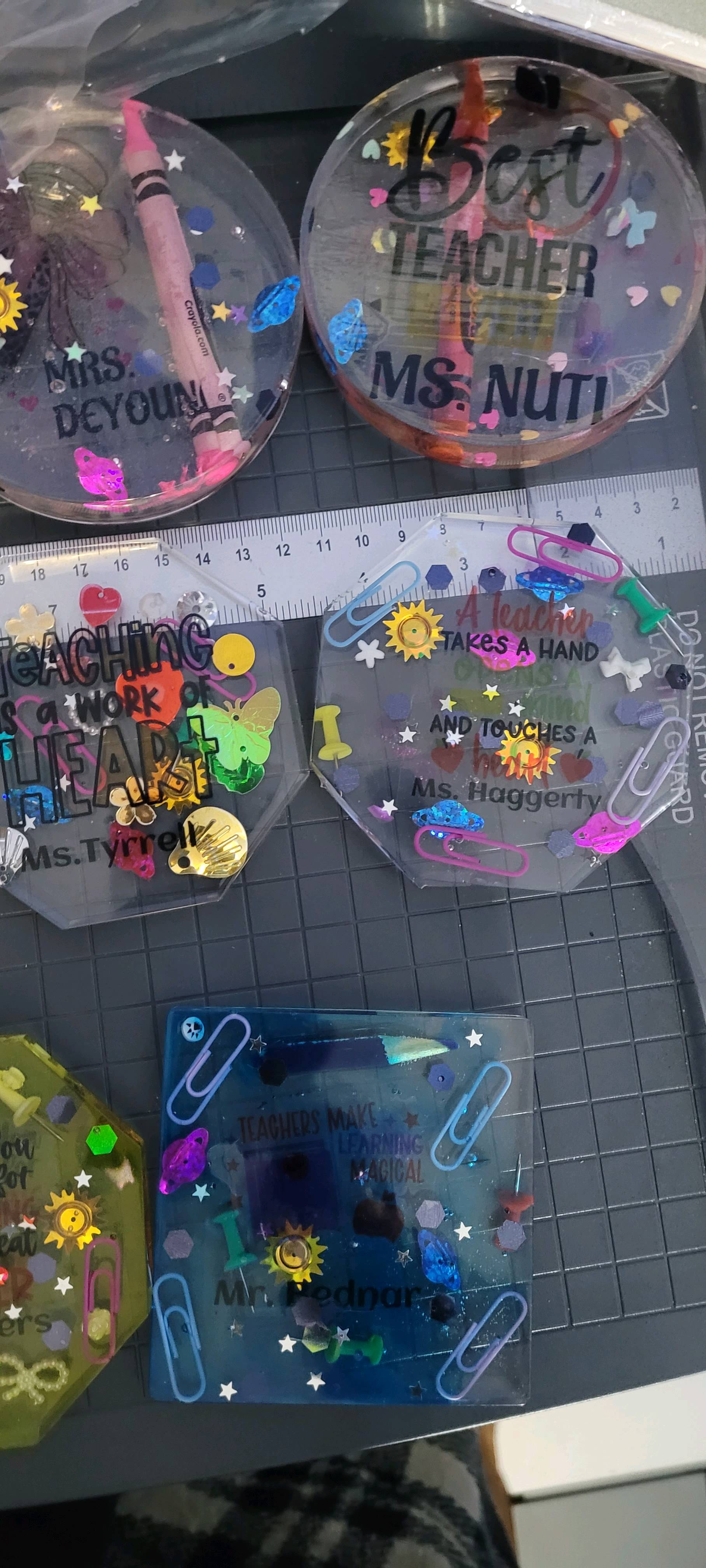 I made my very first resin coaster set, and I wanted them to be something special for Teacher Appreciation Day. I started with the teacher-themed designs from IdeaStudio and personalized each one with the teachers’ names. Before pouring any resin, I printed the designs onto HTVRONT sublimation stickers and pressed them at 335°F for 60 seconds with medium pressure with my auto heat press 2. They came out so clear and vibrant — the colors really popped.