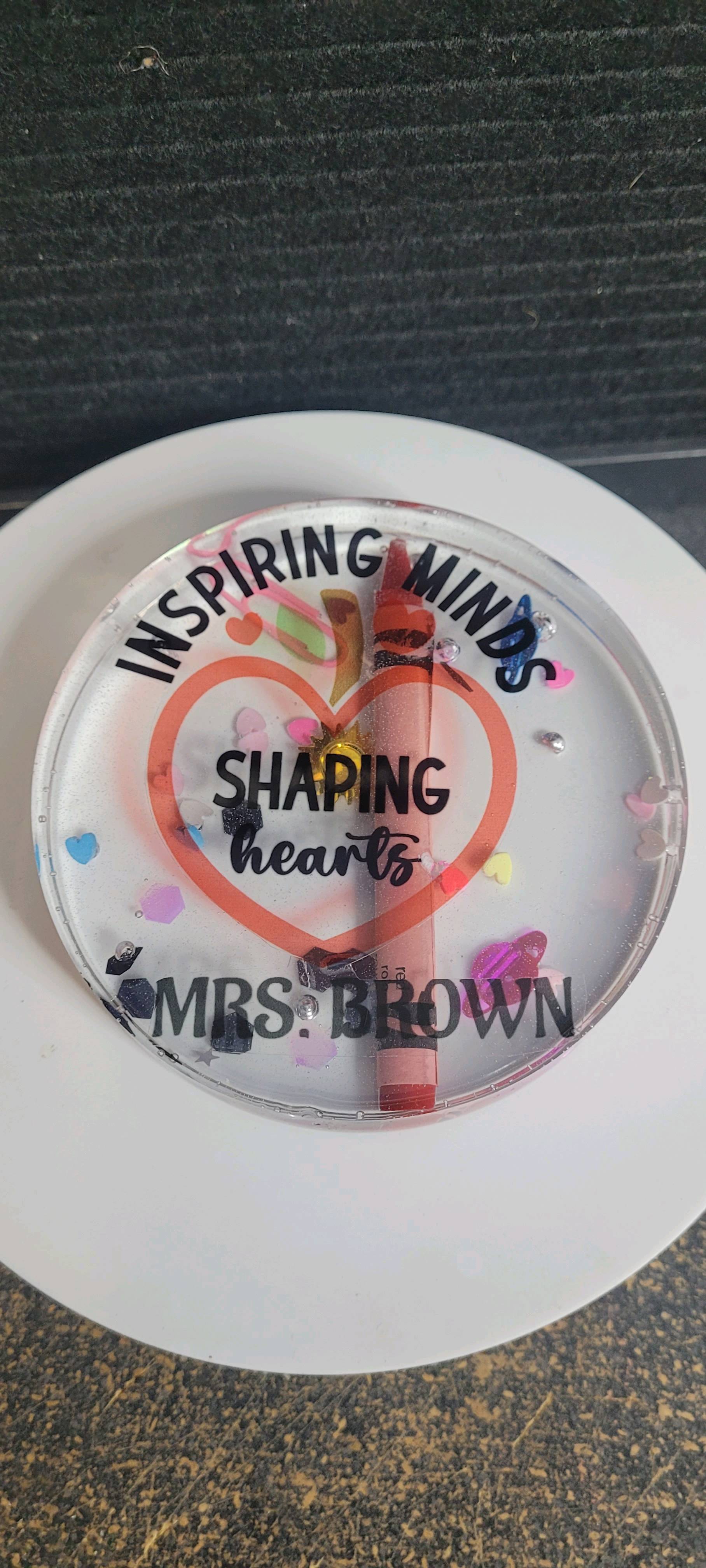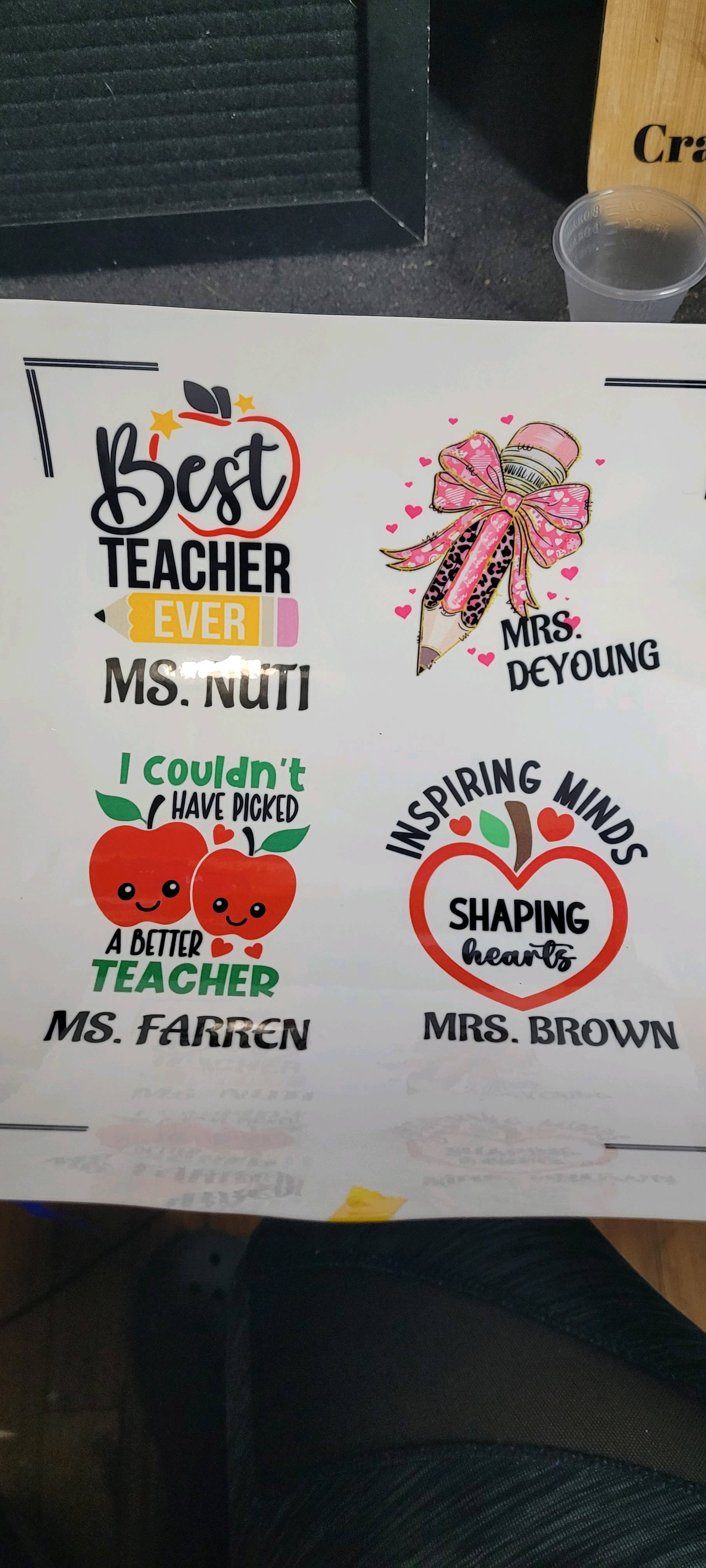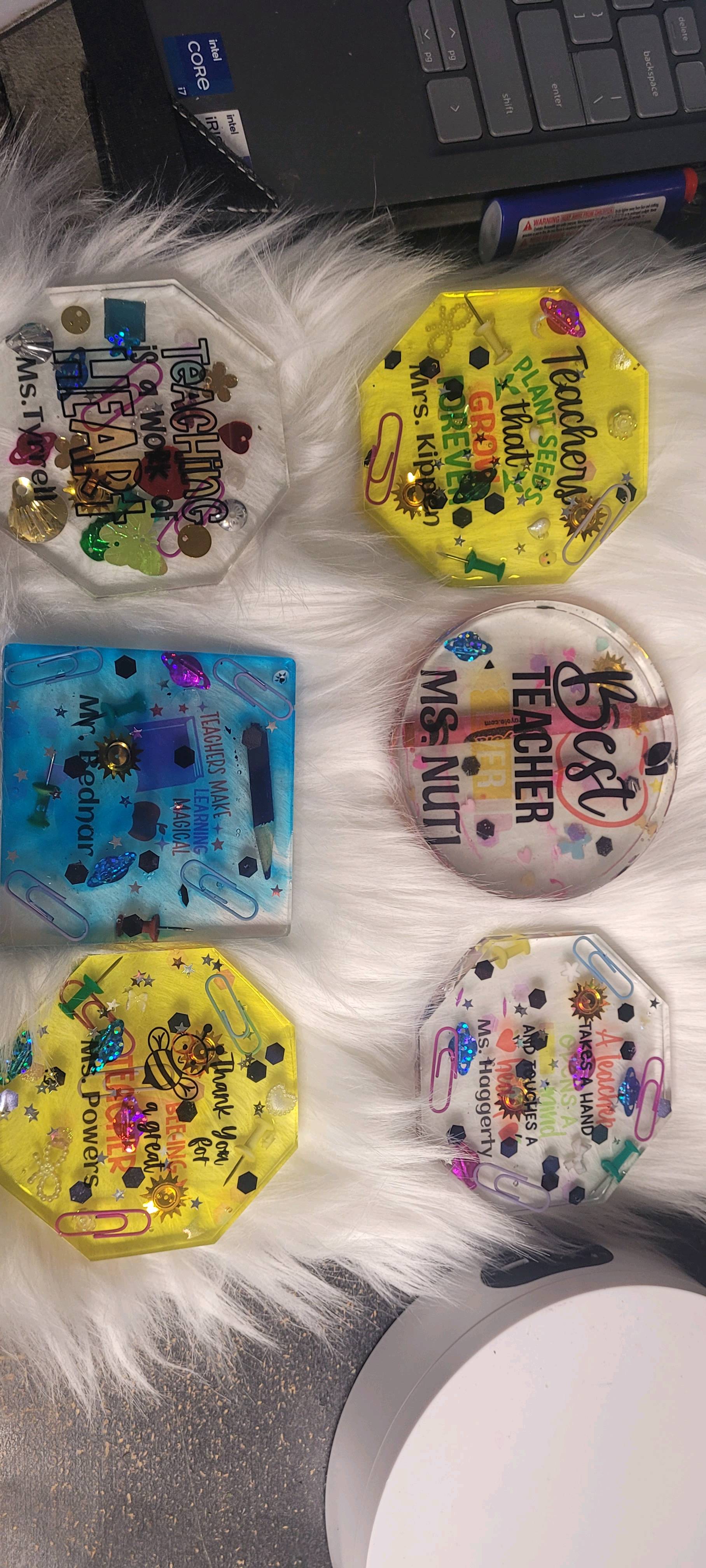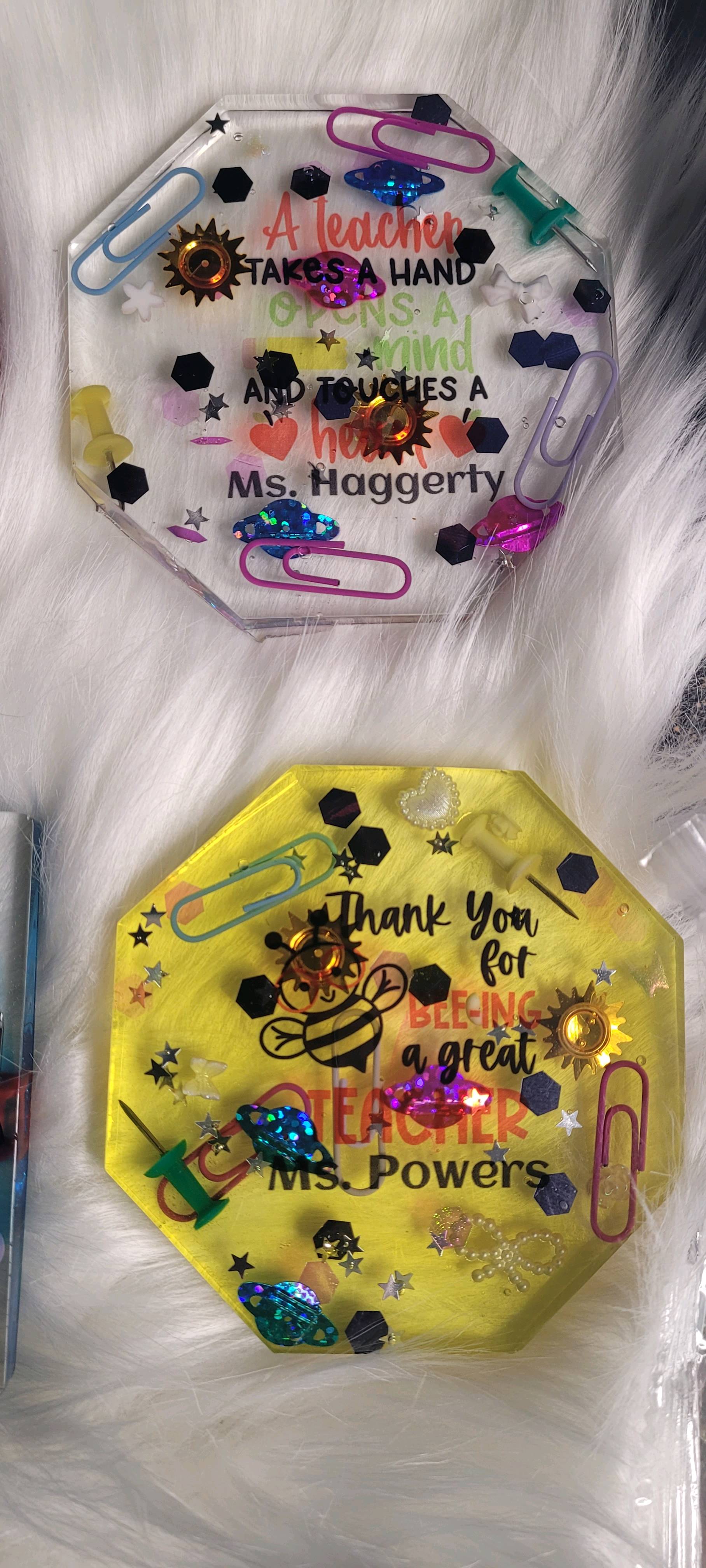 I made my very first resin coaster set, and I wanted them to be something special for Teacher Appreciation Day. I started with the teacher-themed designs from IdeaStudio and personalized each one with the teachers’ names. Before pouring any resin, I printed the designs onto HTVRONT sublimation stickers and pressed them at 335°F for 60 seconds with medium pressure with my auto heat press 2. They came out so clear and vibrant — the colors really popped.