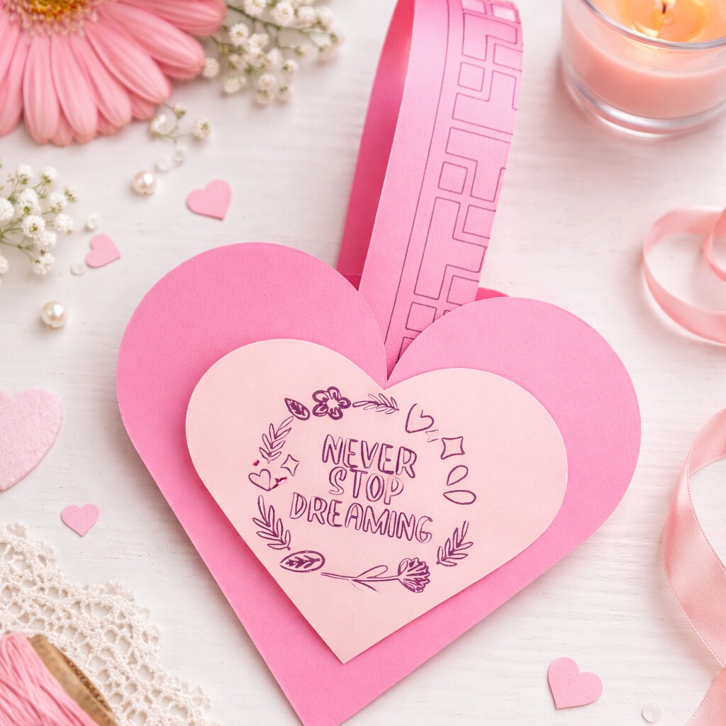A sweet little layered heart gift card holder made in soft pink tones, featuring a hand-drawn floral design and the uplifting message “Never Stop Dreaming.” Delicate, charming, and full of heart — the perfect tiny keepsake to make any gift feel extra special
