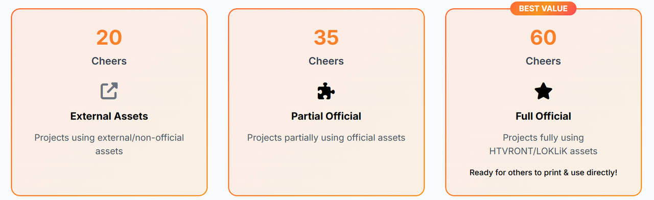 (Projects with full official assets earn the most because theyâre ready for others to print & use directly!)