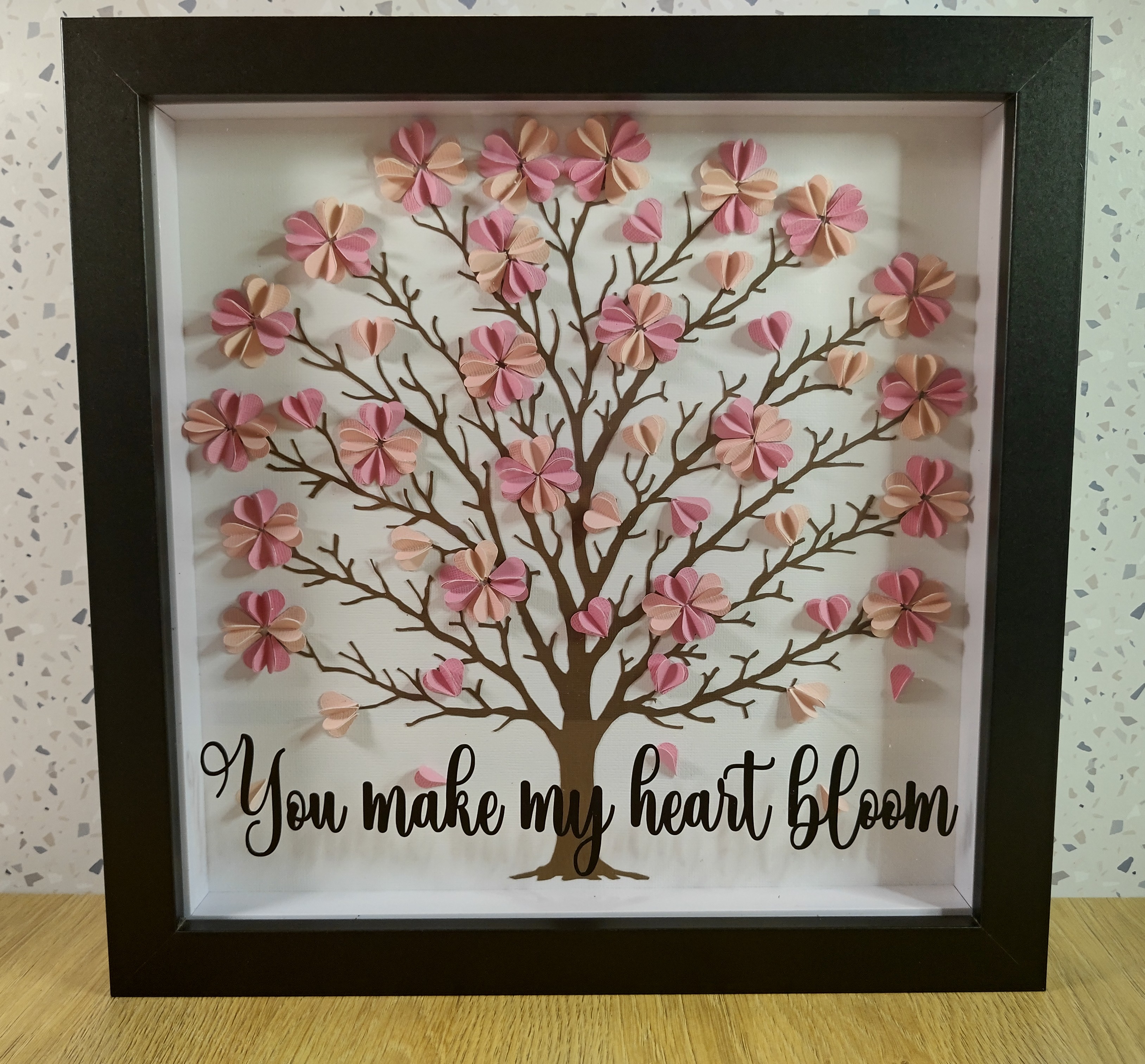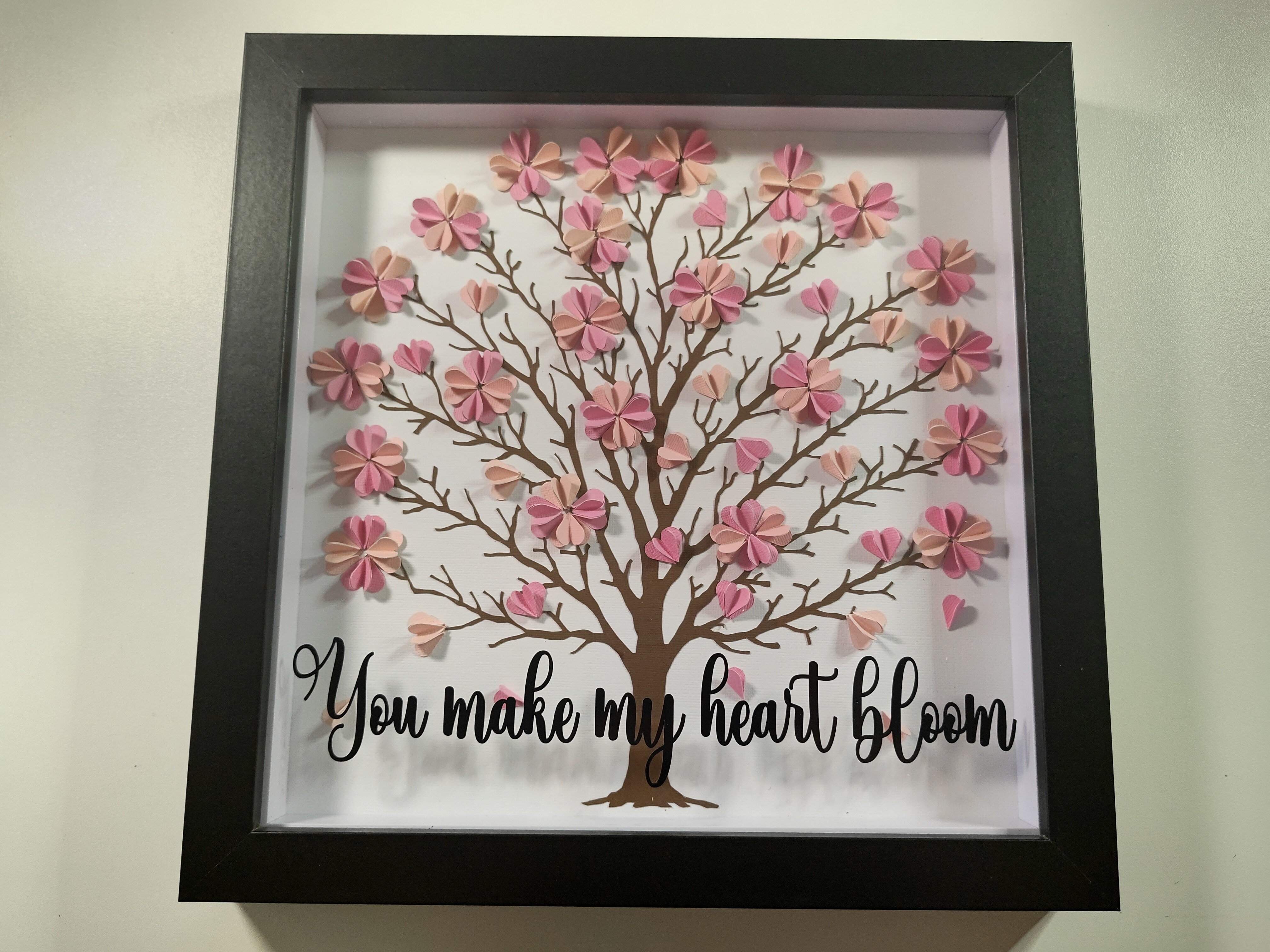 Inside the shadow box, delicate paper blossoms made from soft hearts gather on the branches, creating a gentle, romantic scene. The layered design gives the tree a sense of depth and quiet movement, almost like petals drifting in a spring breeze. And the phrase “You make my heart bloom” ties the entire piece together with a message that feels tender, timeless, and full of emotion.
