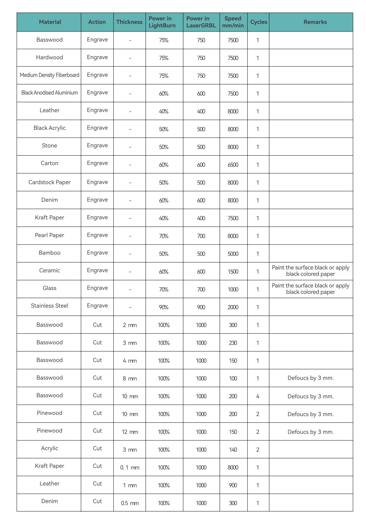 Until you get the official quick reference guide, I strongly recommend running small test grids on scrap material. Create a simple square pattern and vary speed and power in small increments. This helps you visually see what works best for your specific machine and material batch, since even the same material can vary slightly. I find it helpful to remember that not all machines and not all materials are equal, there will always be slight variations.