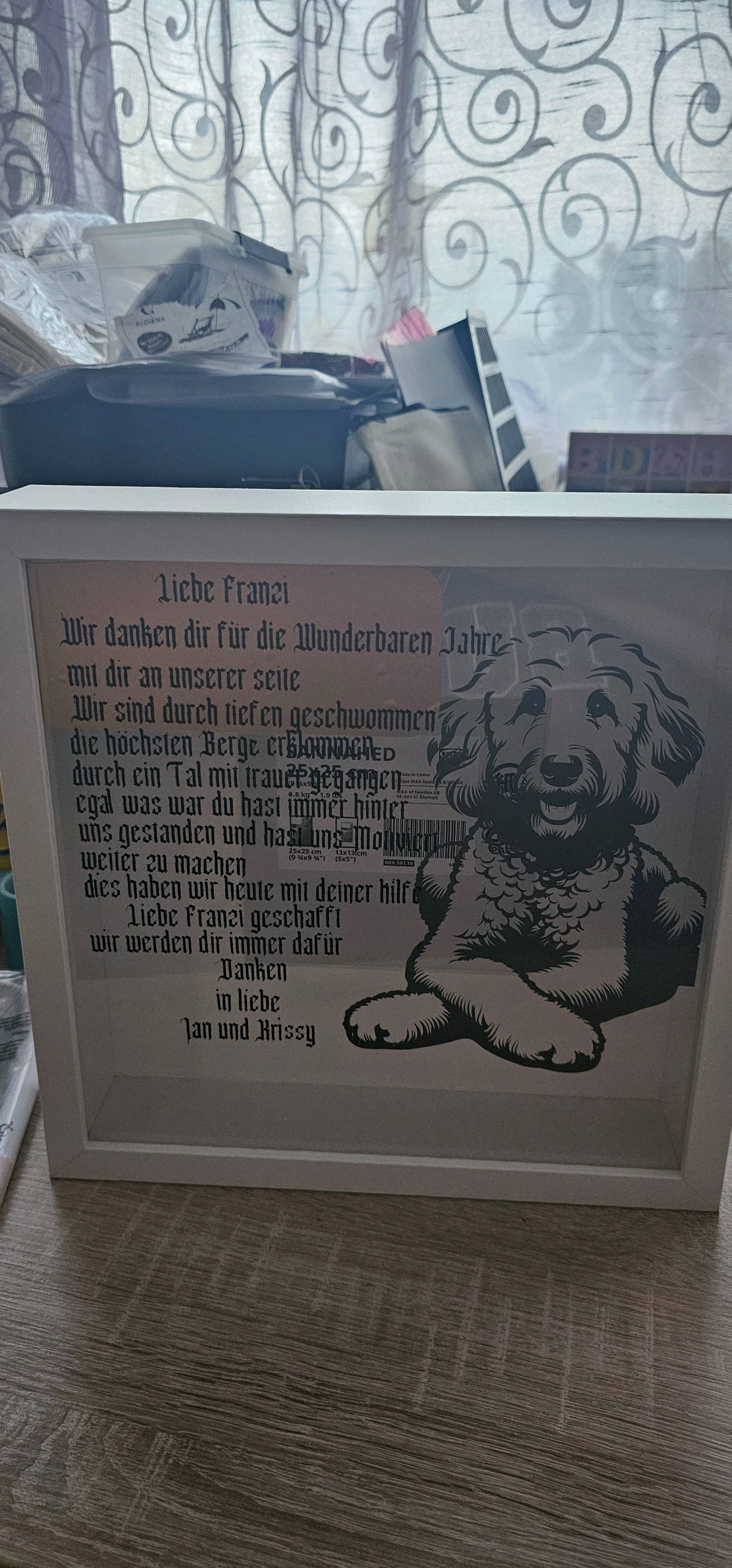einen bilderrahmen beplottet mit einem süssen hund und einem schriftzug als danke schön text selbst geschrieben von mir .