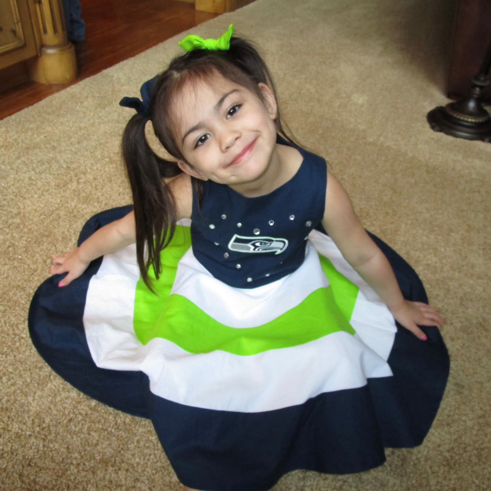 One of my proudest creations for my daughter is her custom 2017 Seahawks dress—a true labor of love. I designed and sewed it myself, carefully choosing the color scheme and placing the embroidered logo just right. To finish it off, I added “Seahawks” embroidered all around the bottom hem (though that detail didn’t make it into the original photo!).